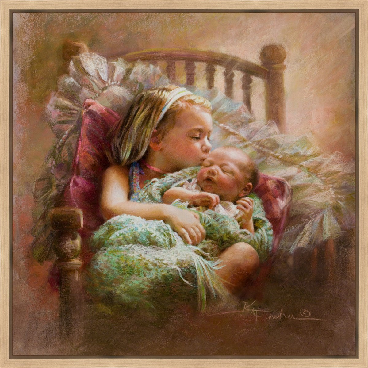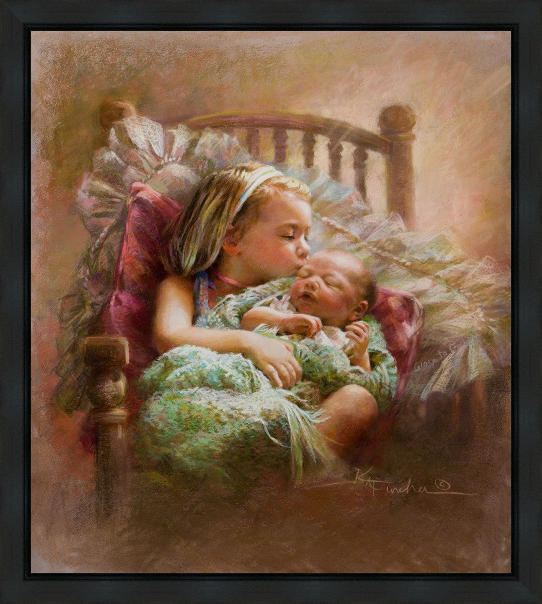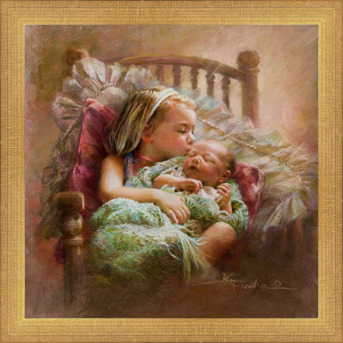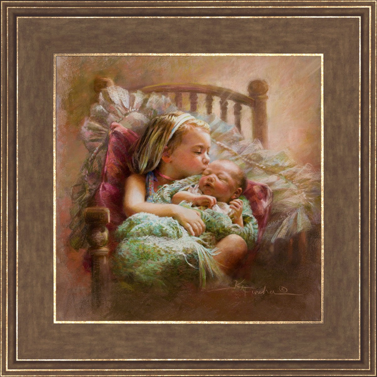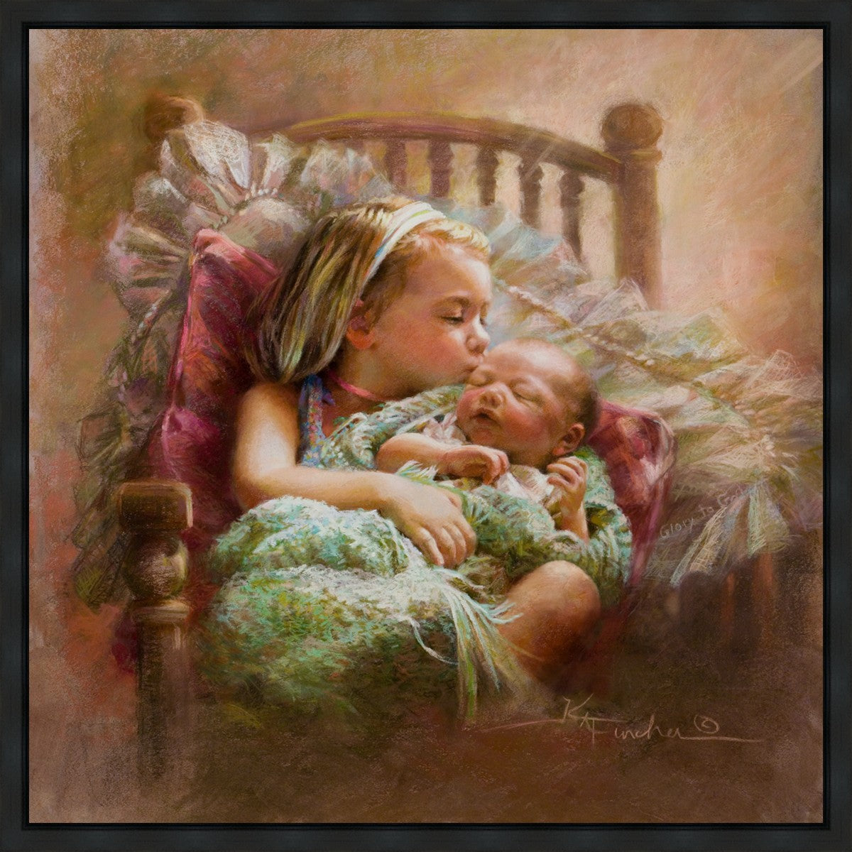 In Fresh from Heaven, an important part of this story lies on the floor, just beyond the painting’s frame. A doll that was once new, now worn from love, is tossed aside at the invitation to hold a living, breathing baby. Mom has prepared the generations-old rocking chair for the introduction. After securing pillows to support and cradle the baby, Mom positions her inquisitive child and places a sleeping baby in her open arms. And … the long-awaited union begins with a kiss.