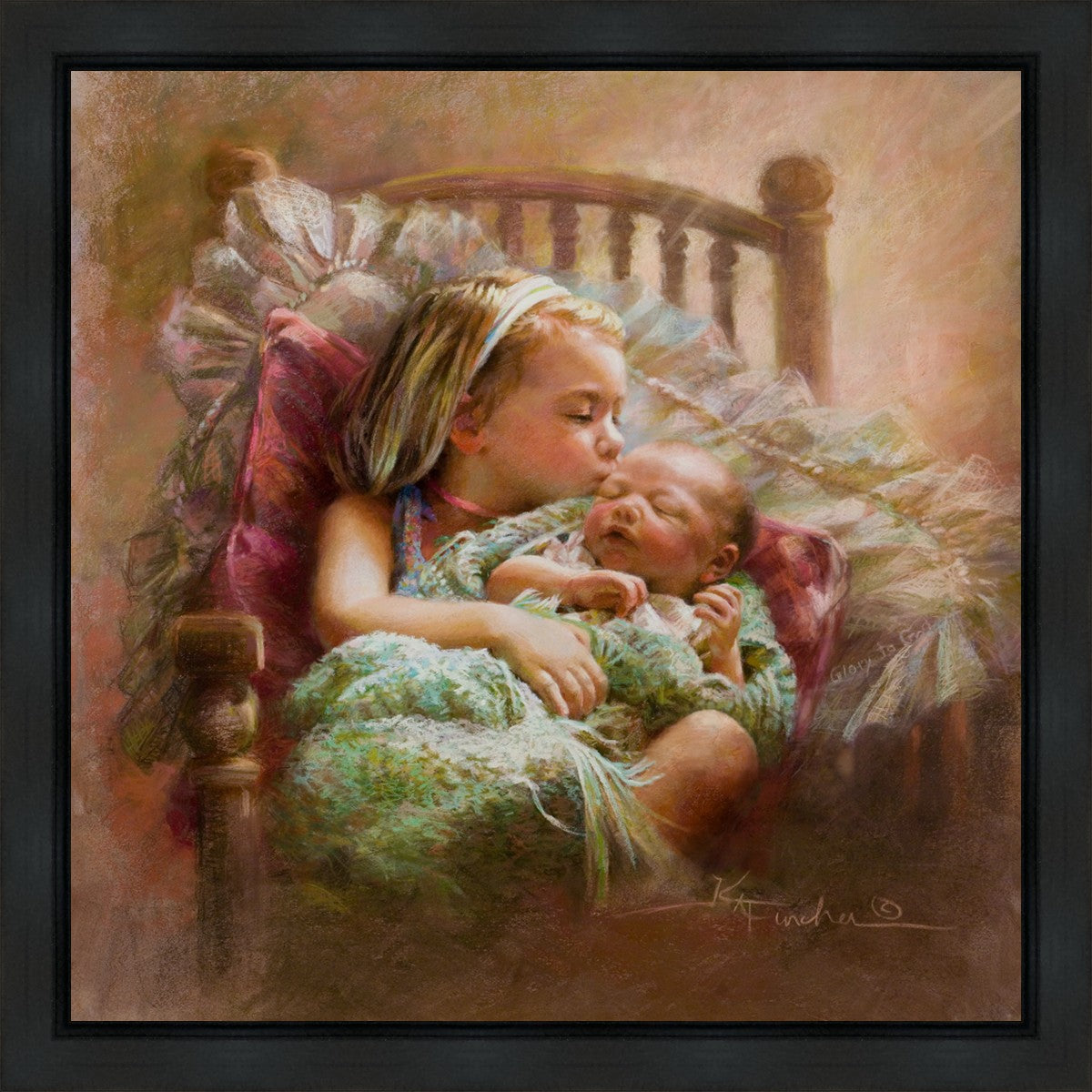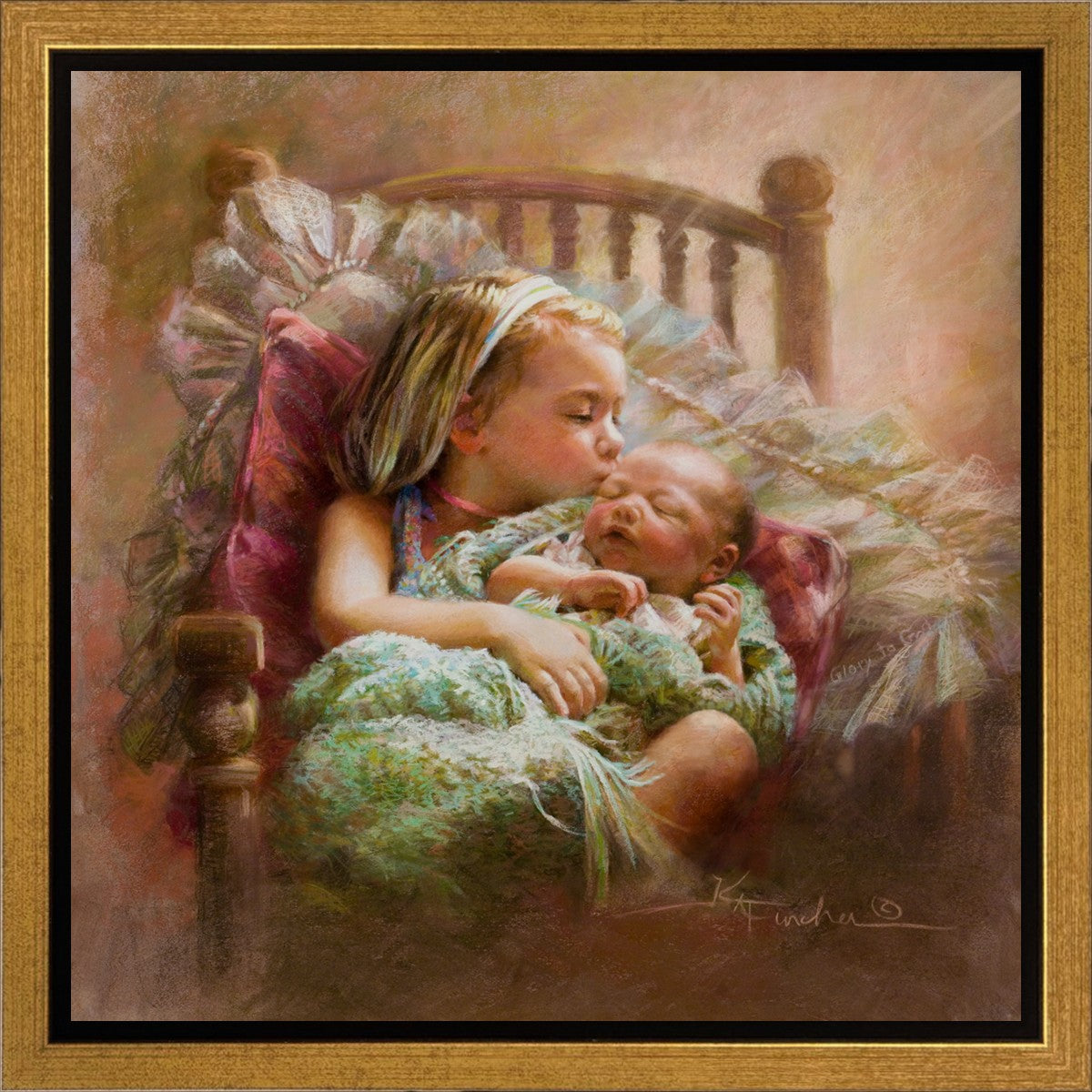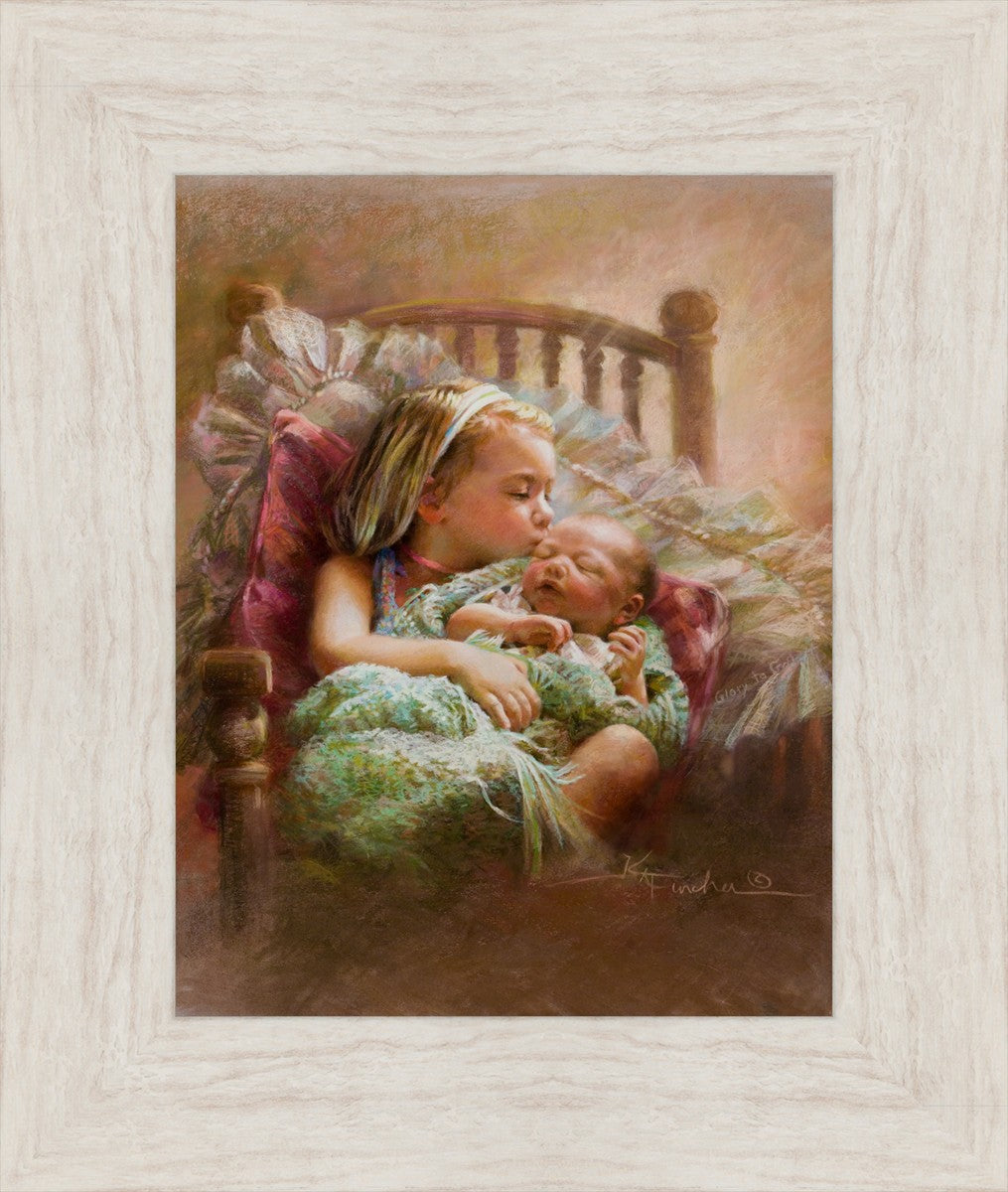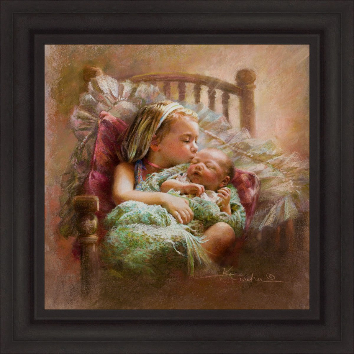 In Fresh from Heaven, an important part of this story lies on the floor, just beyond the painting’s frame. A doll that was once new, now worn from love, is tossed aside at the invitation to hold a living, breathing baby. Mom has prepared the generations-old rocking chair for the introduction. After securing pillows to support and cradle the baby, Mom positions her inquisitive child and places a sleeping baby in her open arms. And … the long-awaited union begins with a kiss.