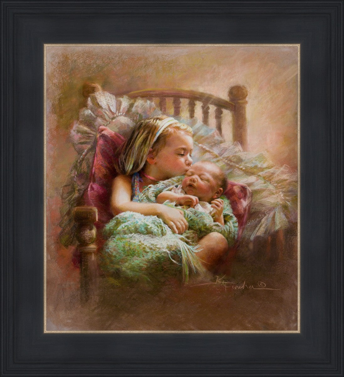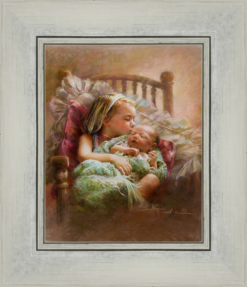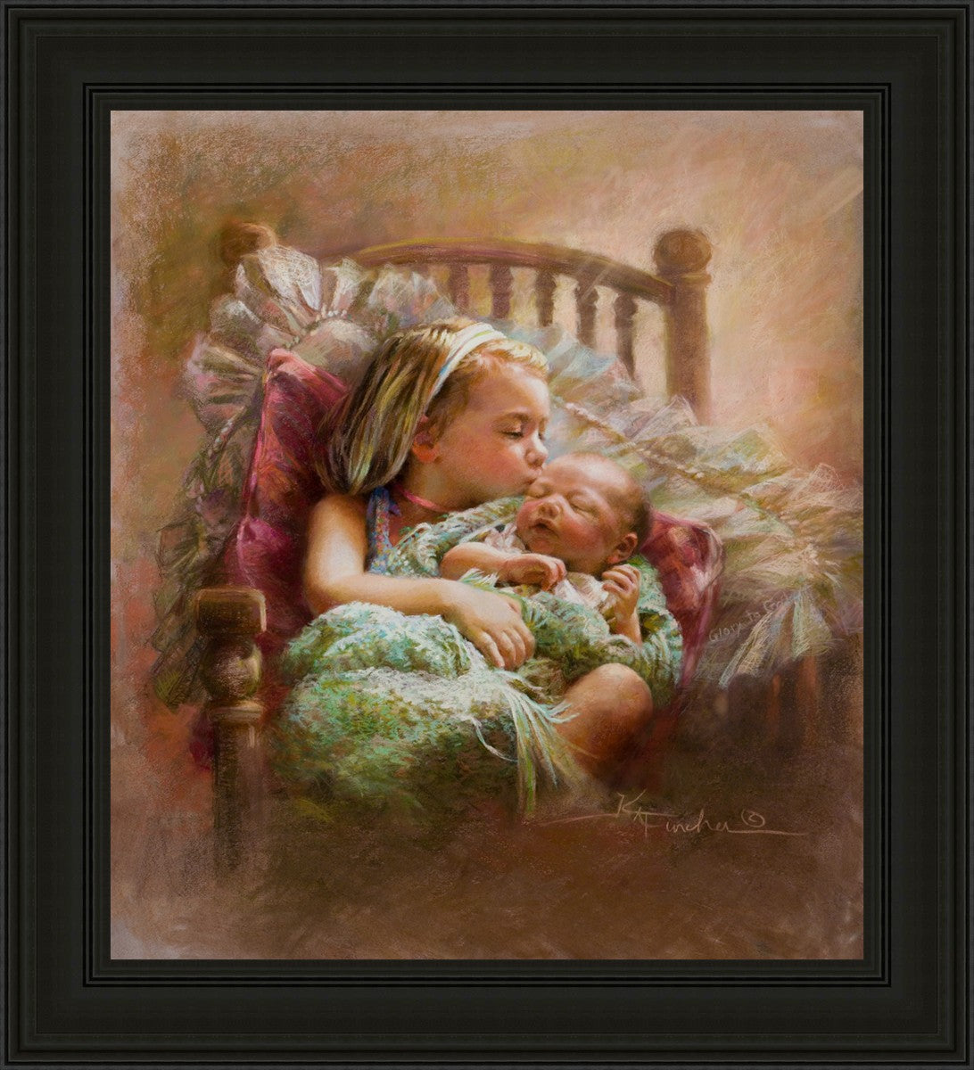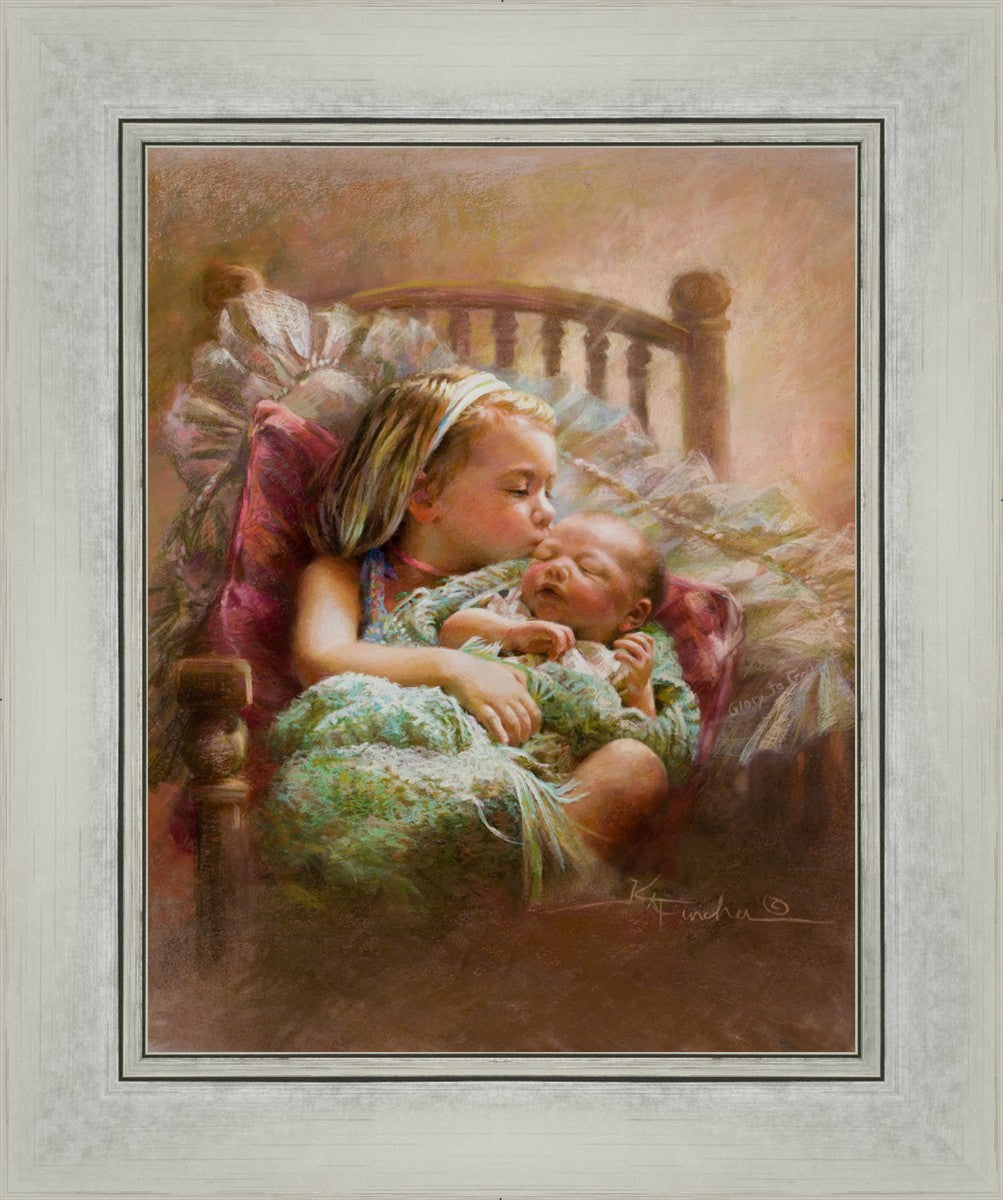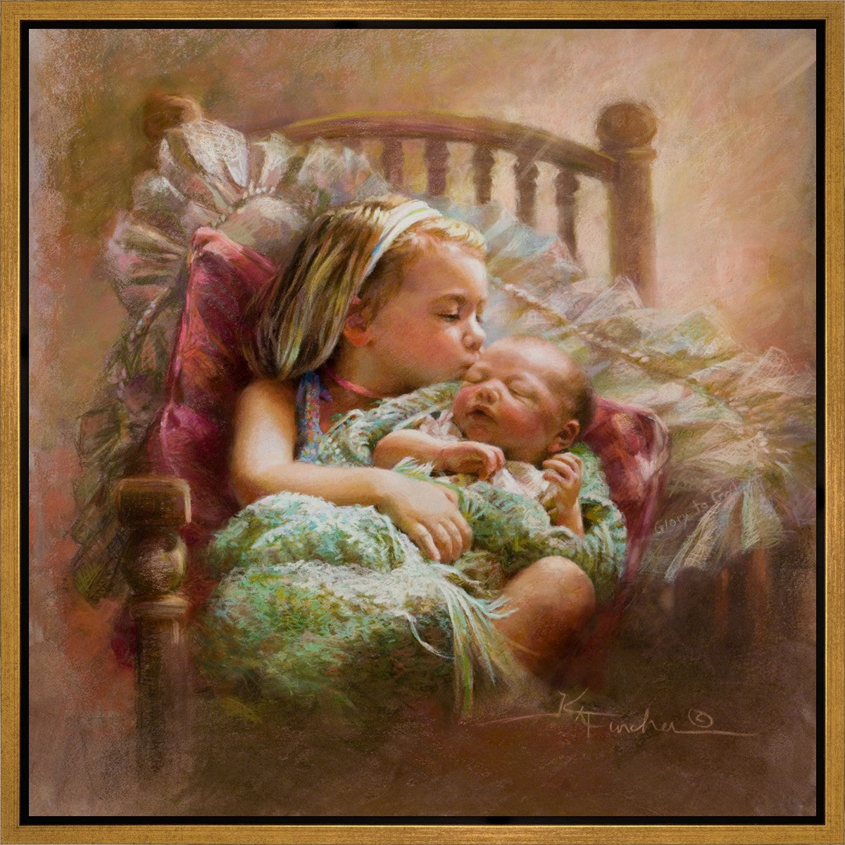 In Fresh from Heaven, an important part of this story lies on the floor, just beyond the painting’s frame. A doll that was once new, now worn from love, is tossed aside at the invitation to hold a living, breathing baby. Mom has prepared the generations-old rocking chair for the introduction. After securing pillows to support and cradle the baby, Mom positions her inquisitive child and places a sleeping baby in her open arms. And … the long-awaited union begins with a kiss.