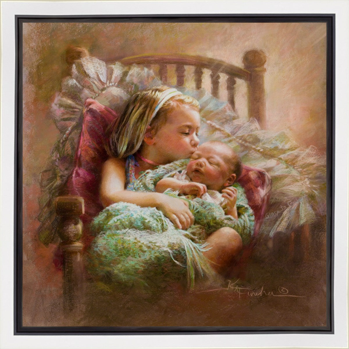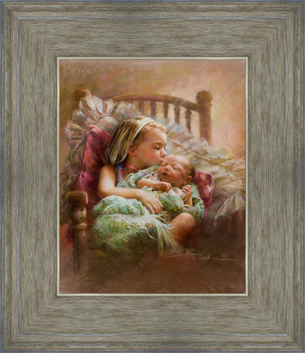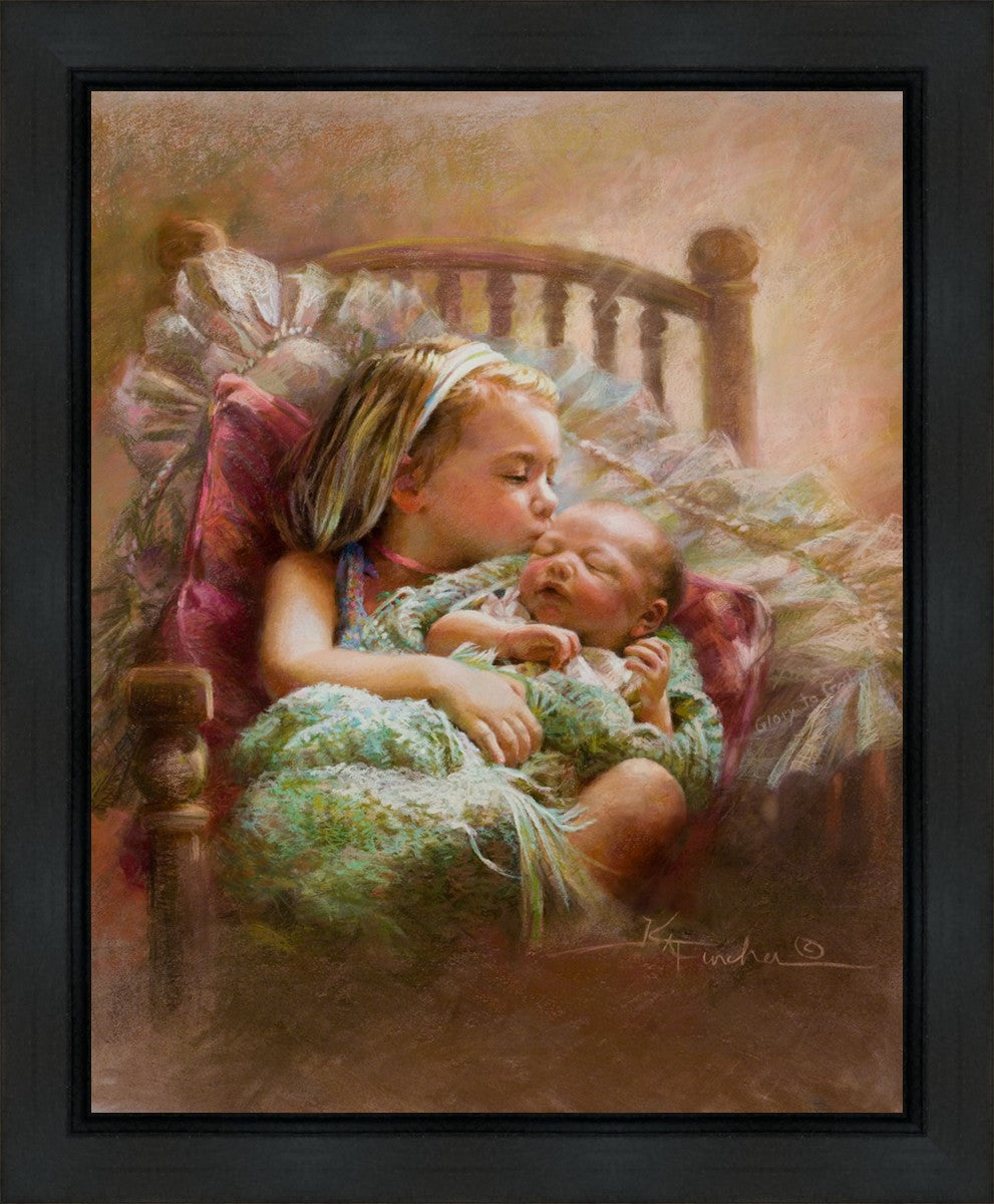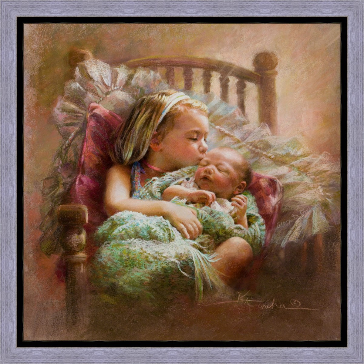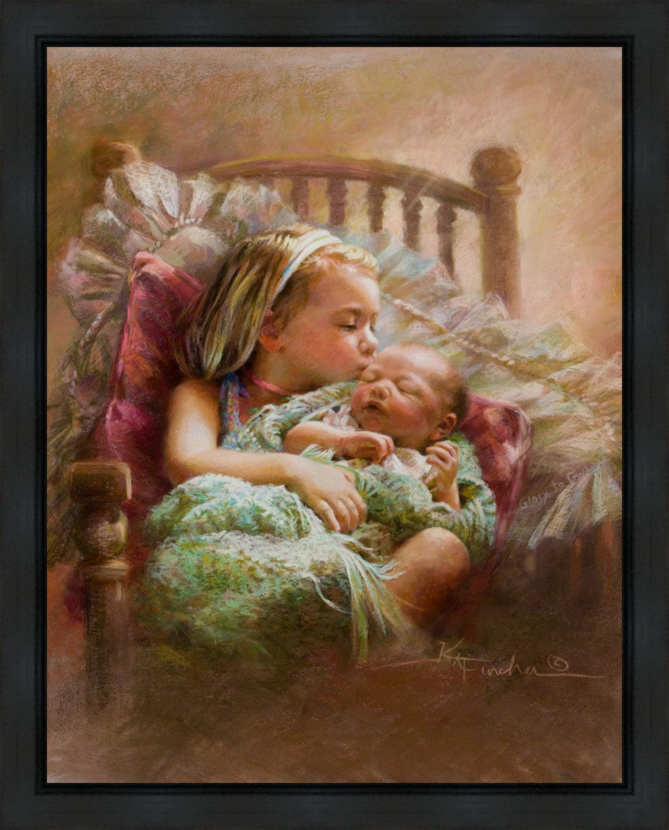In Fresh from Heaven, an important part of this story lies on the floor, just beyond the painting’s frame. A doll that was once new, now worn from love, is tossed aside at the invitation to hold a living, breathing baby. Mom has prepared the generations-old rocking chair for the introduction. After securing pillows to support and cradle the baby, Mom positions her inquisitive child and places a sleeping baby in her open arms. And … the long-awaited union begins with a kiss.