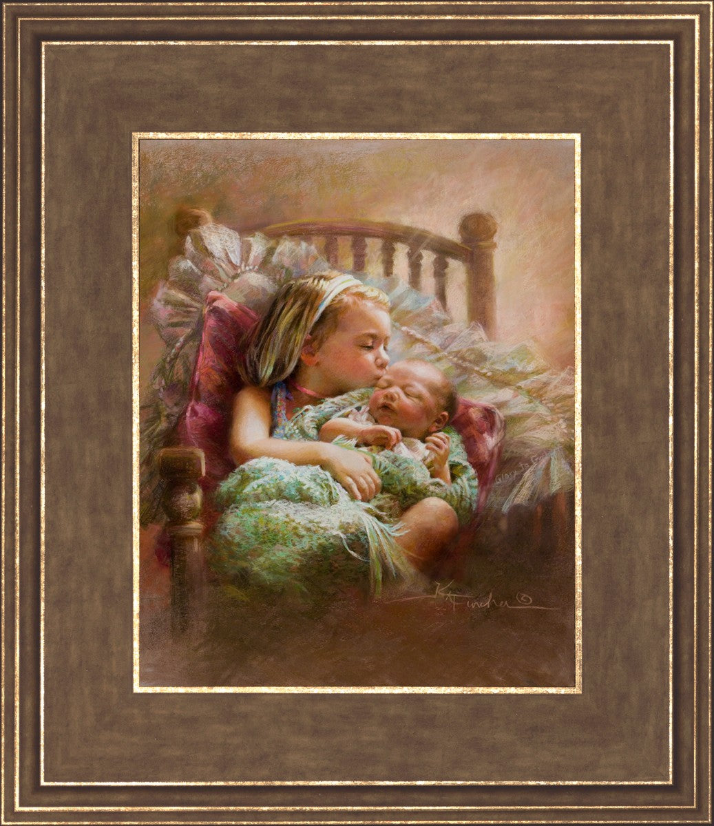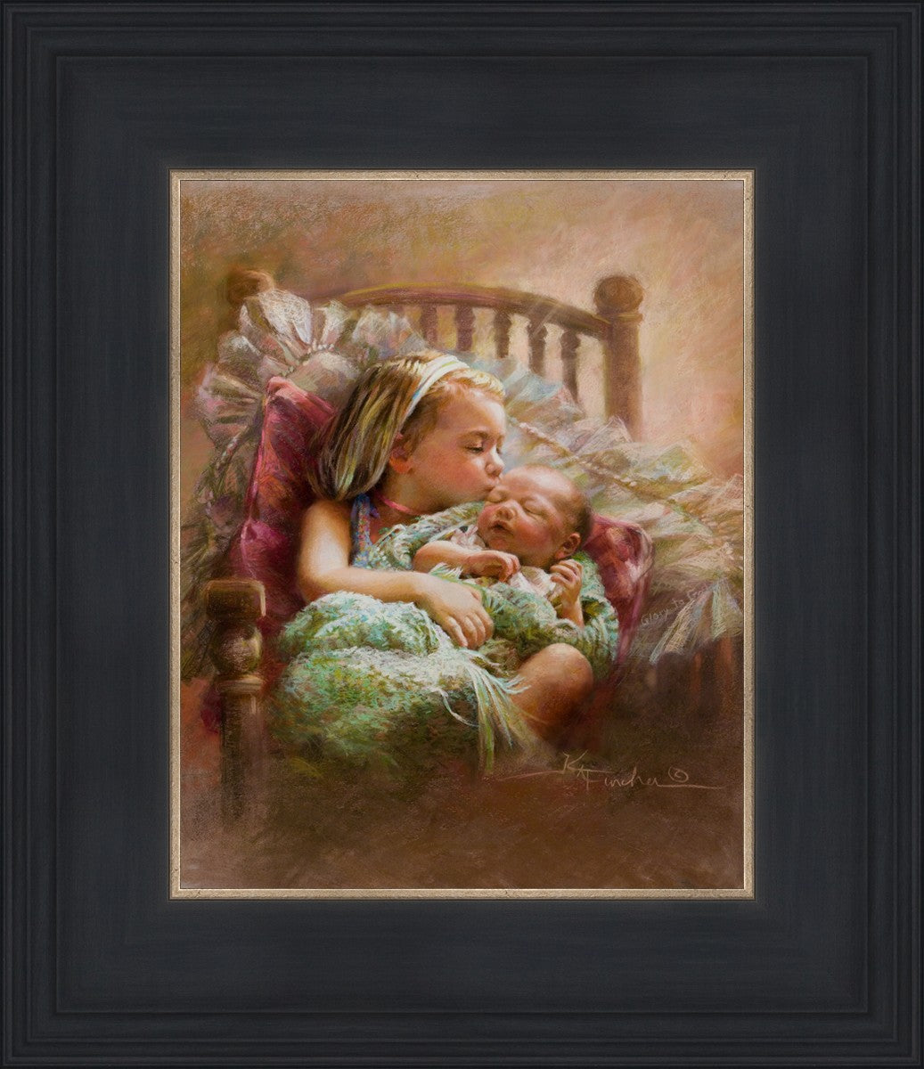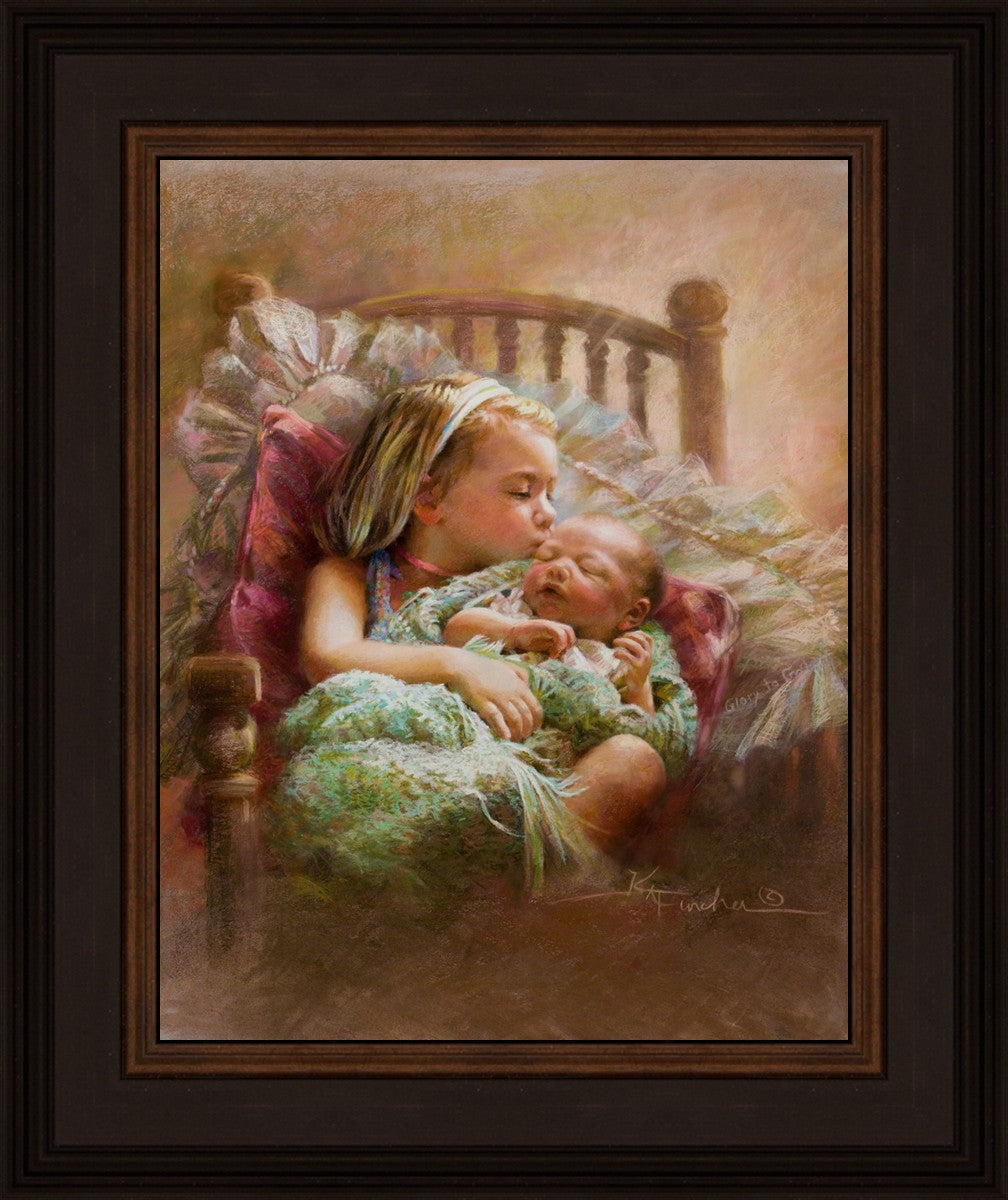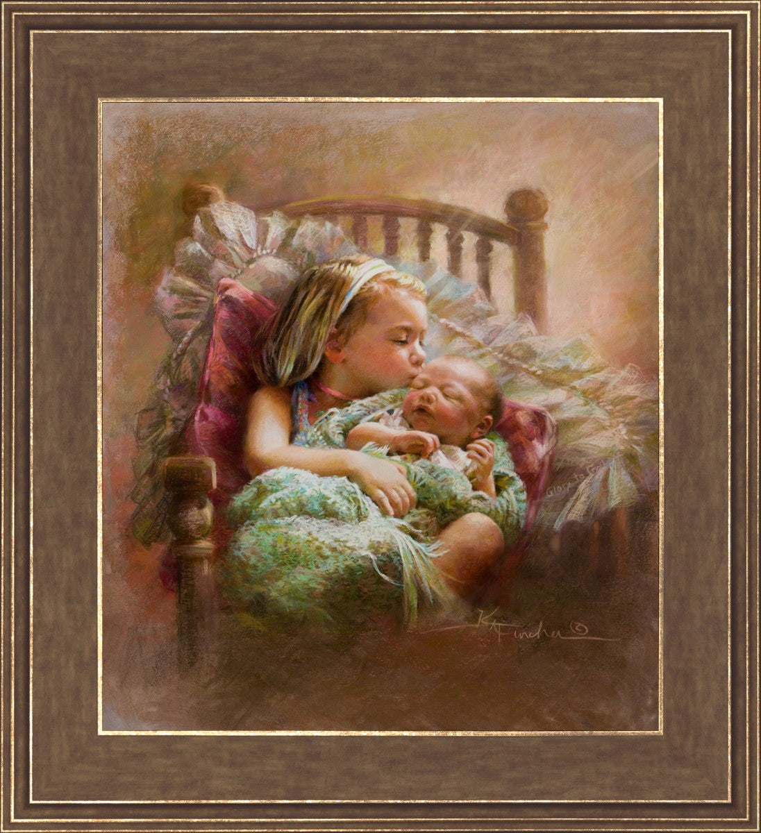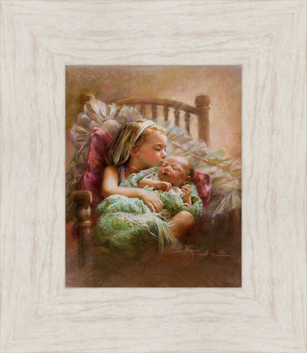 In Fresh from Heaven, an important part of this story lies on the floor, just beyond the painting’s frame. A doll that was once new, now worn from love, is tossed aside at the invitation to hold a living, breathing baby. Mom has prepared the generations-old rocking chair for the introduction. After securing pillows to support and cradle the baby, Mom positions her inquisitive child and places a sleeping baby in her open arms. And … the long-awaited union begins with a kiss.