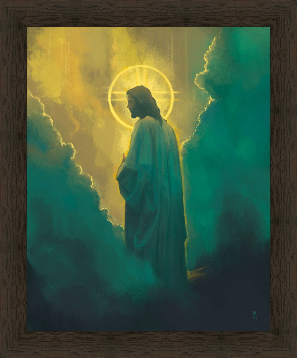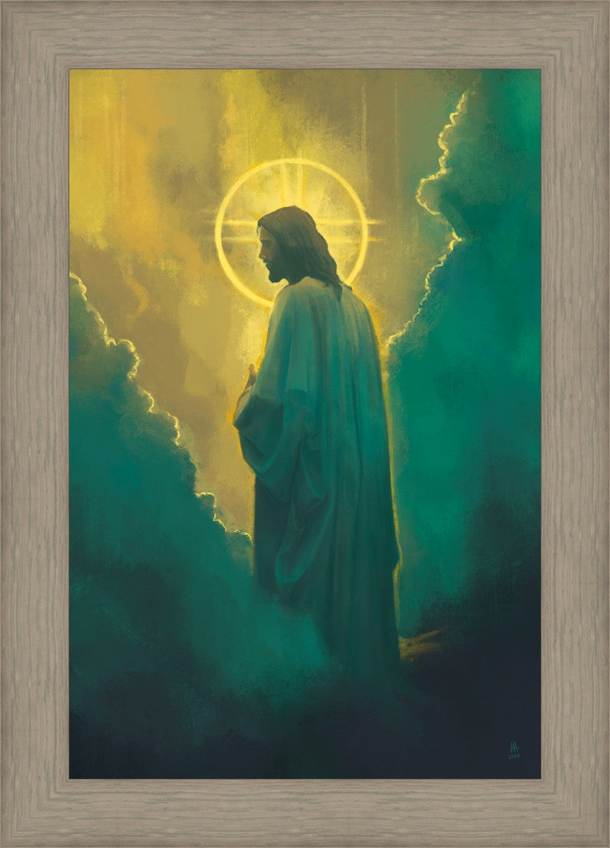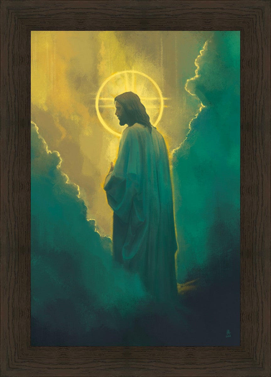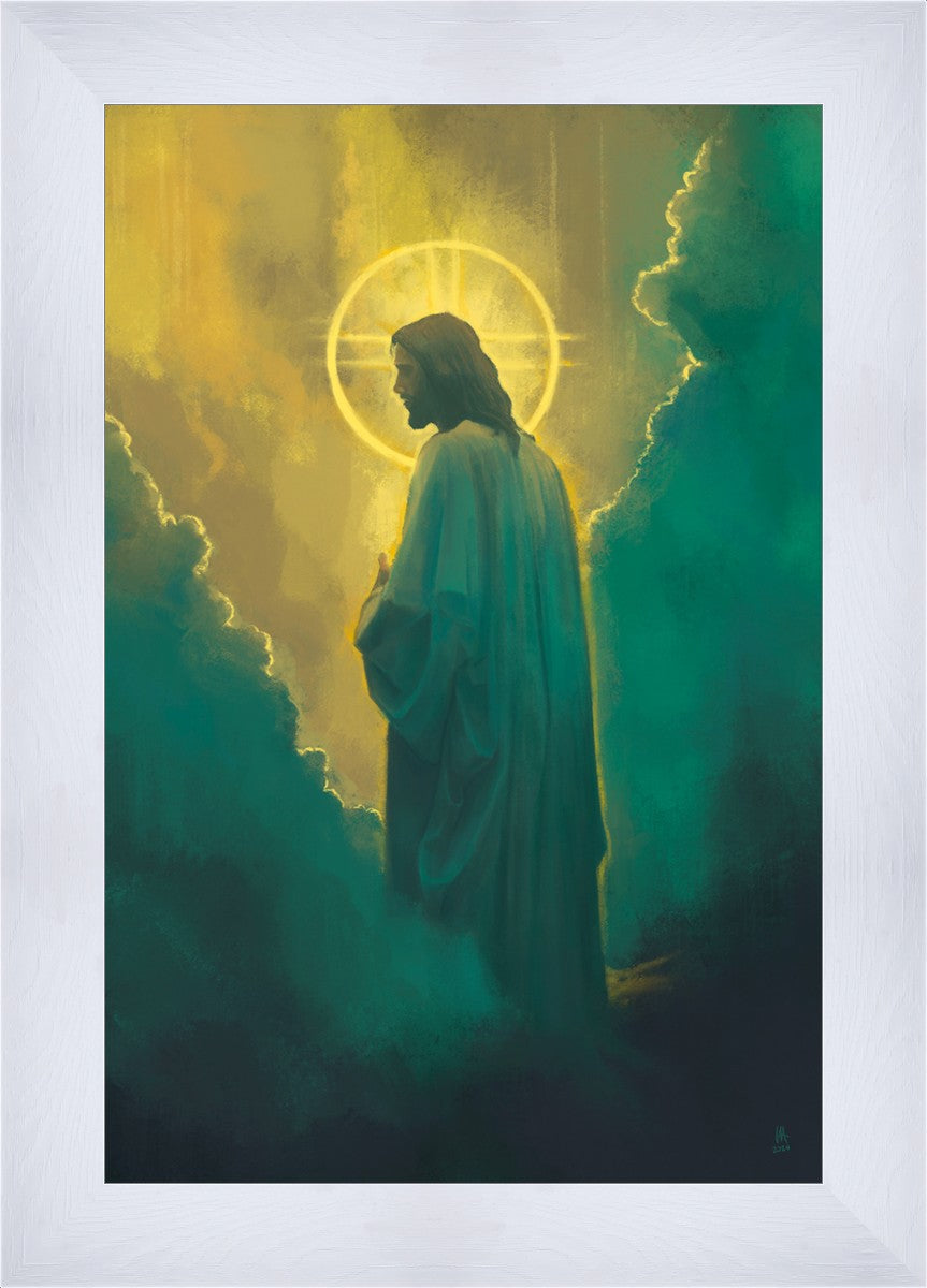 Jesus leads us on the path back to our Heavenly Father, bringing us from the darkness back into the light of God's presence. This image is meant to show Christ inviting us then leading us without cohesion. A halo, a symbol of divine crowning glory, encircles his head, a luminous aureole that emphasizes his sacred nature.