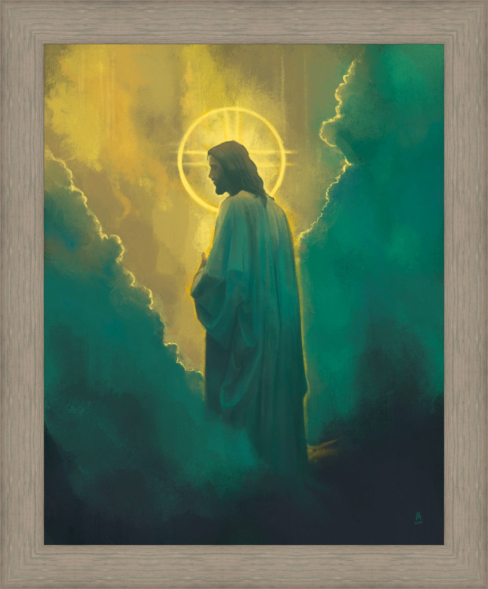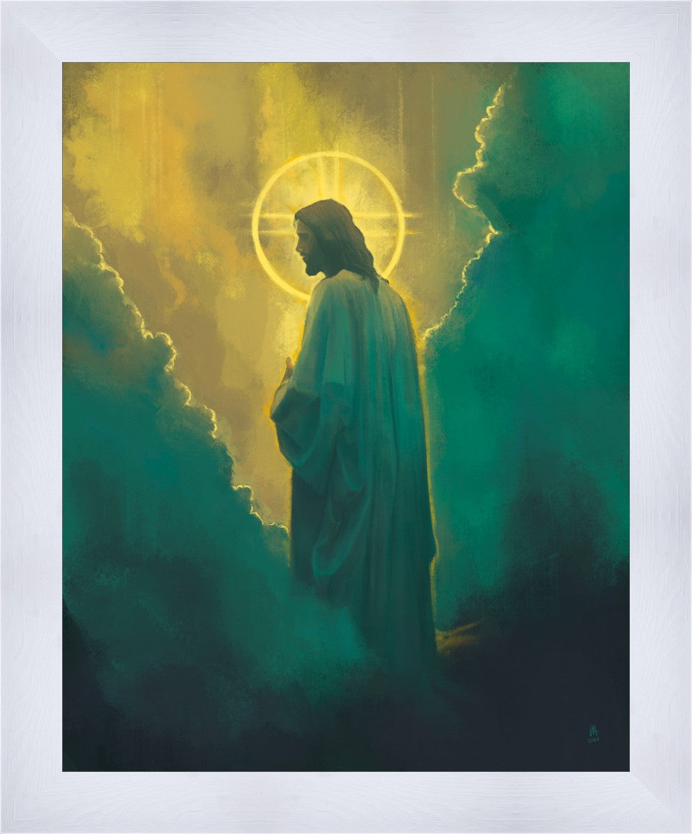 The clouds suggest the gentle and comforting nature of the divine. but also show that way the path and light is obscured without Christ to guide us. This painting offers a powerful and evocative portrayal of Jesus Christ, inviting viewers to contemplate the divine and its relationship to humanity.