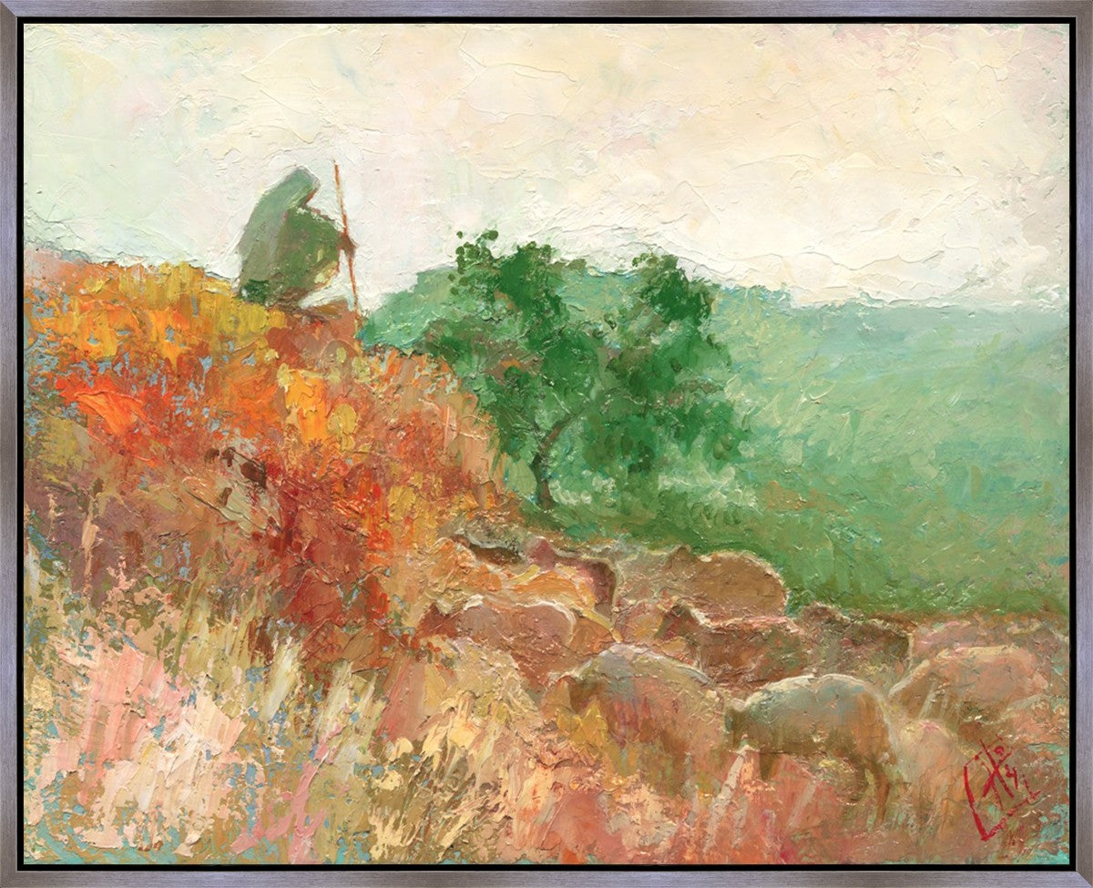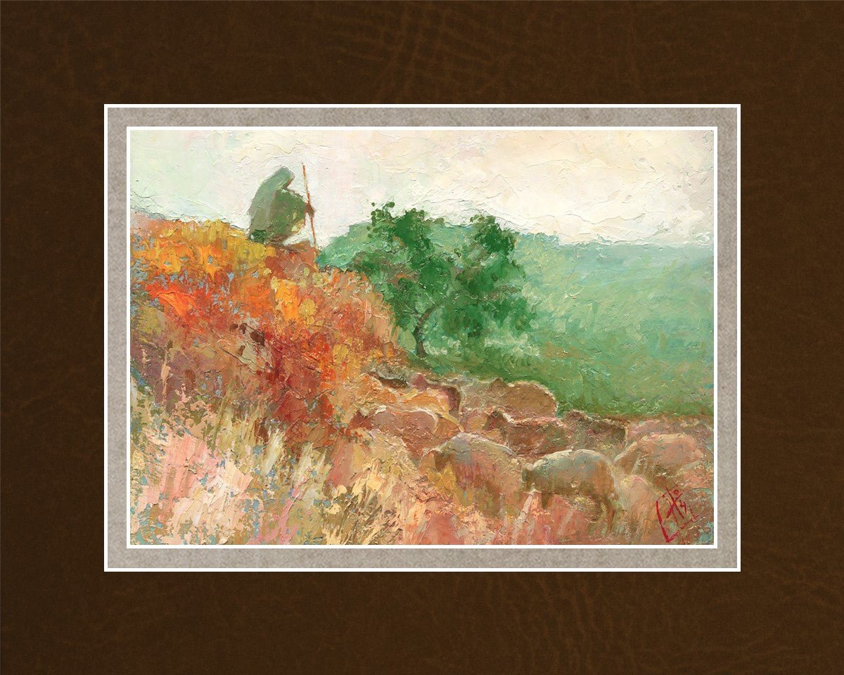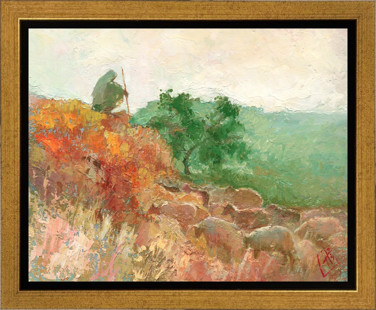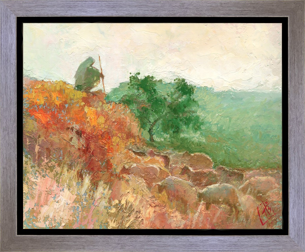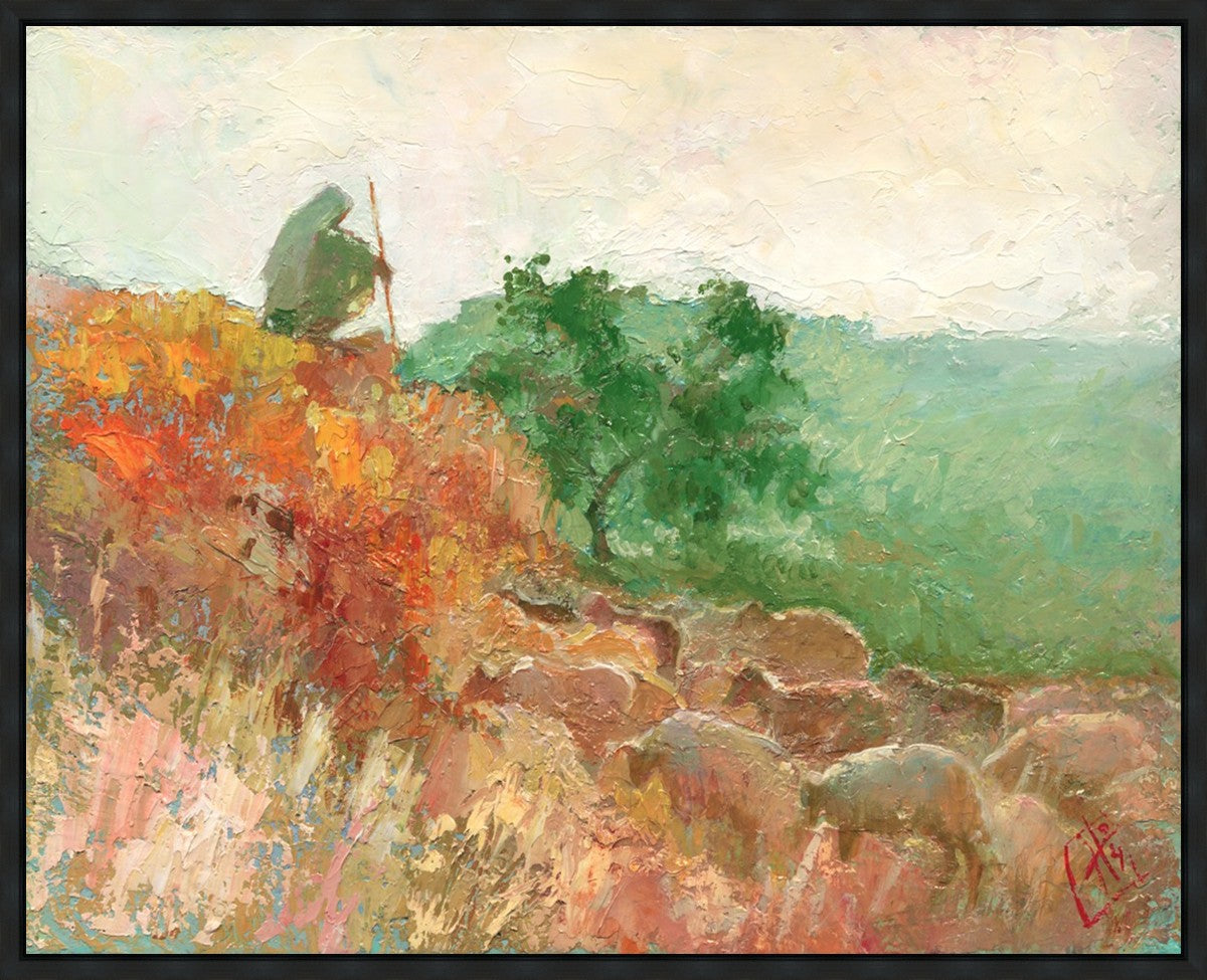 Inspired by Psalm 23:1-3, this painting depicts a solitary shepherd watching over his flock – a symbol of God’s guidance. This artwork invites us to contemplate the comforting words of Psalm 23: “The Lord is my shepherd, I shall not want. He maketh me to lie down in green pastures: he leadeth me beside the still waters. He restoreth my soul: he leadeth me in the paths of righteousness for his name’s sake”