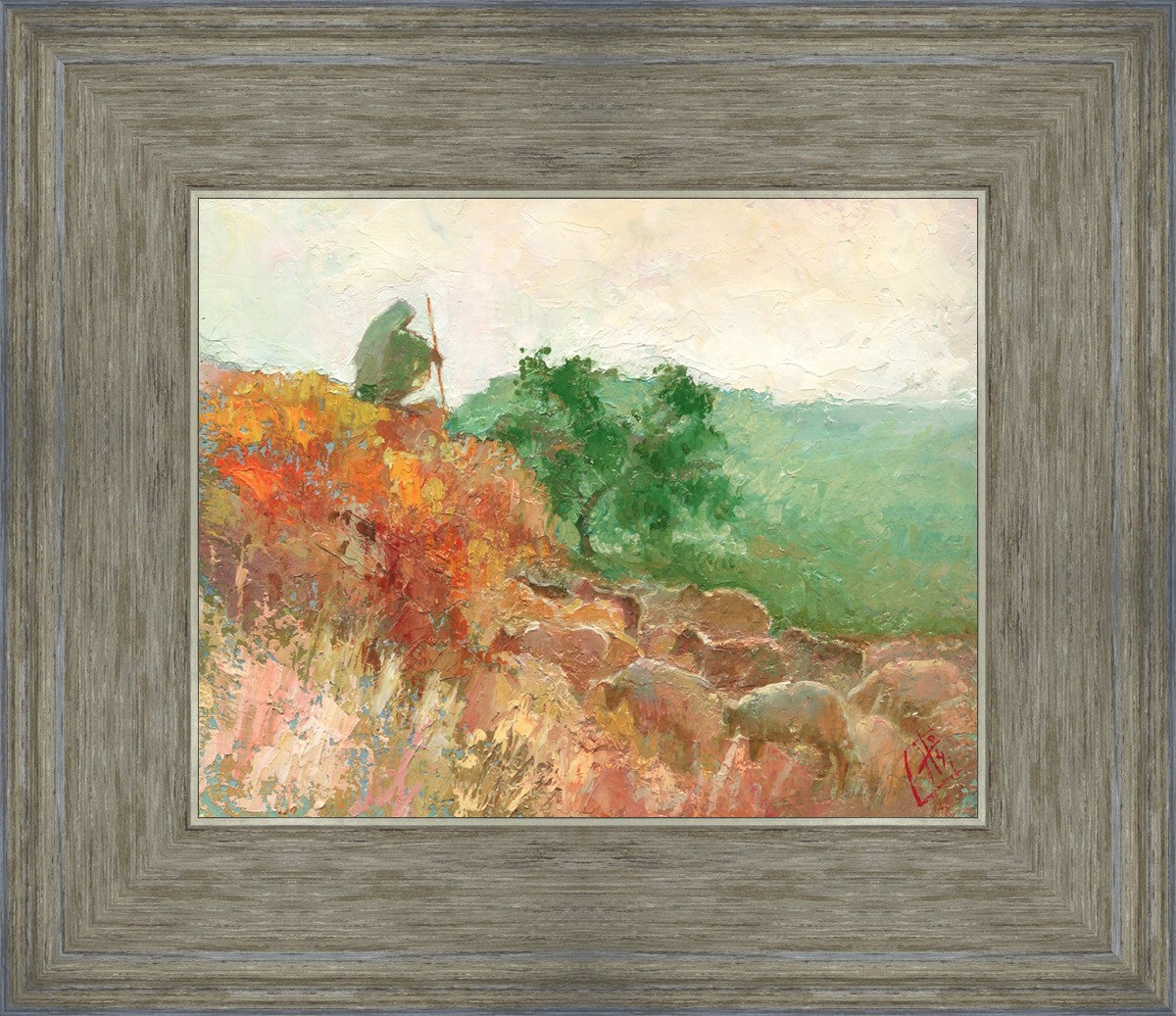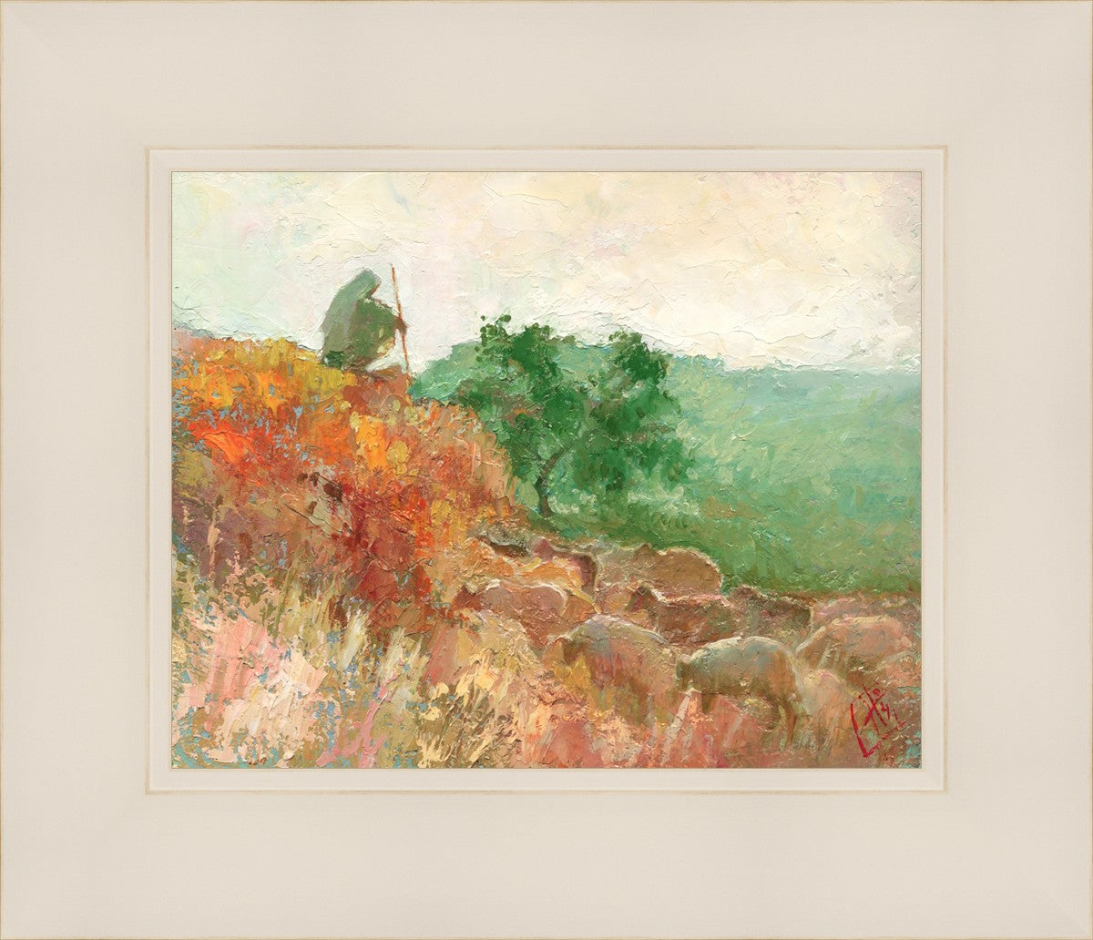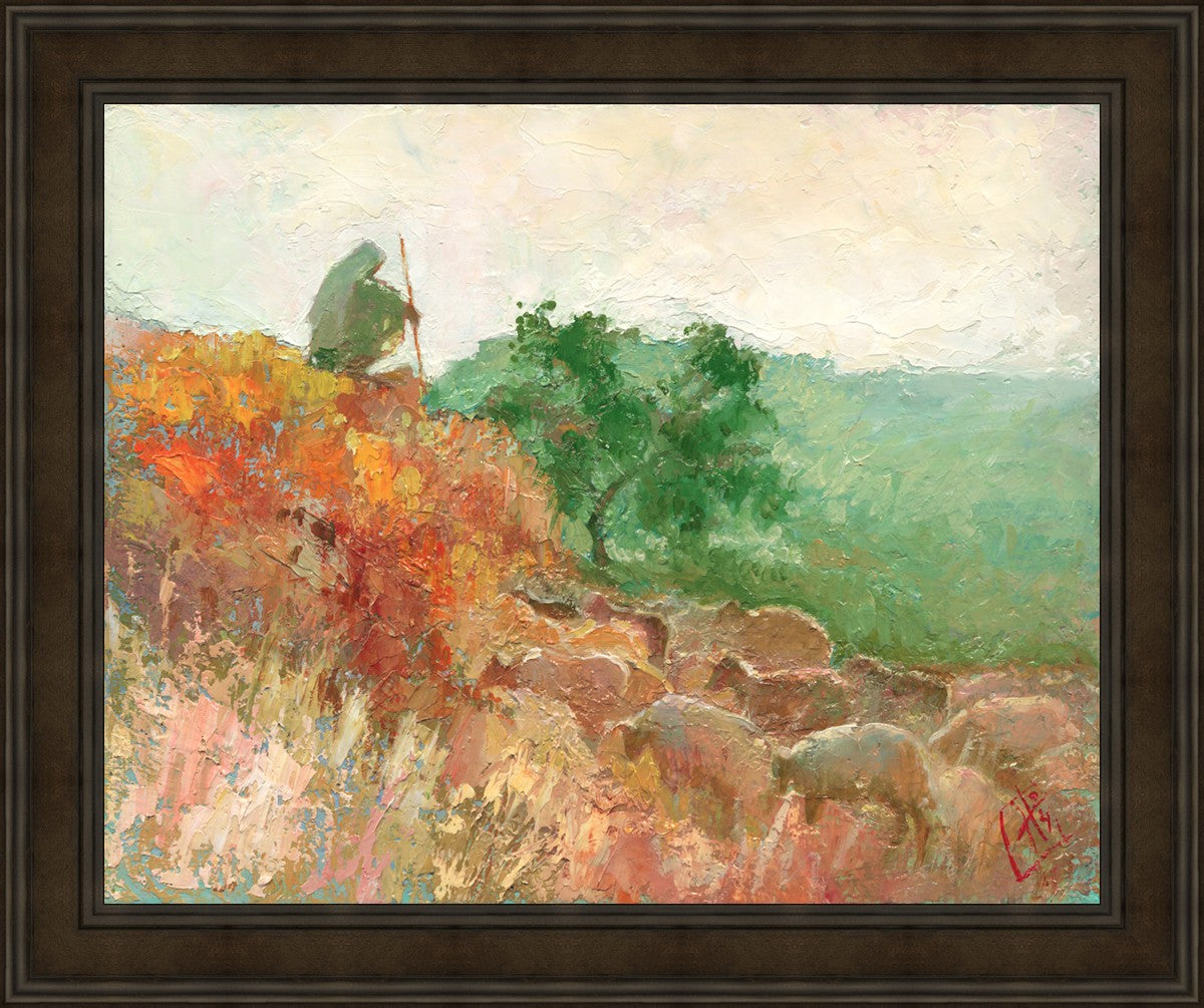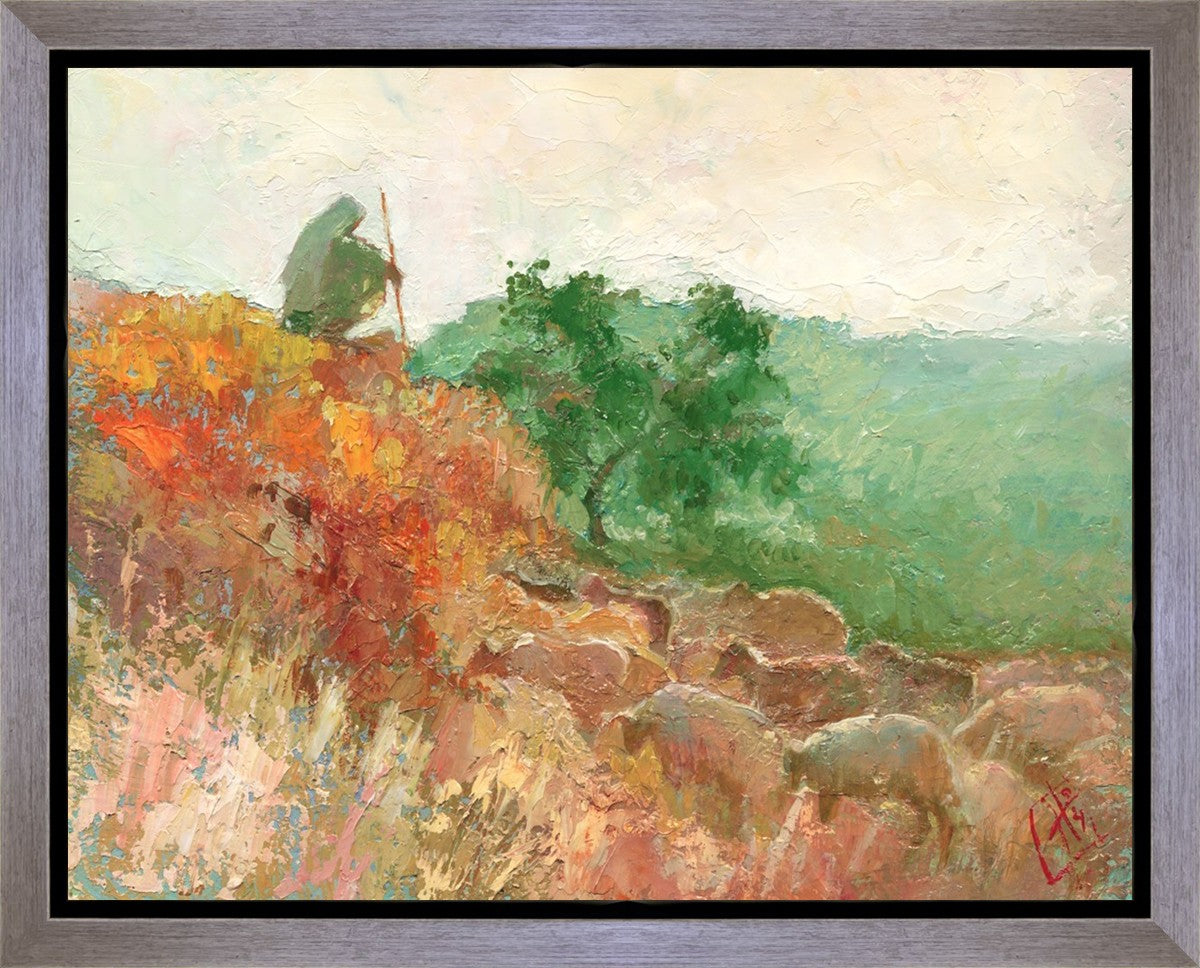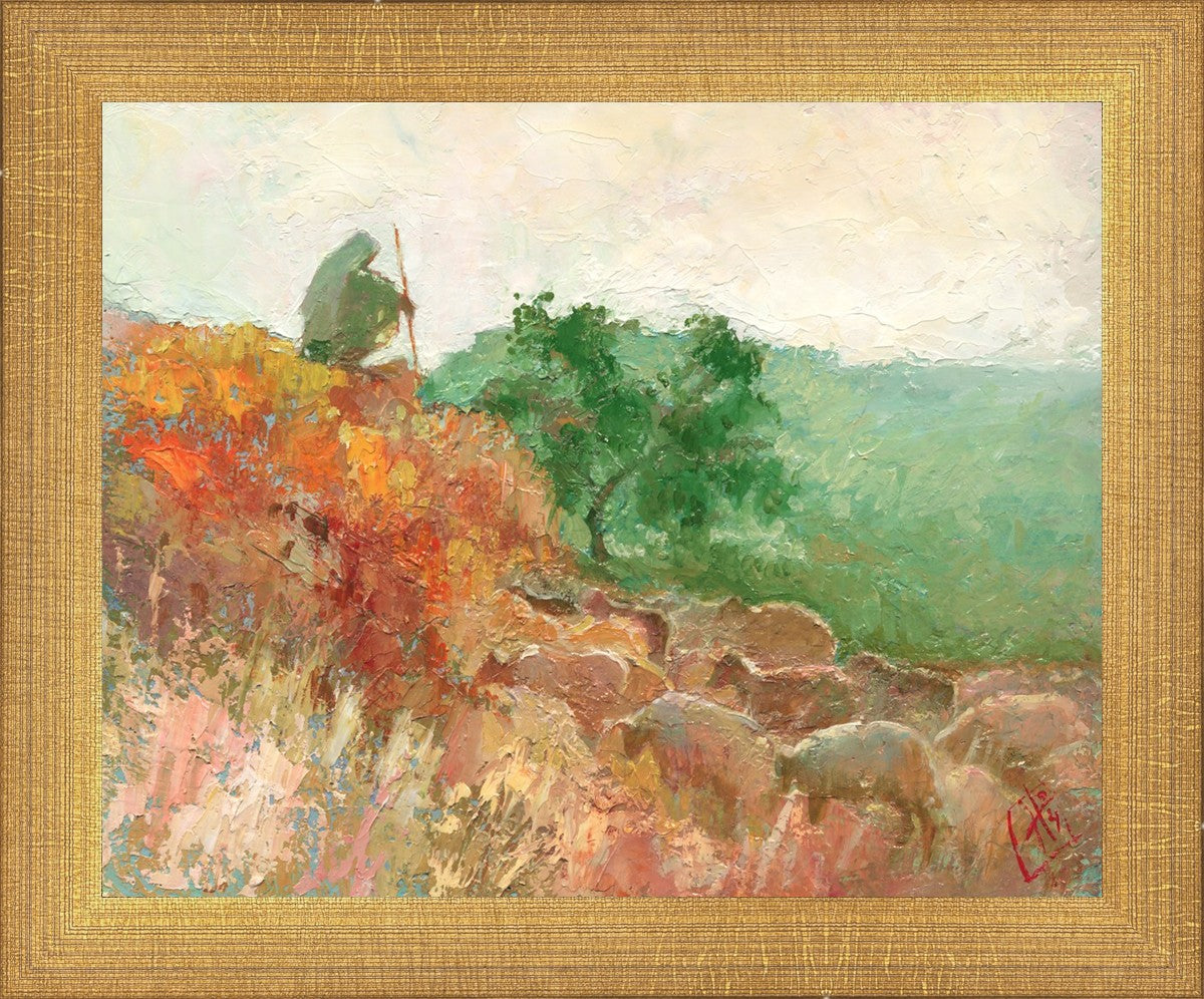 Inspired by Psalm 23:1-3, this painting depicts a solitary shepherd watching over his flock – a symbol of God’s guidance. This artwork invites us to contemplate the comforting words of Psalm 23: “The Lord is my shepherd, I shall not want. He maketh me to lie down in green pastures: he leadeth me beside the still waters. He restoreth my soul: he leadeth me in the paths of righteousness for his name’s sake”