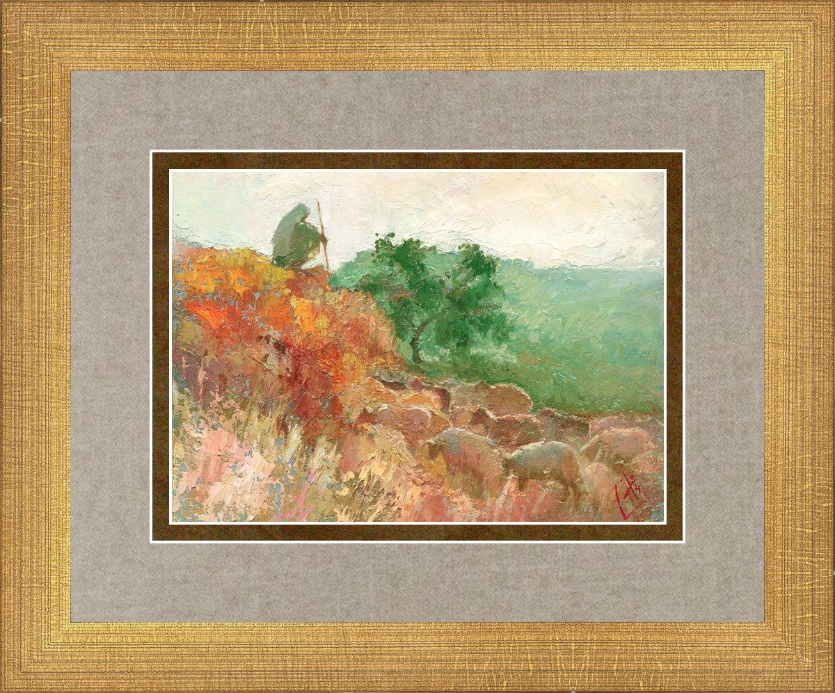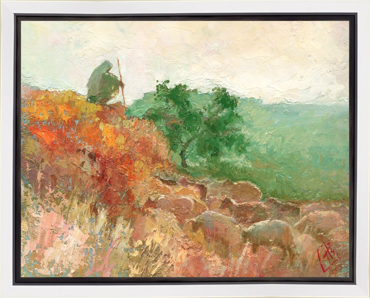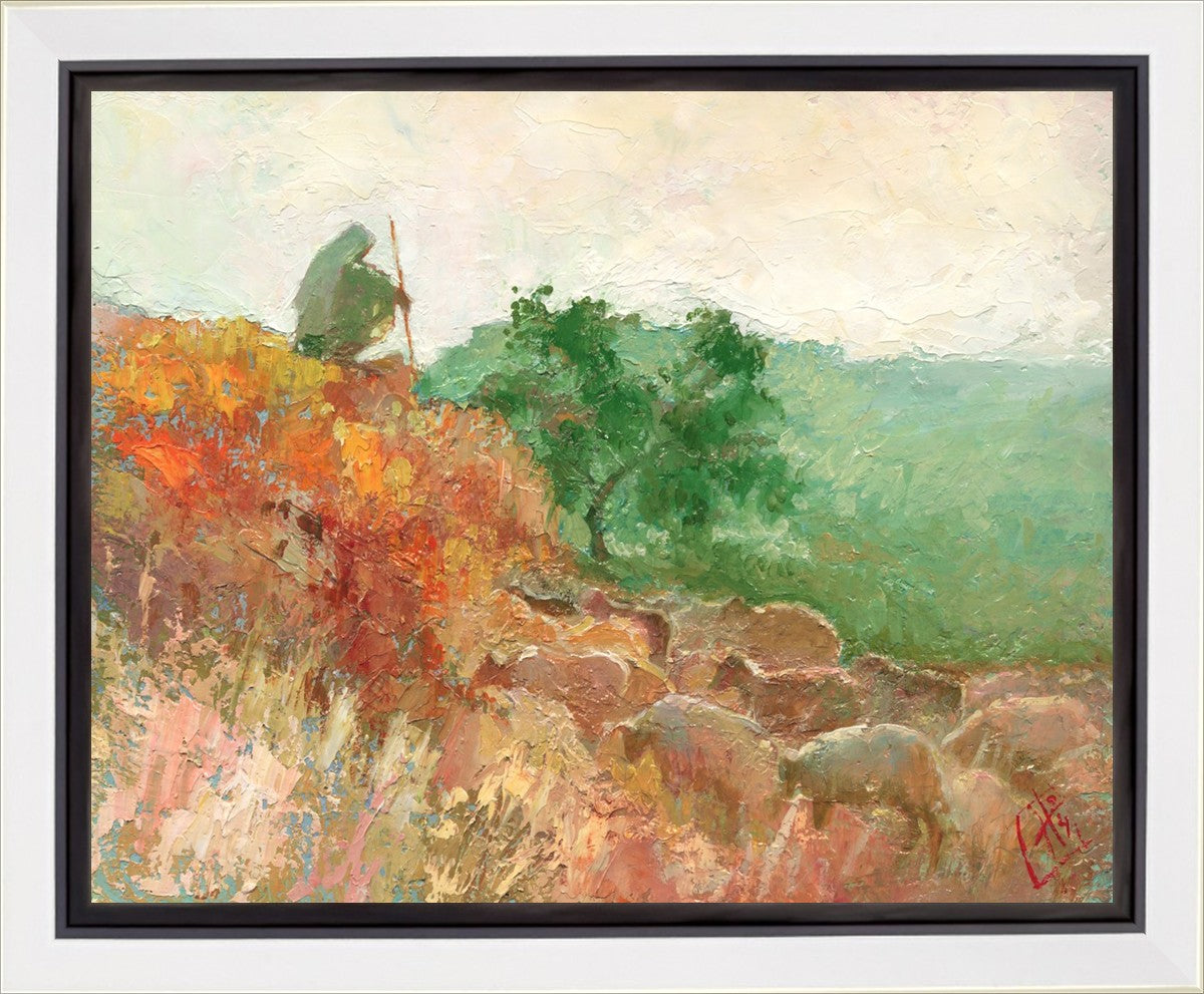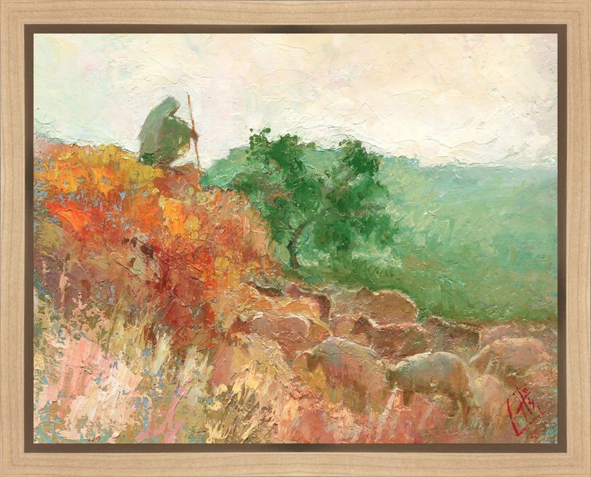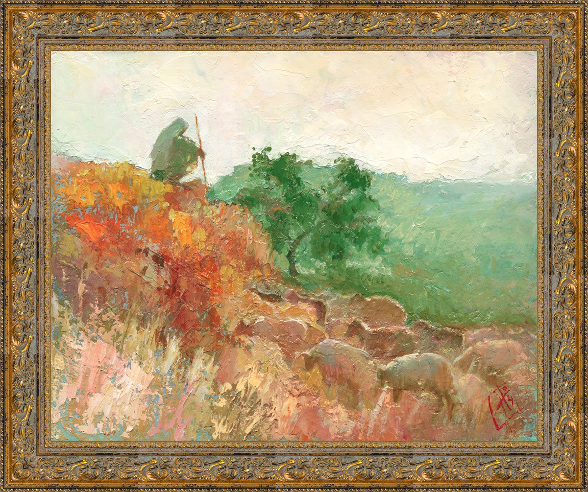 Inspired by Psalm 23:1-3, this painting depicts a solitary shepherd watching over his flock – a symbol of God’s guidance. This artwork invites us to contemplate the comforting words of Psalm 23: “The Lord is my shepherd, I shall not want. He maketh me to lie down in green pastures: he leadeth me beside the still waters. He restoreth my soul: he leadeth me in the paths of righteousness for his name’s sake”