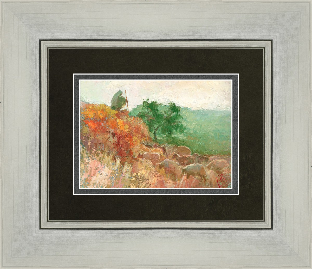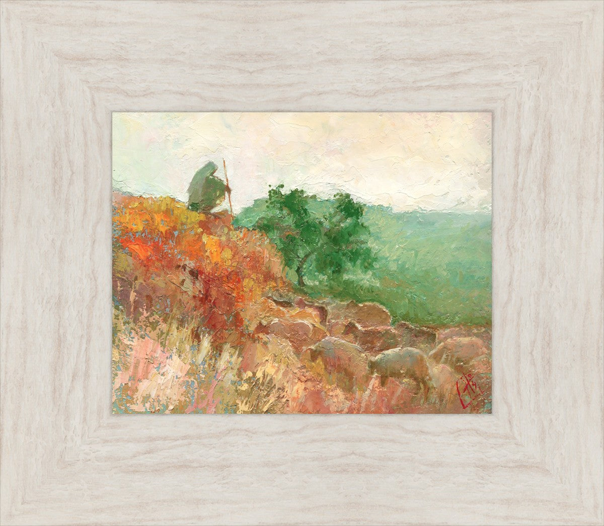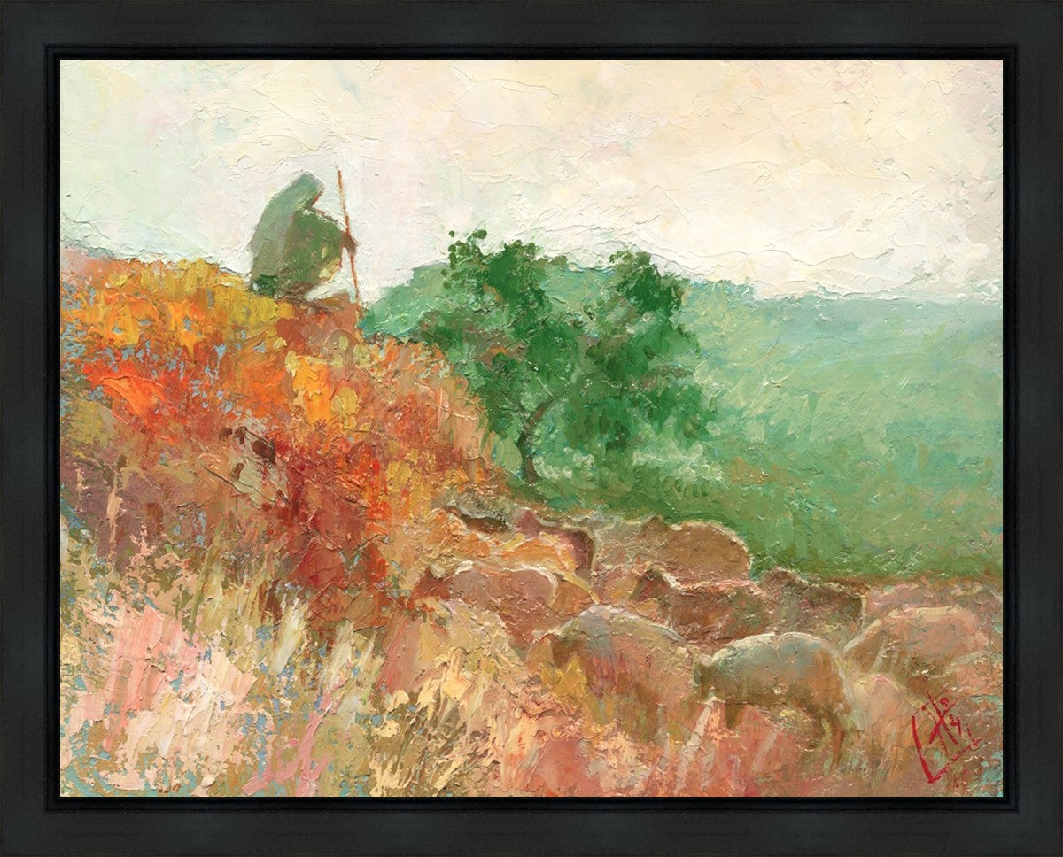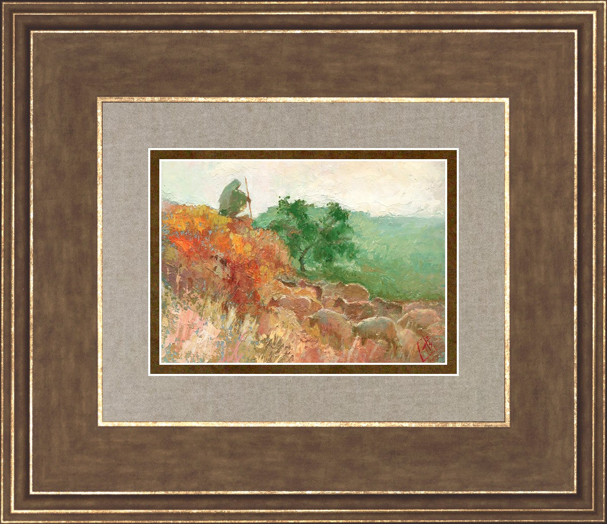 Inspired by Psalm 23:1-3, this painting depicts a solitary shepherd watching over his flock – a symbol of God’s guidance. This artwork invites us to contemplate the comforting words of Psalm 23: “The Lord is my shepherd, I shall not want. He maketh me to lie down in green pastures: he leadeth me beside the still waters. He restoreth my soul: he leadeth me in the paths of righteousness for his name’s sake”