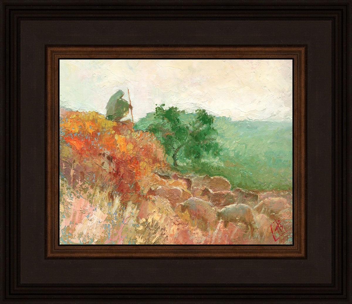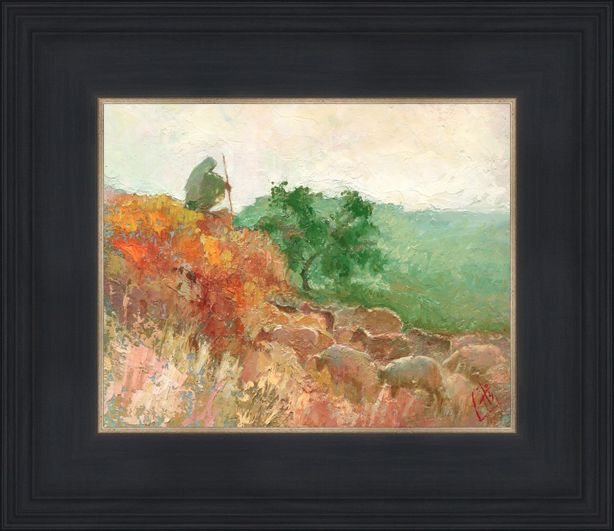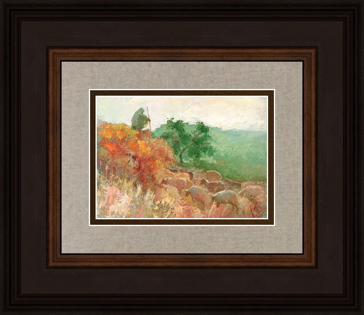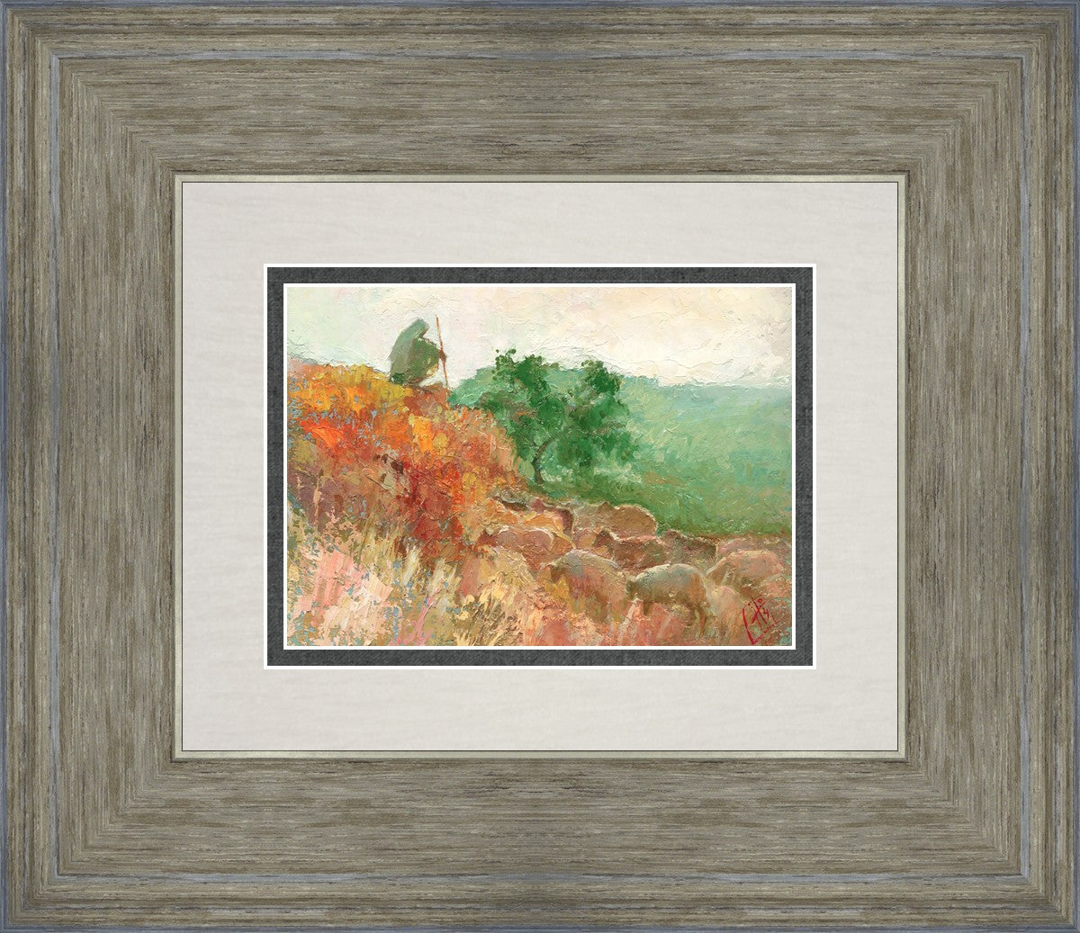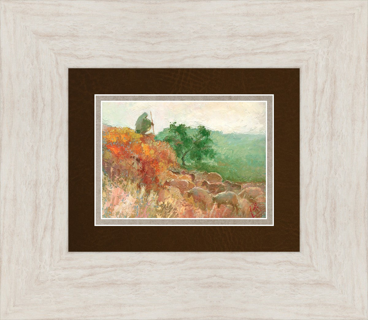 Inspired by Psalm 23:1-3, this painting depicts a solitary shepherd watching over his flock – a symbol of God’s guidance. This artwork invites us to contemplate the comforting words of Psalm 23: “The Lord is my shepherd, I shall not want. He maketh me to lie down in green pastures: he leadeth me beside the still waters. He restoreth my soul: he leadeth me in the paths of righteousness for his name’s sake”