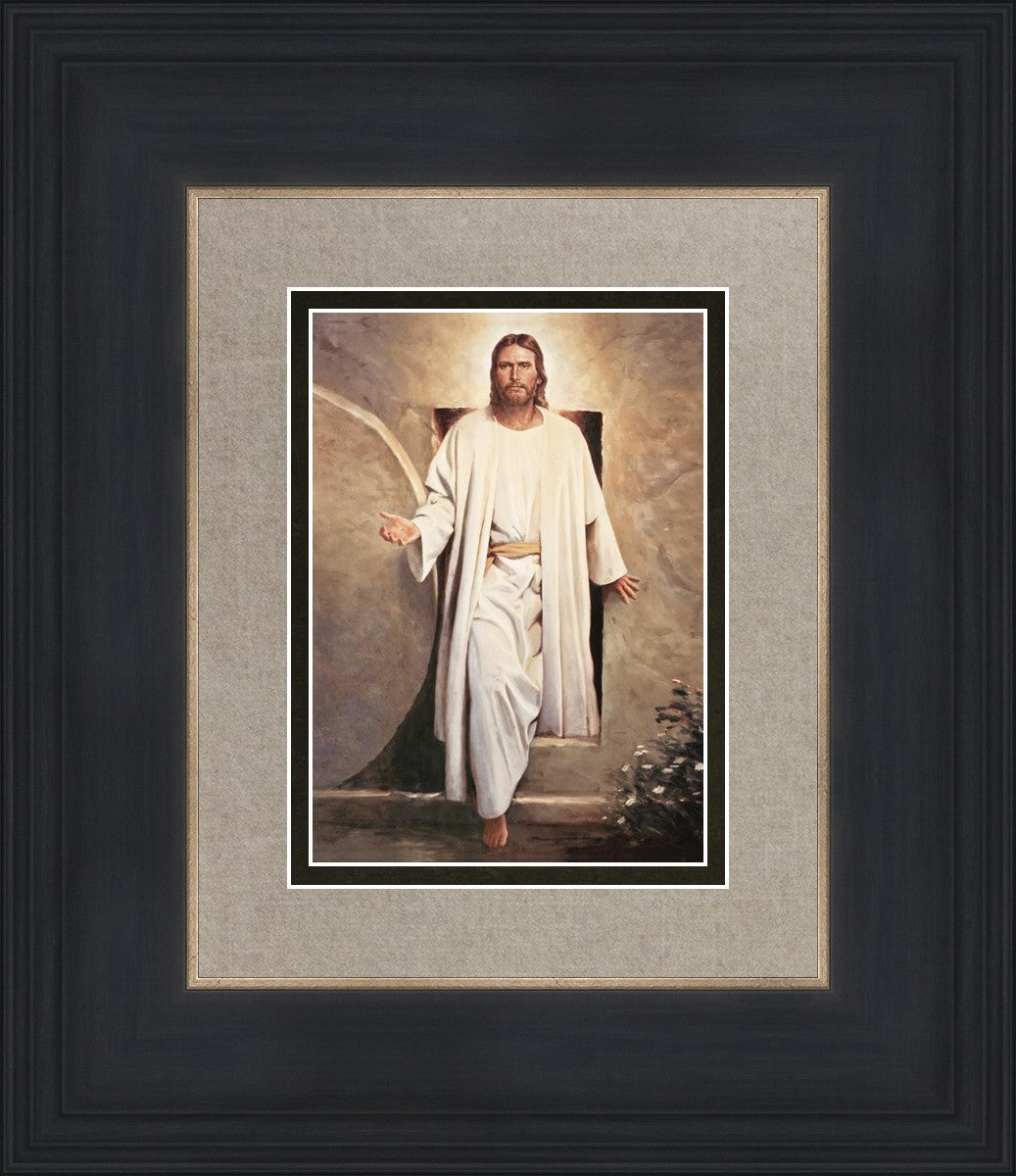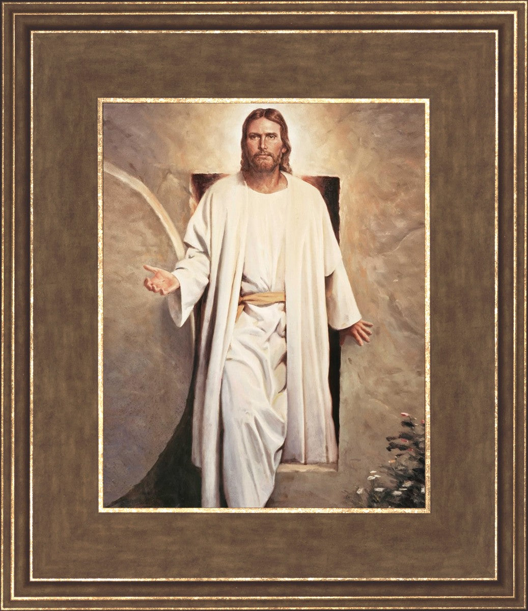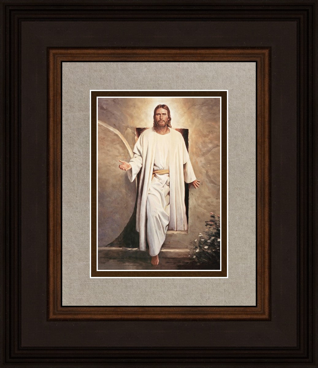 A man who had recently visited the Garden Tomb in Jerusalem came to me and described the personal feelings he had experienced while he was there. He said that as he stepped out of the darkness of the tomb and into the sunlight, he was overwhelmed as he though of Christ’s resurrection. He wanted me to recreate those feelings in a painting of the Savior stepping out of the tomb and into the early morning sun. He commissioned me to do this painting for him because he wanted Jesus to resemble te Red Robe painting (The Lord Jesus Christ), which was his favorite painting of the Savior.