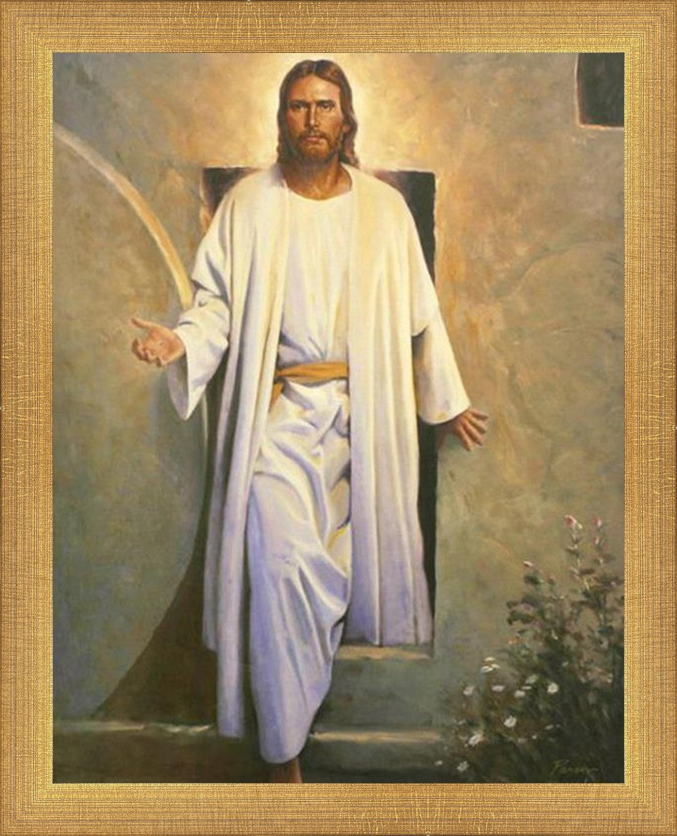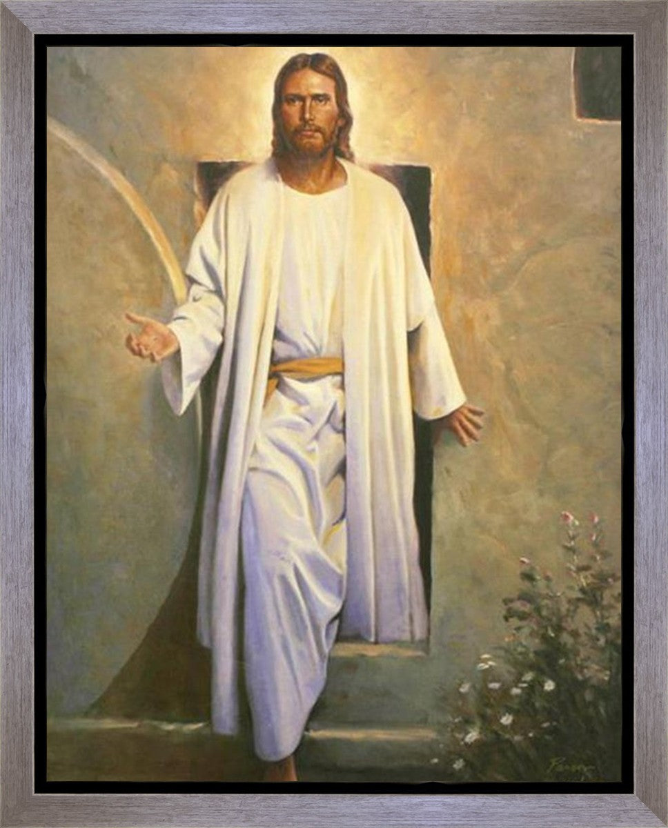 Many people have enjoyed this painting and some have commented to me that the placement of his hands is meaningful to them. One hand is behind Him, touching the opening of the tomb, and the other hand reaches forward. It is as if he is putting the tomb and death behind him and reaching ahead into eternity.