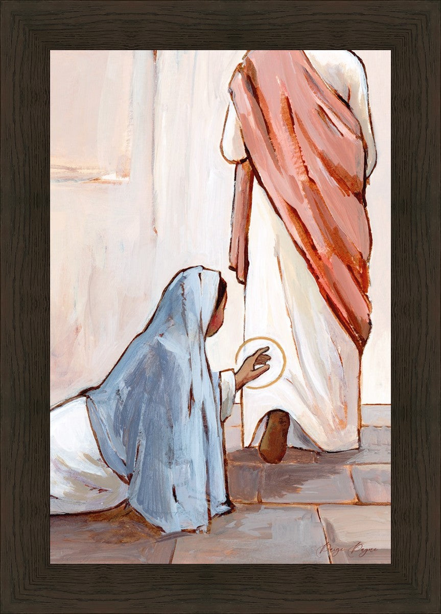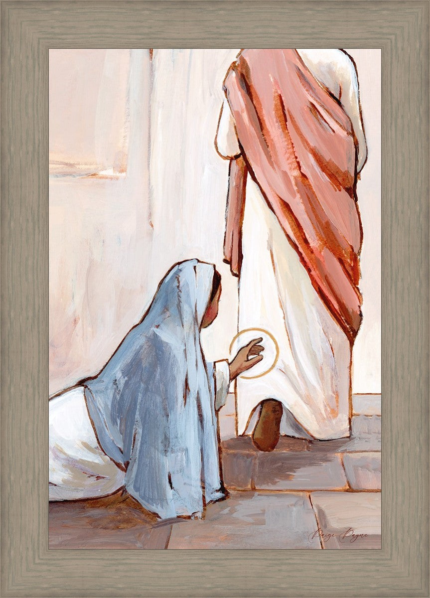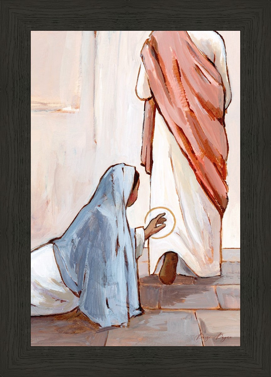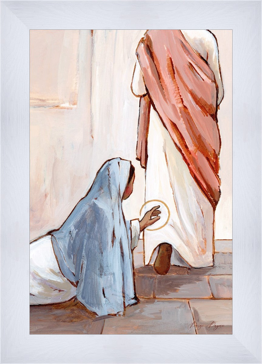 In this piece I did not want to show the woman’s full face because I wanted anyone who looks at this piece to imagine that it is them. A reminder that He is always within reach. It takes a lot of faith, humility, and hope to reach for Him. But when we do, He can heal us. Fully, truly, completely, heal us.