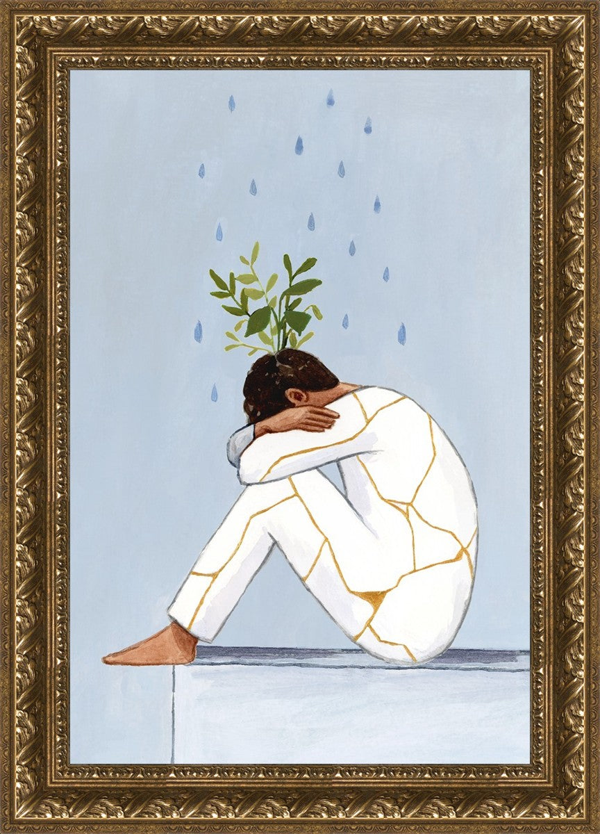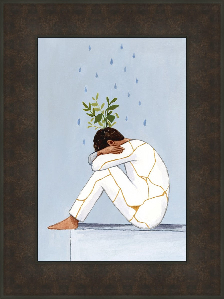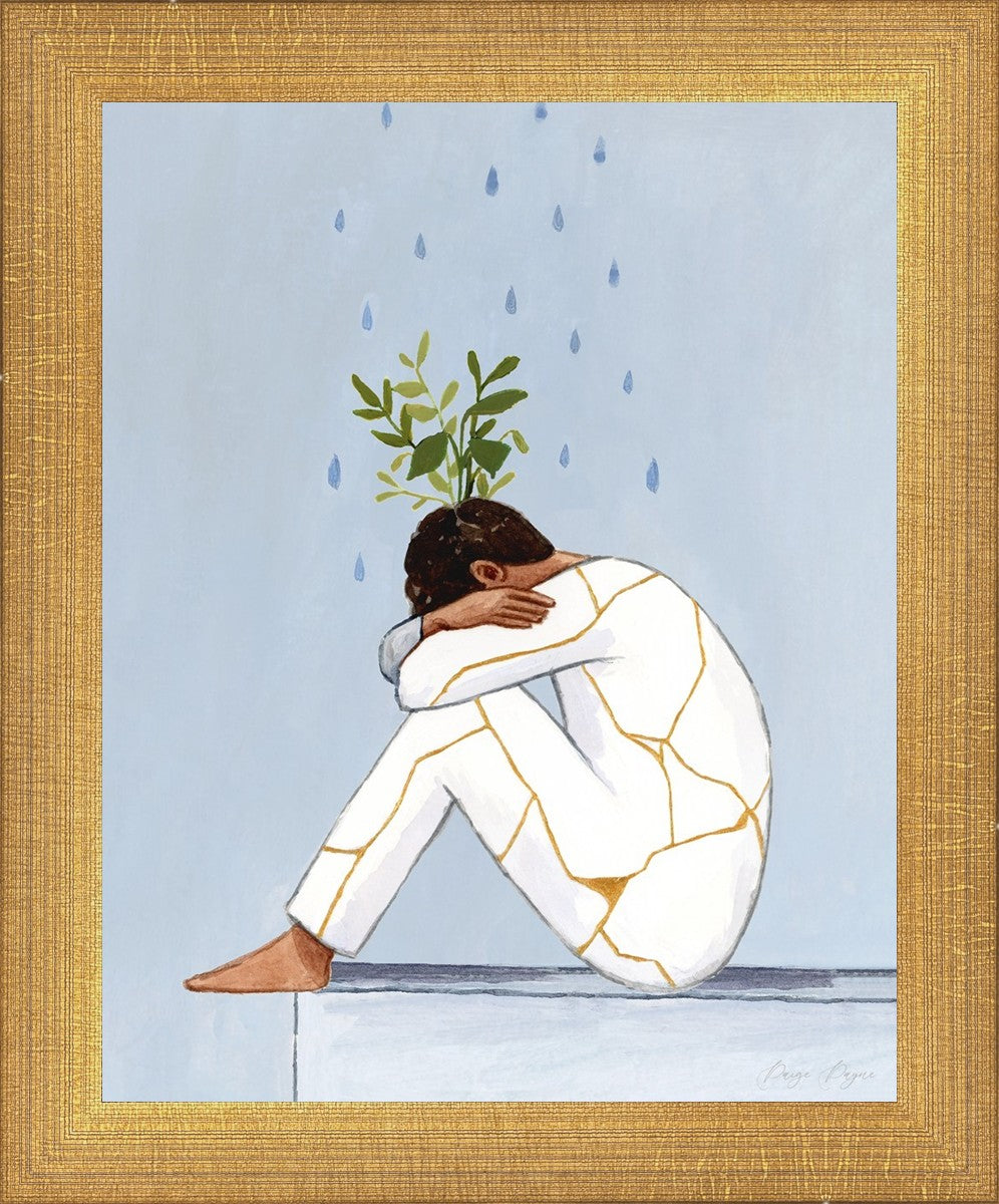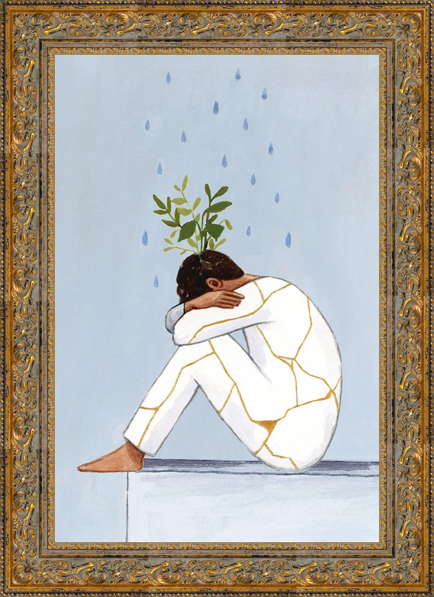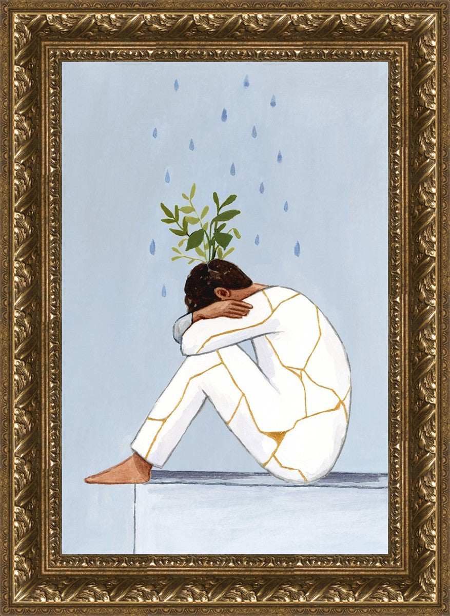 Mental Health Awareness is extremely important to me, and I am passionate about helping anyone who struggles with mental health to feel seen and understood. In this painting you see a man with his knees curled to his chest. Rain pours on him, and Kintsugi ("golden joinery") covers his clothes. Greenery grows out his head, his head that he often feels is broken beyond repair. Learning about Kintsugi has helped me to reframe my mental illness. Instead of ‘what is wrong with me’ or ‘why am I so messed up’, I have begun to say ‘this is what makes me special’ and ‘my mental health struggles have made me compassionate to others, and have helped me grow into something beautiful.’