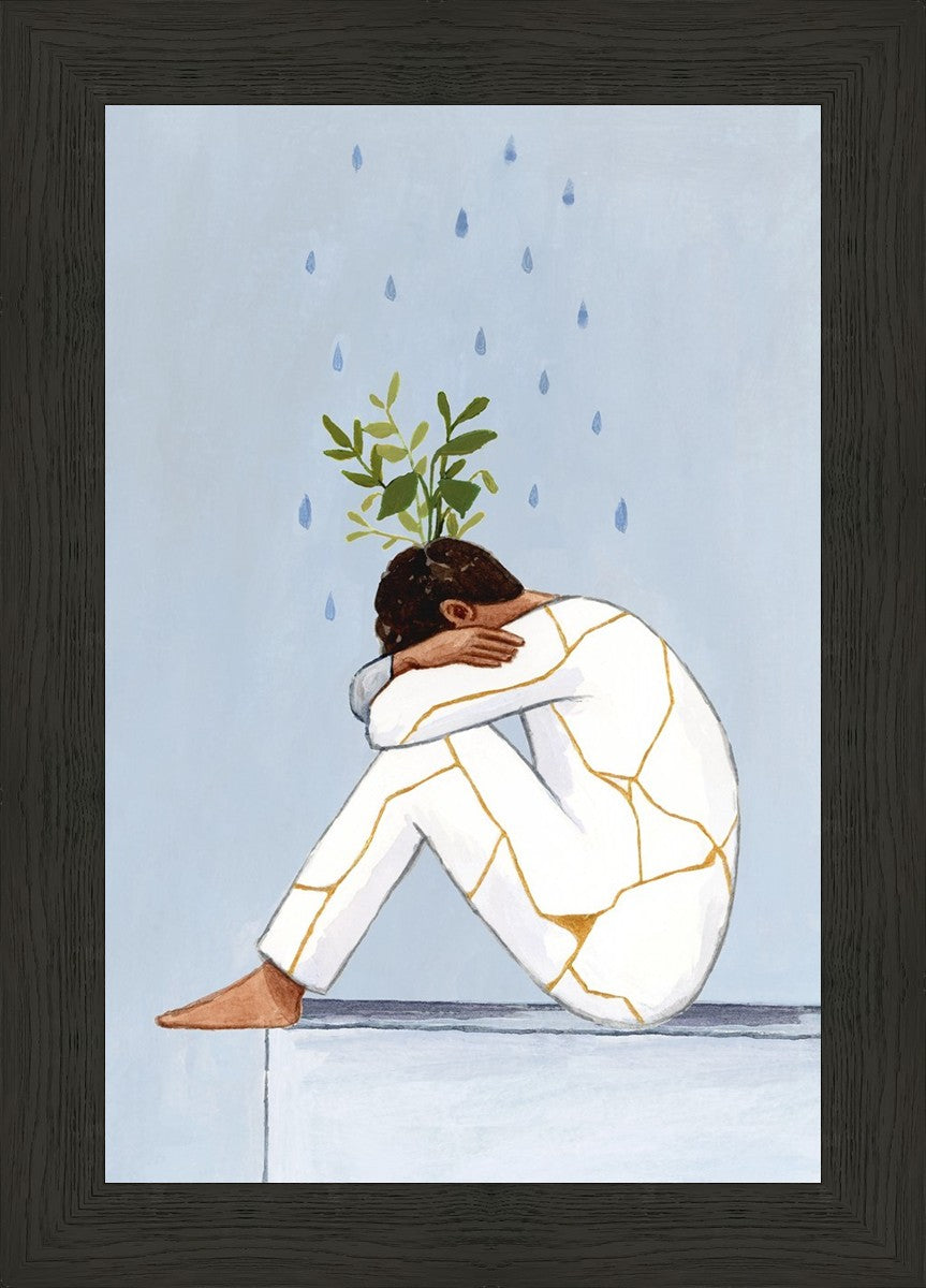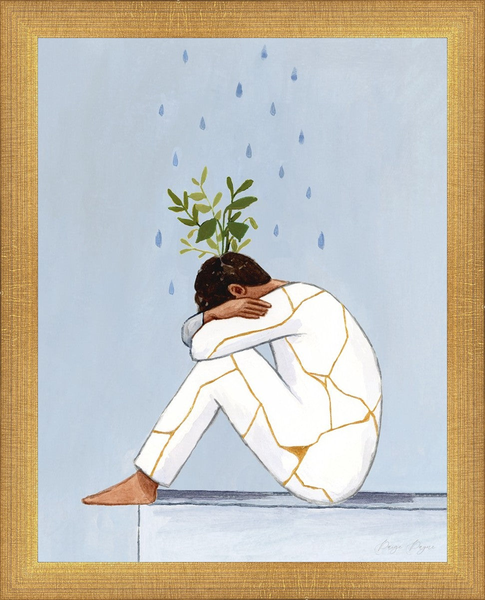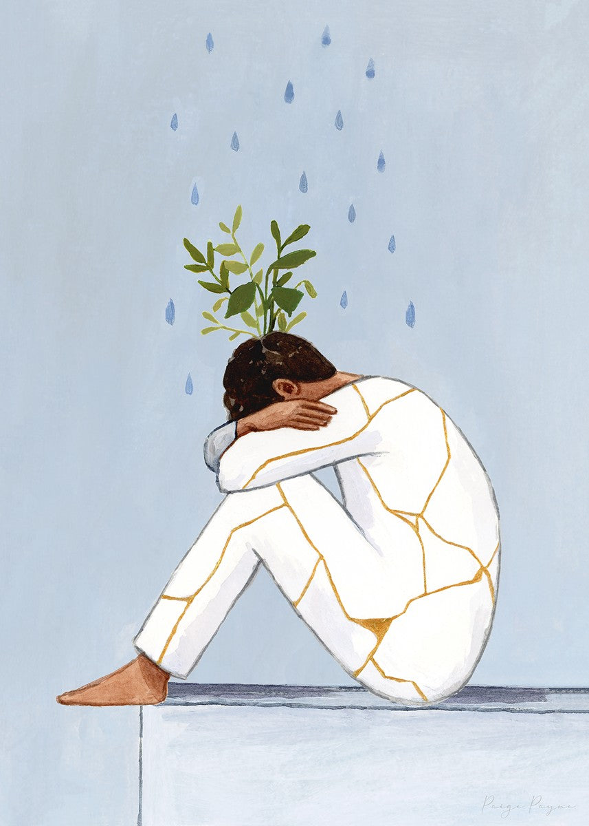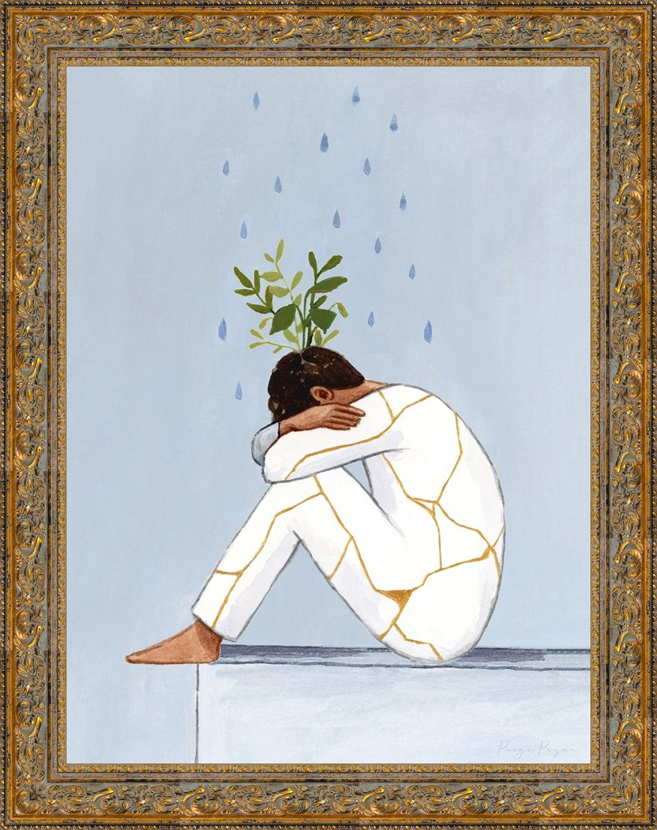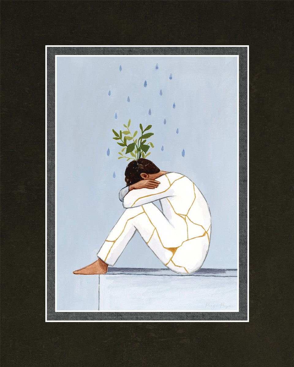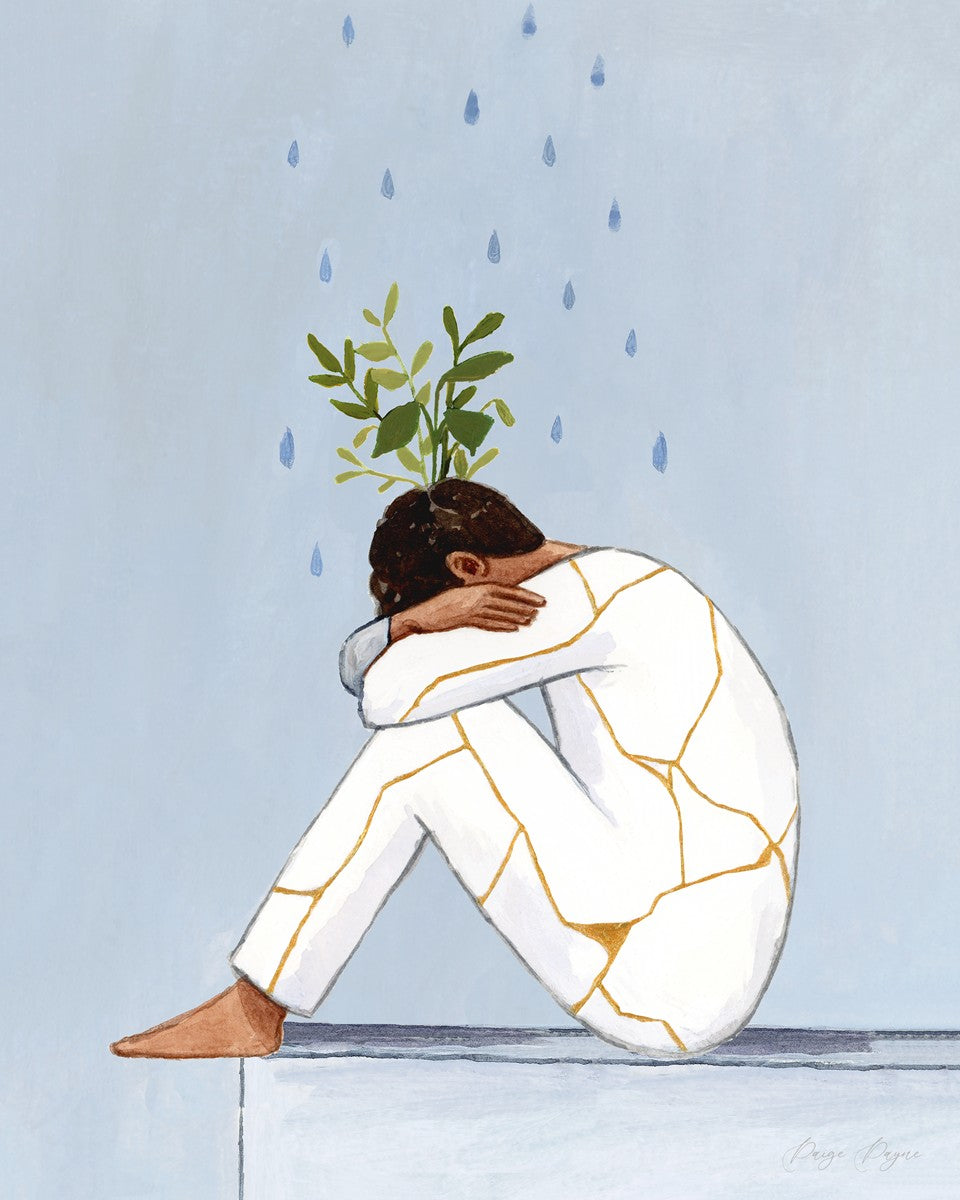 Mental Health Awareness is extremely important to me, and I am passionate about helping anyone who struggles with mental health to feel seen and understood. In this painting you see a man with his knees curled to his chest. Rain pours on him, and Kintsugi ("golden joinery") covers his clothes. Greenery grows out his head, his head that he often feels is broken beyond repair. Learning about Kintsugi has helped me to reframe my mental illness. Instead of ‘what is wrong with me’ or ‘why am I so messed up’, I have begun to say ‘this is what makes me special’ and ‘my mental health struggles have made me compassionate to others, and have helped me grow into something beautiful.’