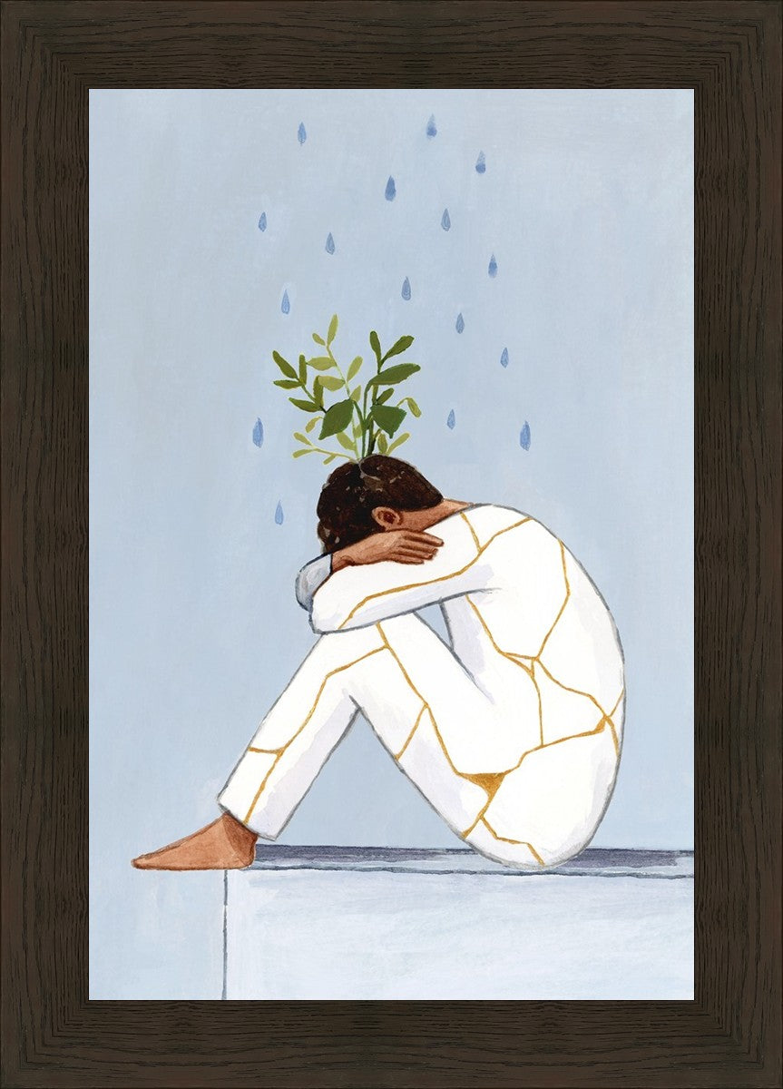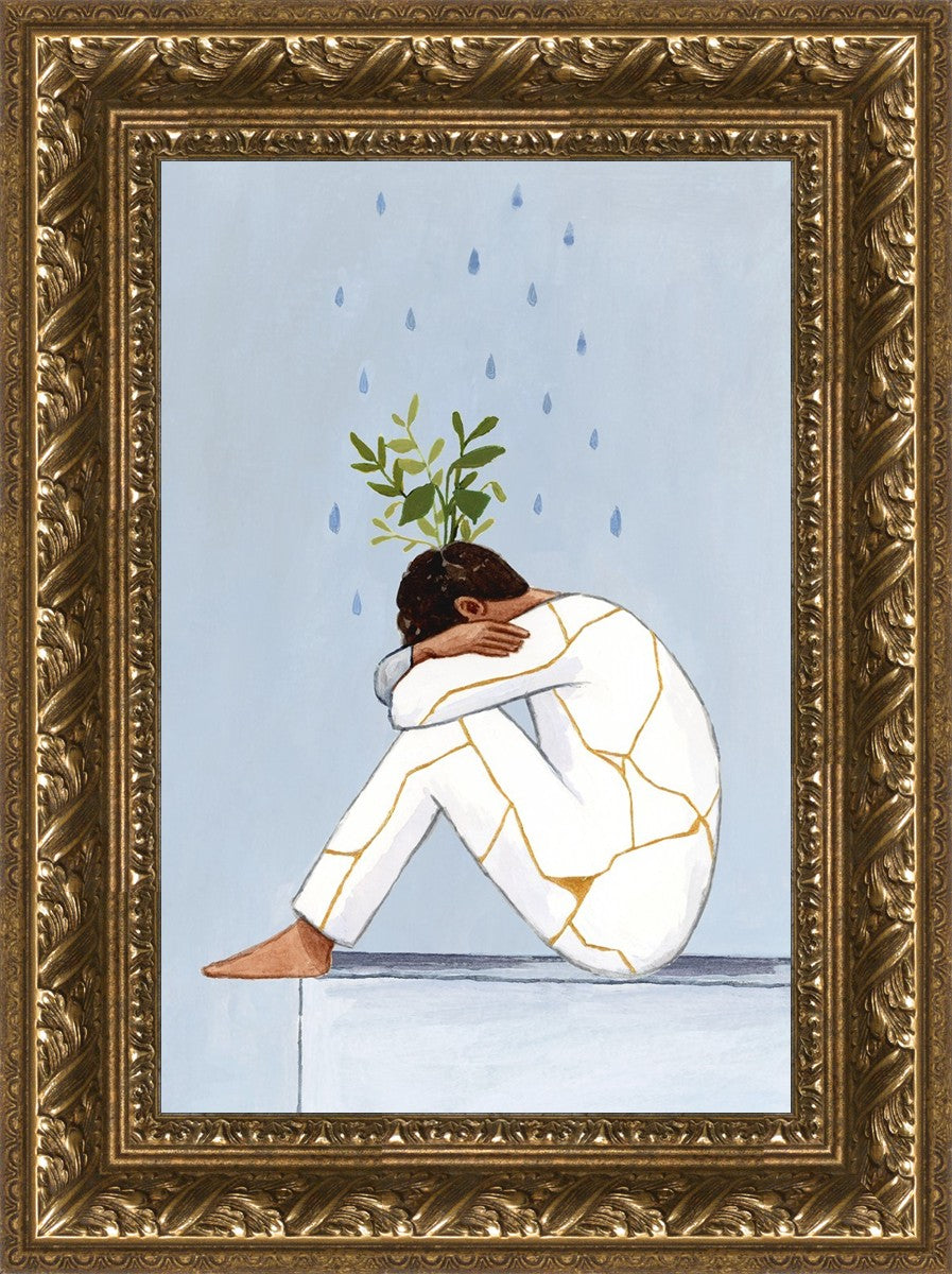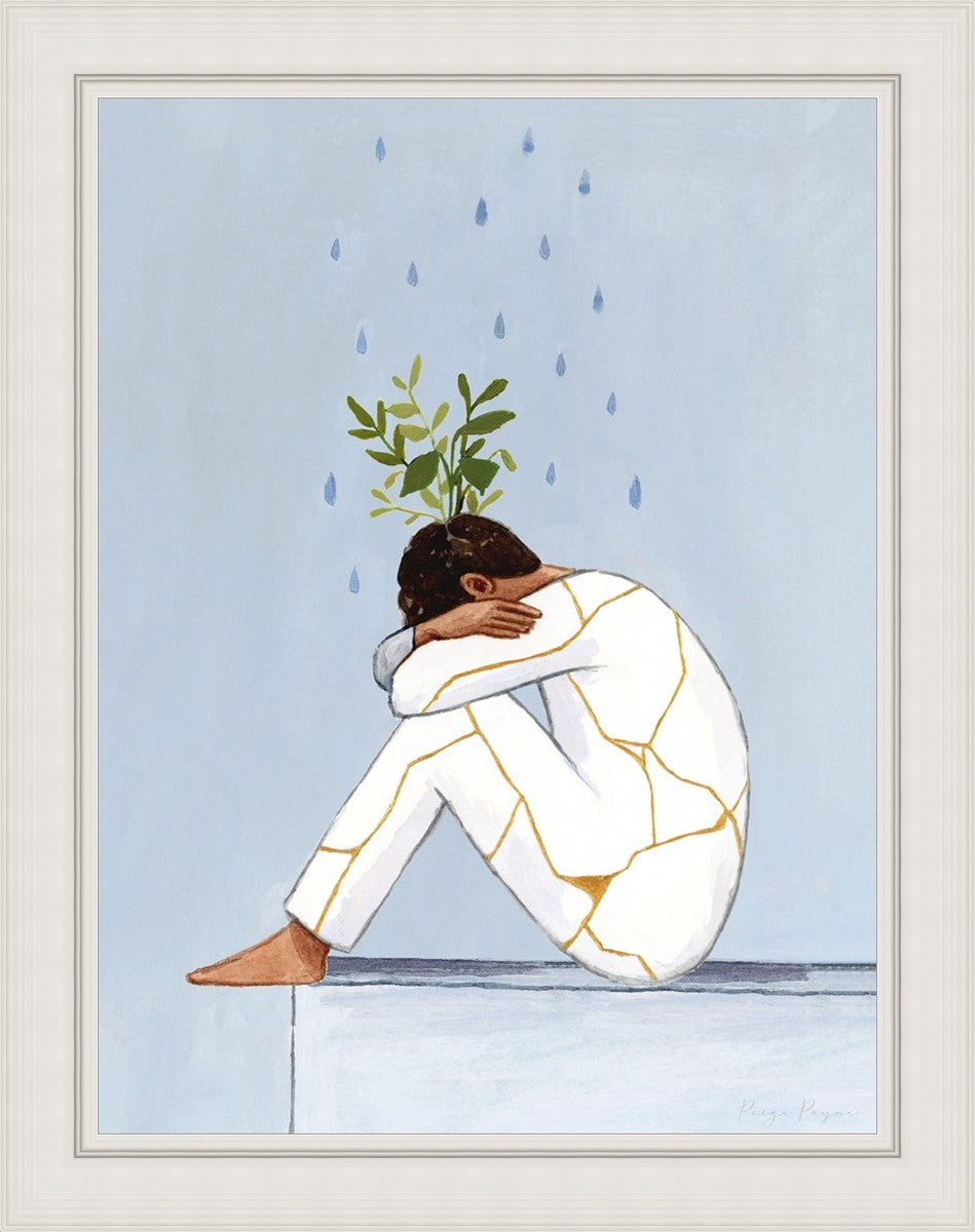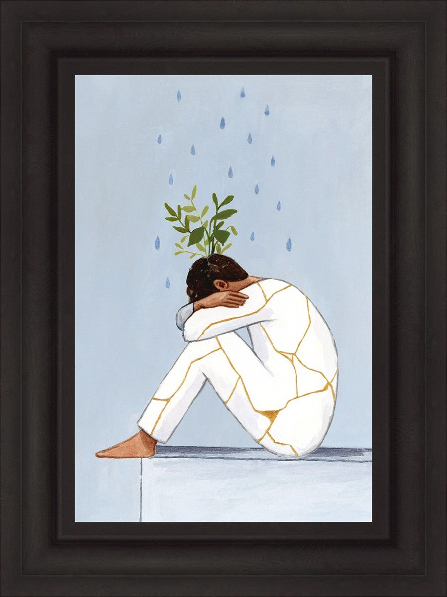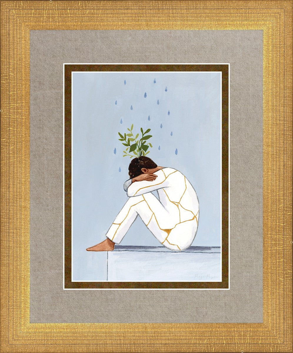 Mental Health Awareness is extremely important to me, and I am passionate about helping anyone who struggles with mental health to feel seen and understood. In this painting you see a man with his knees curled to his chest. Rain pours on him, and Kintsugi ("golden joinery") covers his clothes. Greenery grows out his head, his head that he often feels is broken beyond repair. Learning about Kintsugi has helped me to reframe my mental illness. Instead of ‘what is wrong with me’ or ‘why am I so messed up’, I have begun to say ‘this is what makes me special’ and ‘my mental health struggles have made me compassionate to others, and have helped me grow into something beautiful.’