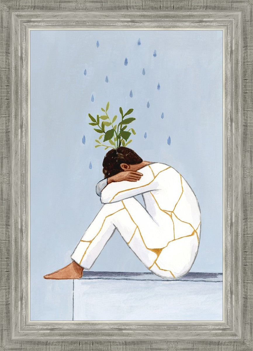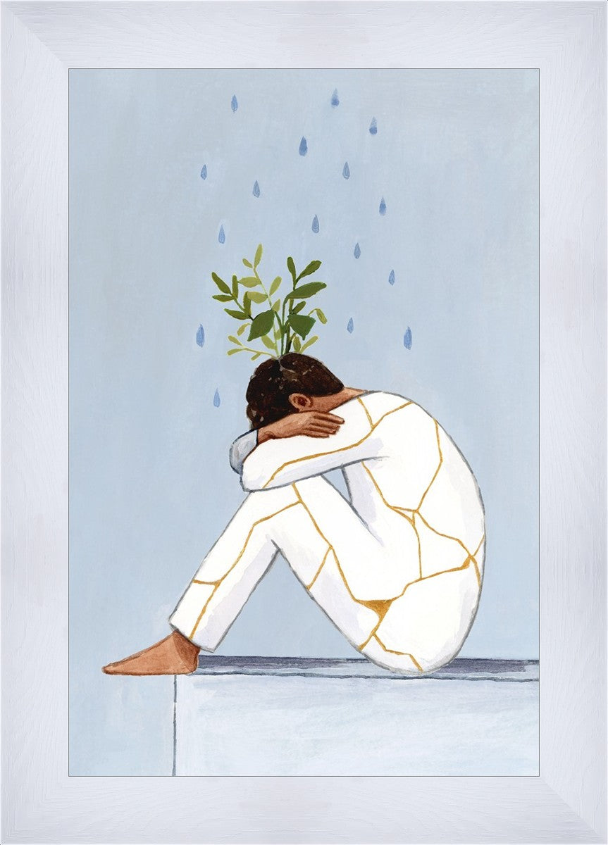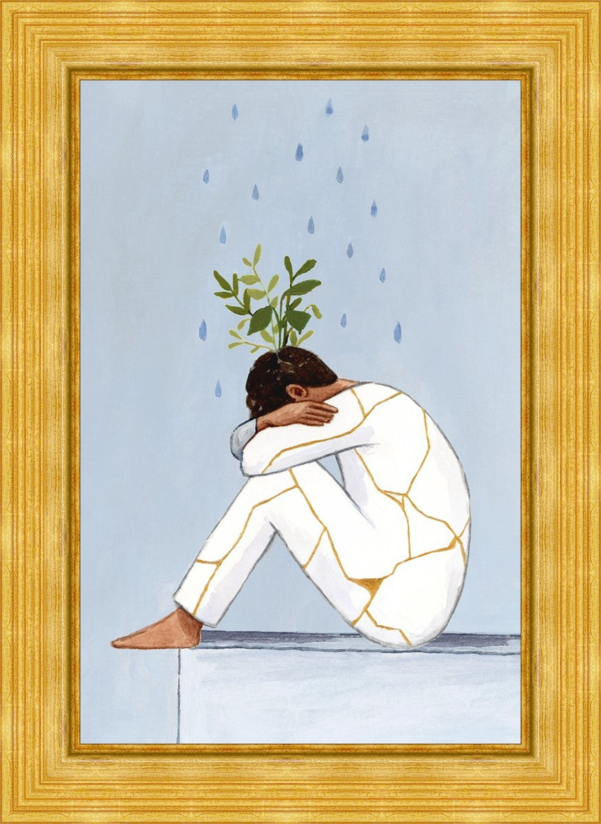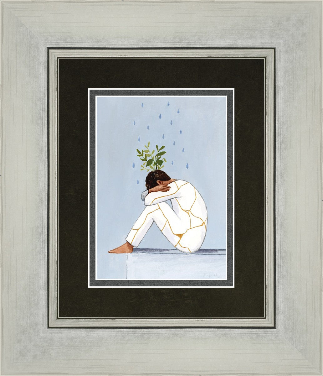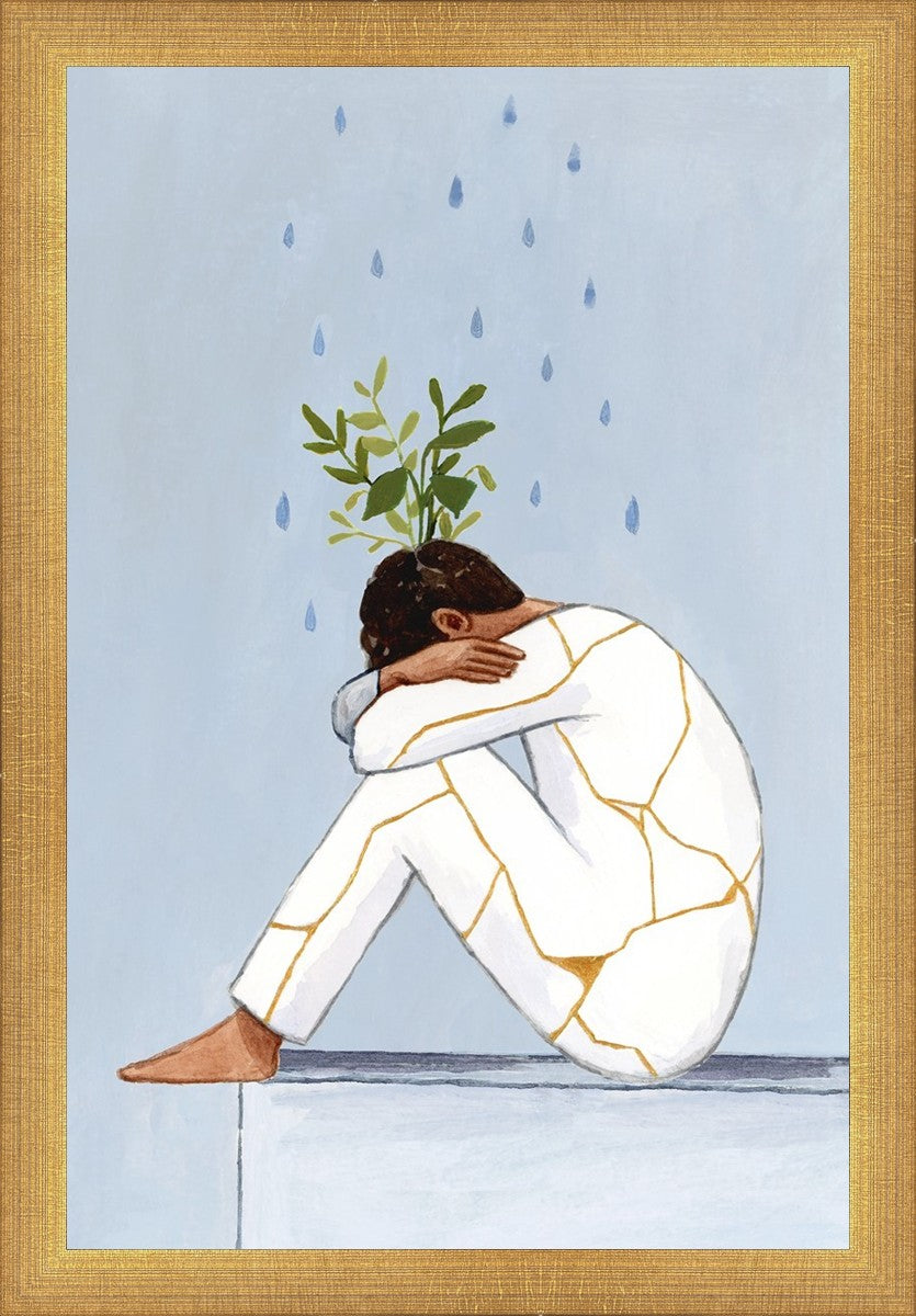 Mental Health Awareness is extremely important to me, and I am passionate about helping anyone who struggles with mental health to feel seen and understood. In this painting you see a man with his knees curled to his chest. Rain pours on him, and Kintsugi ("golden joinery") covers his clothes. Greenery grows out his head, his head that he often feels is broken beyond repair. Learning about Kintsugi has helped me to reframe my mental illness. Instead of ‘what is wrong with me’ or ‘why am I so messed up’, I have begun to say ‘this is what makes me special’ and ‘my mental health struggles have made me compassionate to others, and have helped me grow into something beautiful.’