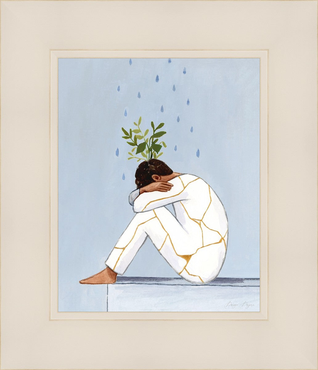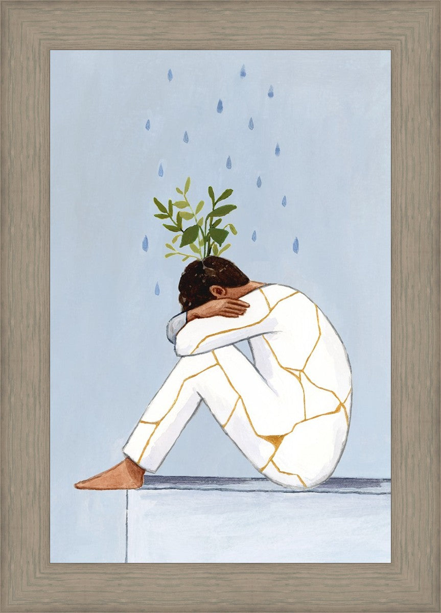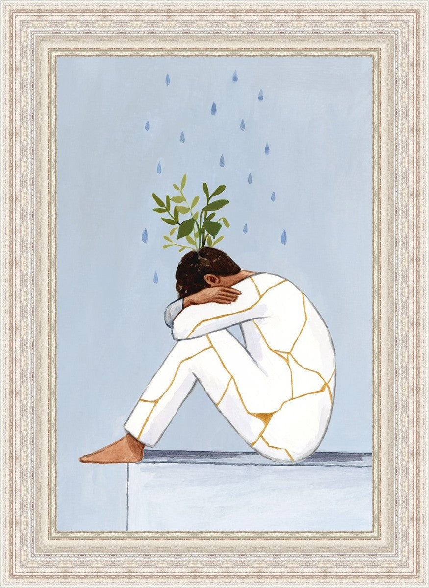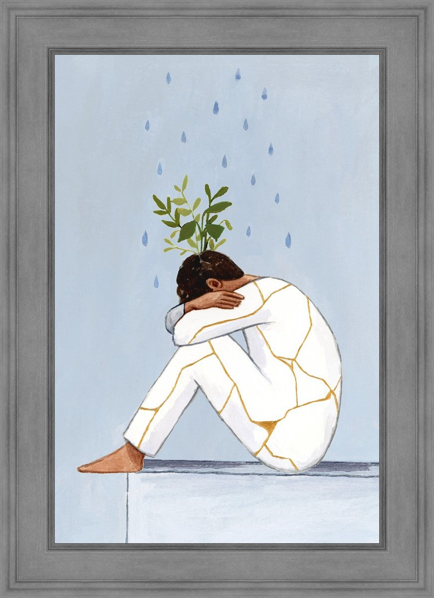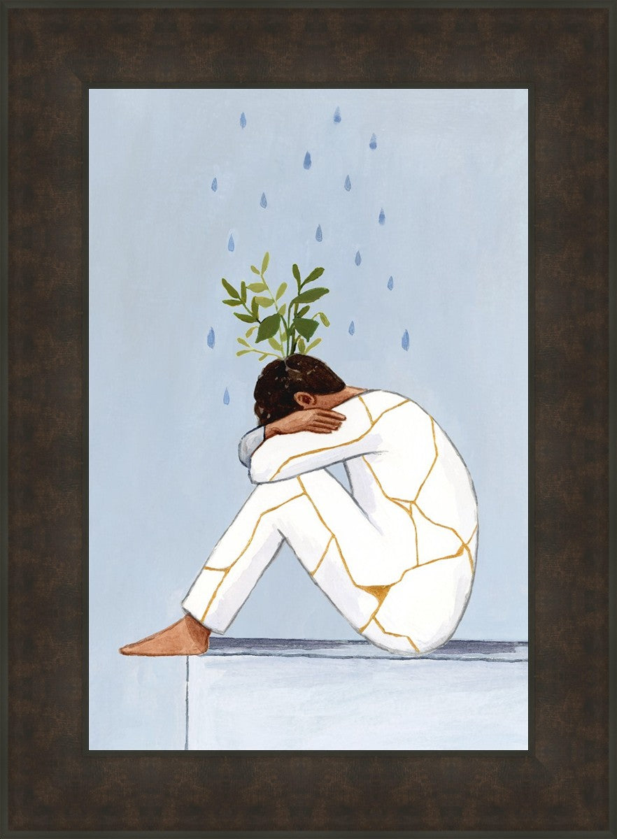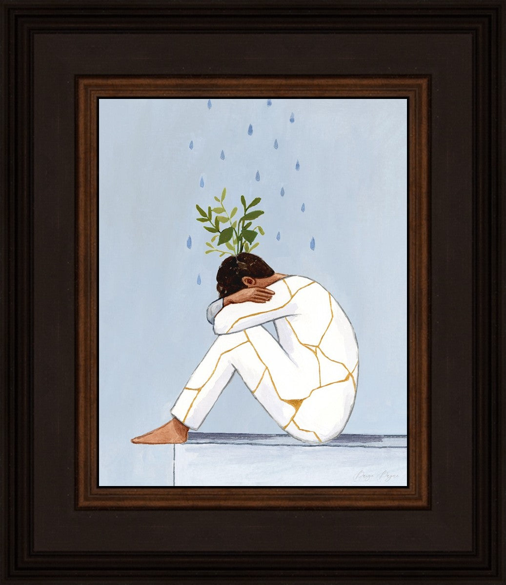 Mental Health Awareness is extremely important to me, and I am passionate about helping anyone who struggles with mental health to feel seen and understood. In this painting you see a man with his knees curled to his chest. Rain pours on him, and Kintsugi ("golden joinery") covers his clothes. Greenery grows out his head, his head that he often feels is broken beyond repair. Learning about Kintsugi has helped me to reframe my mental illness. Instead of ‘what is wrong with me’ or ‘why am I so messed up’, I have begun to say ‘this is what makes me special’ and ‘my mental health struggles have made me compassionate to others, and have helped me grow into something beautiful.’