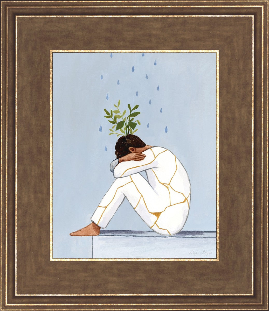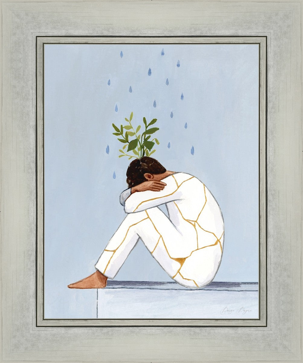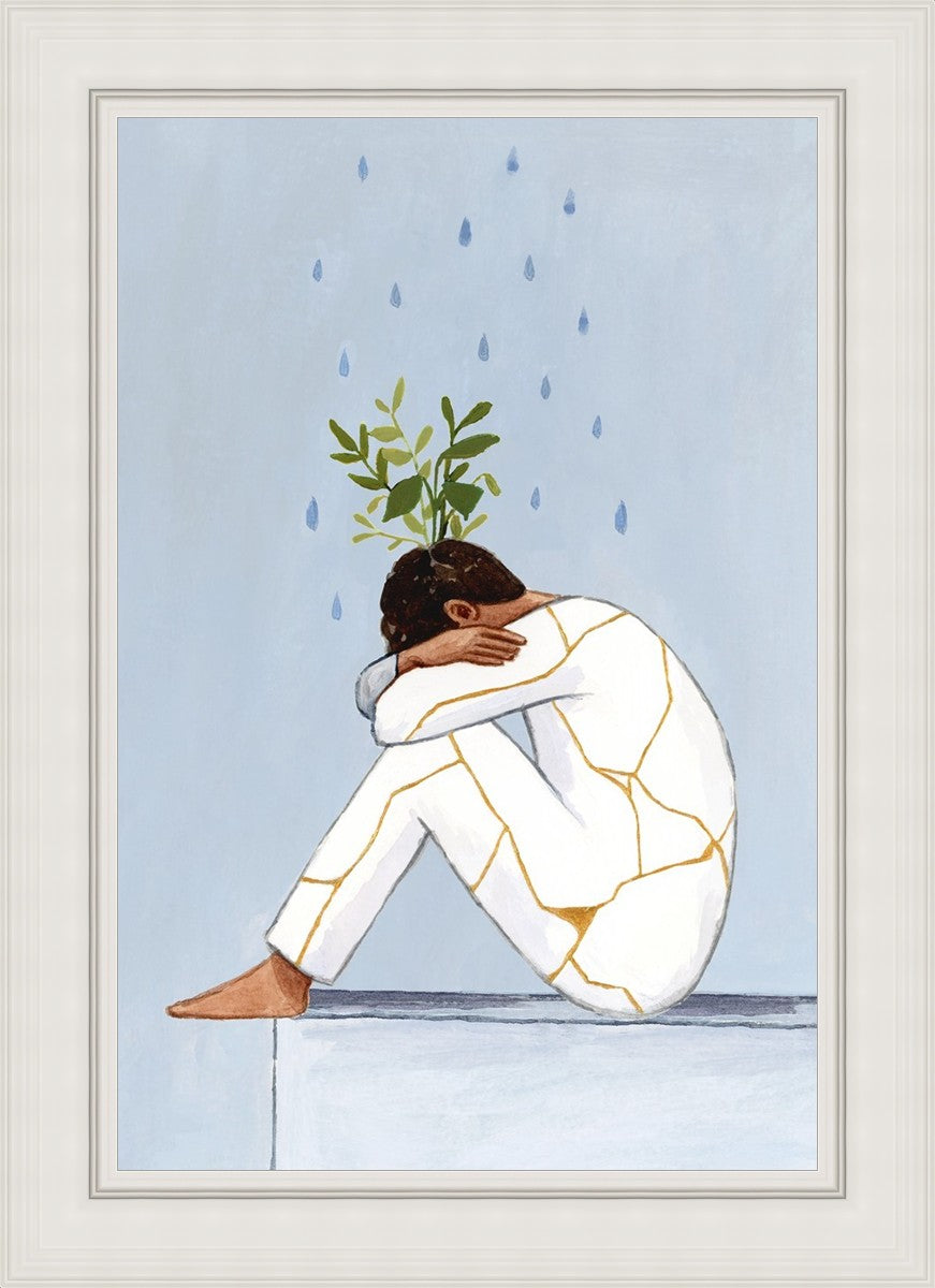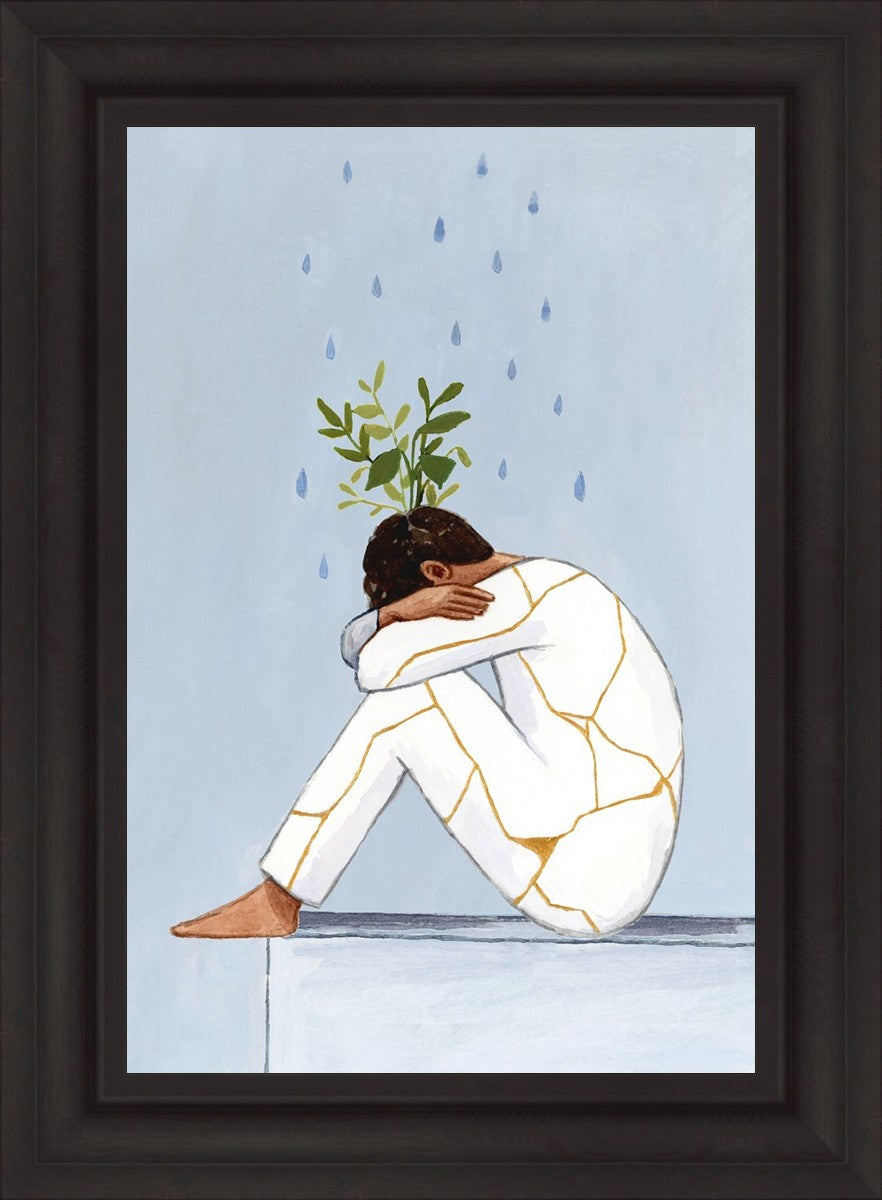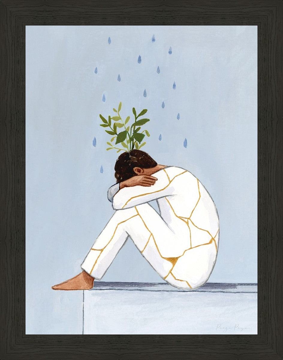 Mental Health Awareness is extremely important to me, and I am passionate about helping anyone who struggles with mental health to feel seen and understood. In this painting you see a man with his knees curled to his chest. Rain pours on him, and Kintsugi ("golden joinery") covers his clothes. Greenery grows out his head, his head that he often feels is broken beyond repair. Learning about Kintsugi has helped me to reframe my mental illness. Instead of ‘what is wrong with me’ or ‘why am I so messed up’, I have begun to say ‘this is what makes me special’ and ‘my mental health struggles have made me compassionate to others, and have helped me grow into something beautiful.’