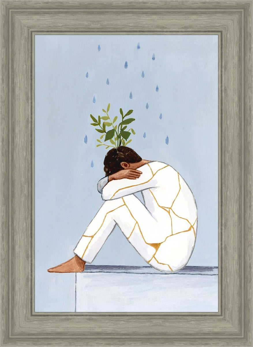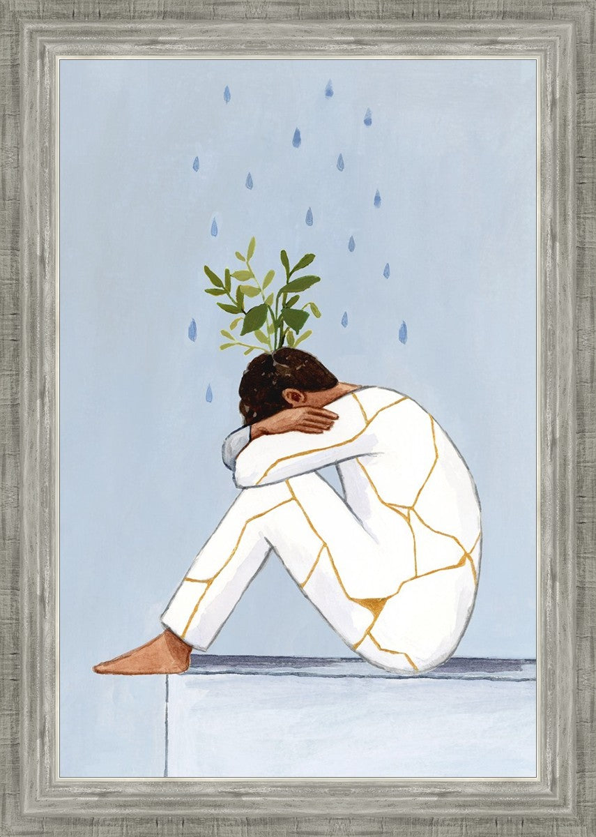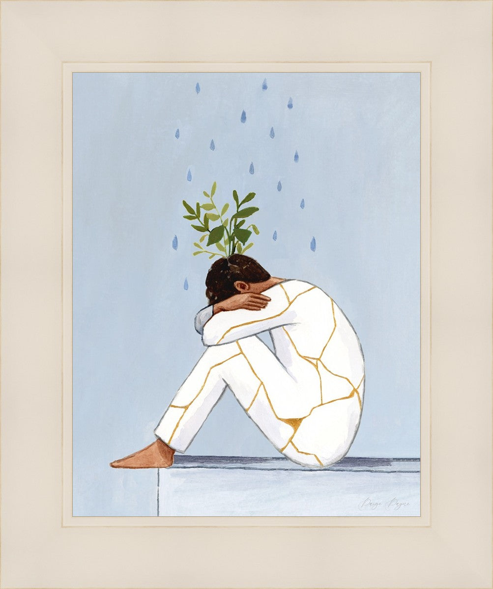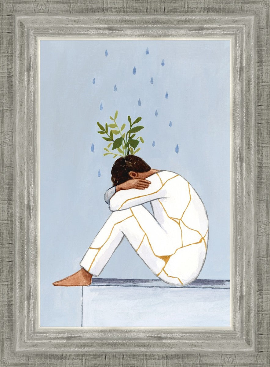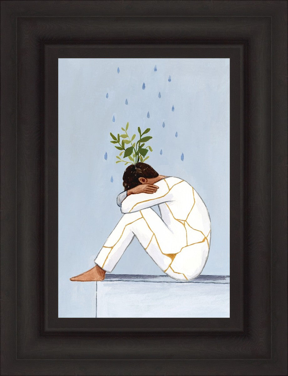 Mental Health Awareness is extremely important to me, and I am passionate about helping anyone who struggles with mental health to feel seen and understood. In this painting you see a man with his knees curled to his chest. Rain pours on him, and Kintsugi ("golden joinery") covers his clothes. Greenery grows out his head, his head that he often feels is broken beyond repair. Learning about Kintsugi has helped me to reframe my mental illness. Instead of ‘what is wrong with me’ or ‘why am I so messed up’, I have begun to say ‘this is what makes me special’ and ‘my mental health struggles have made me compassionate to others, and have helped me grow into something beautiful.’