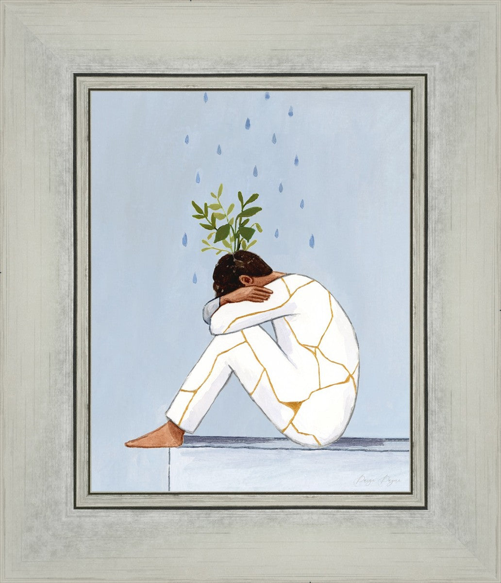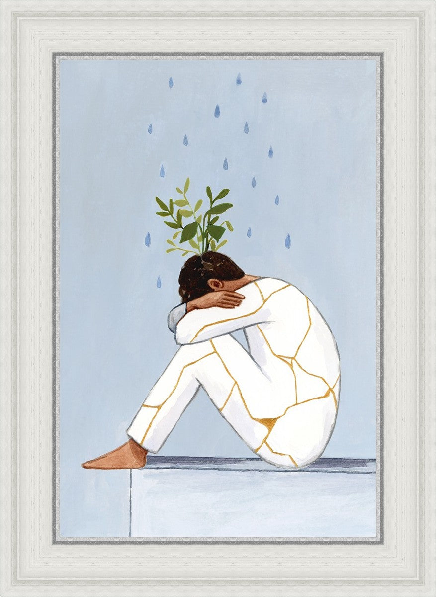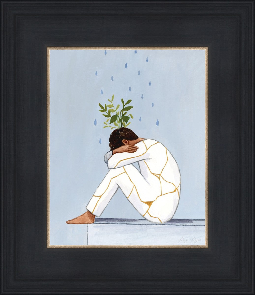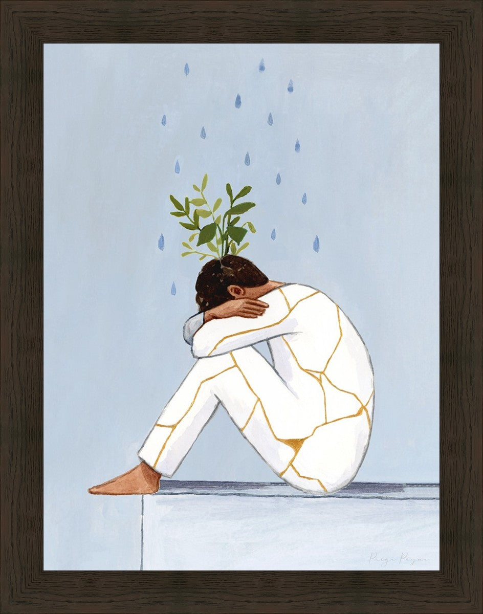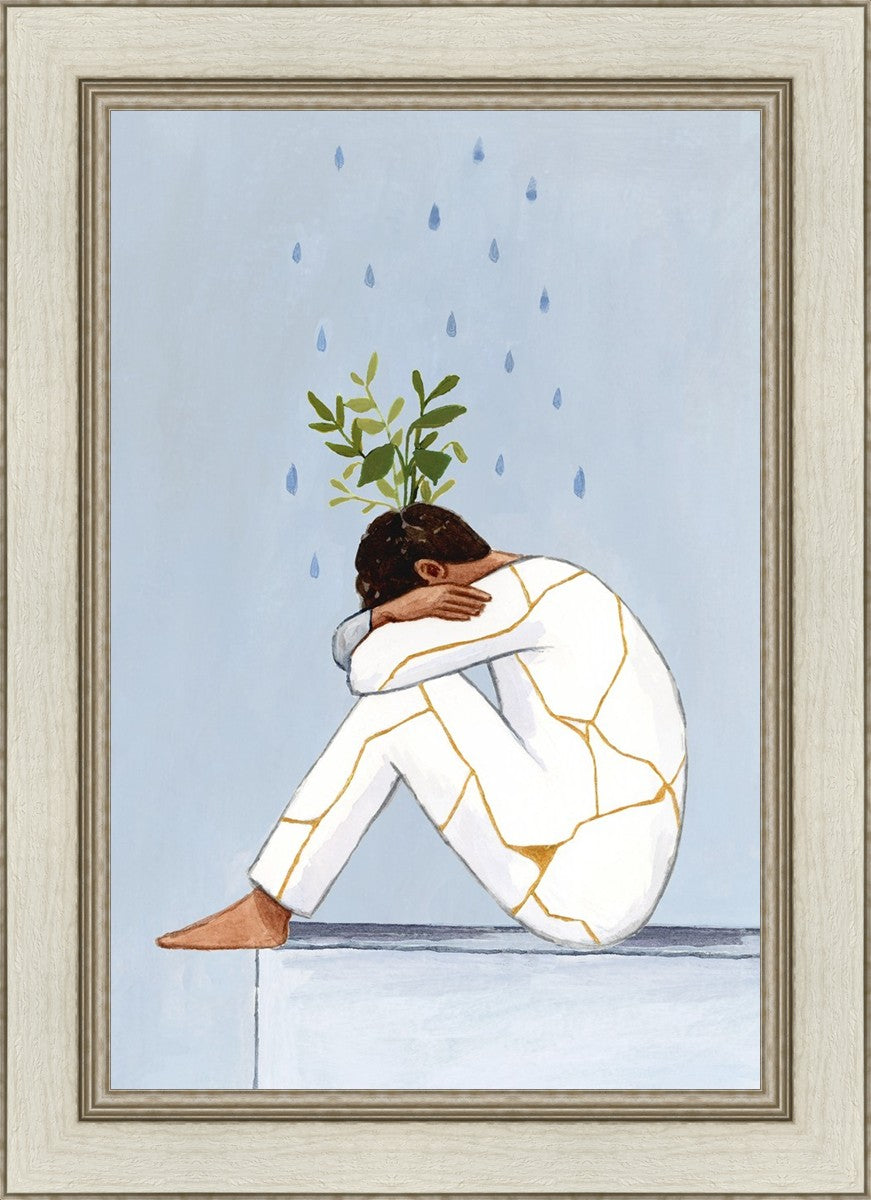 Mental Health Awareness is extremely important to me, and I am passionate about helping anyone who struggles with mental health to feel seen and understood. In this painting you see a man with his knees curled to his chest. Rain pours on him, and Kintsugi ("golden joinery") covers his clothes. Greenery grows out his head, his head that he often feels is broken beyond repair. Learning about Kintsugi has helped me to reframe my mental illness. Instead of ‘what is wrong with me’ or ‘why am I so messed up’, I have begun to say ‘this is what makes me special’ and ‘my mental health struggles have made me compassionate to others, and have helped me grow into something beautiful.’