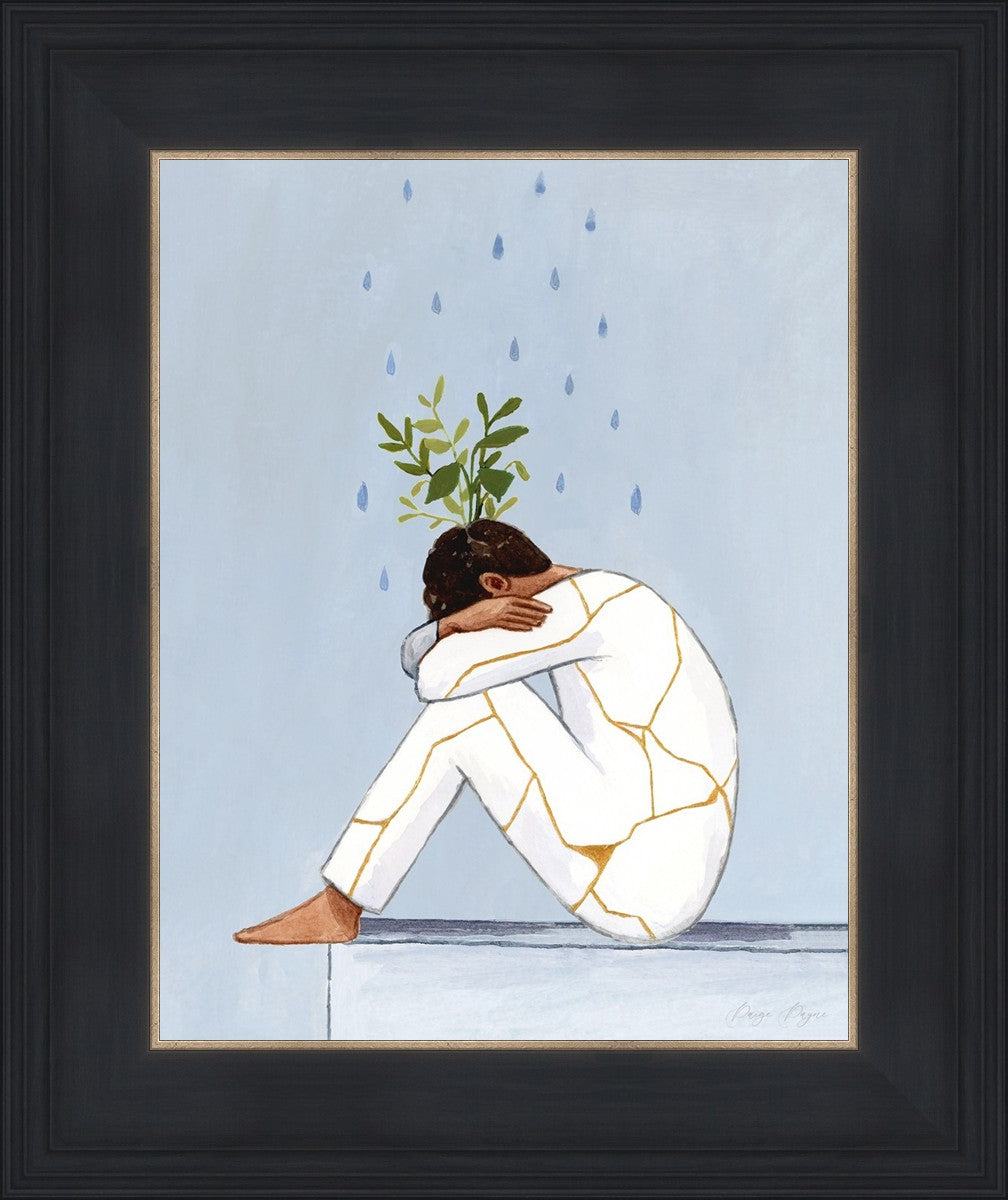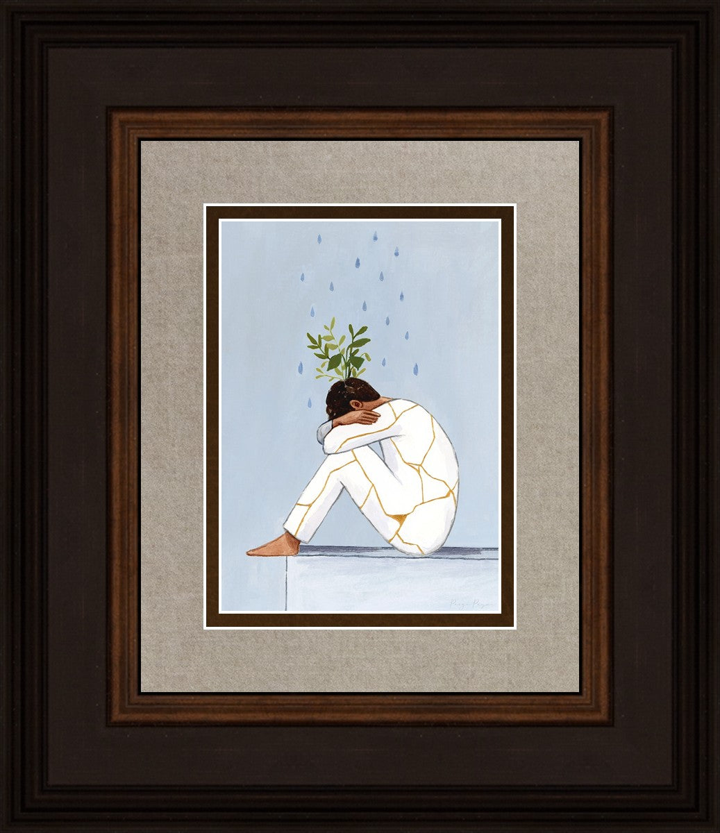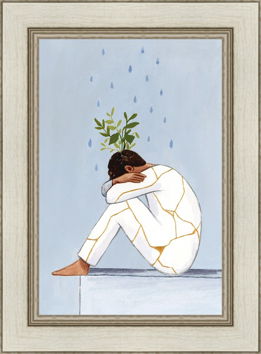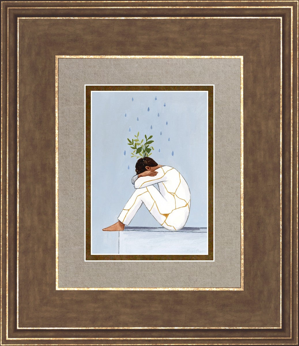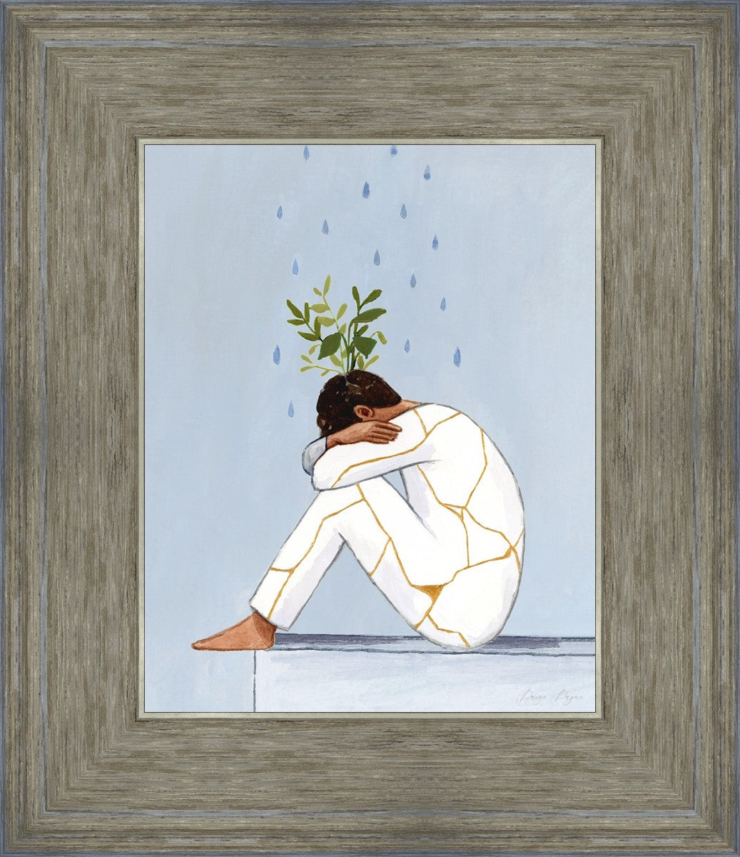 Mental Health Awareness is extremely important to me, and I am passionate about helping anyone who struggles with mental health to feel seen and understood. In this painting you see a man with his knees curled to his chest. Rain pours on him, and Kintsugi ("golden joinery") covers his clothes. Greenery grows out his head, his head that he often feels is broken beyond repair. Learning about Kintsugi has helped me to reframe my mental illness. Instead of ‘what is wrong with me’ or ‘why am I so messed up’, I have begun to say ‘this is what makes me special’ and ‘my mental health struggles have made me compassionate to others, and have helped me grow into something beautiful.’