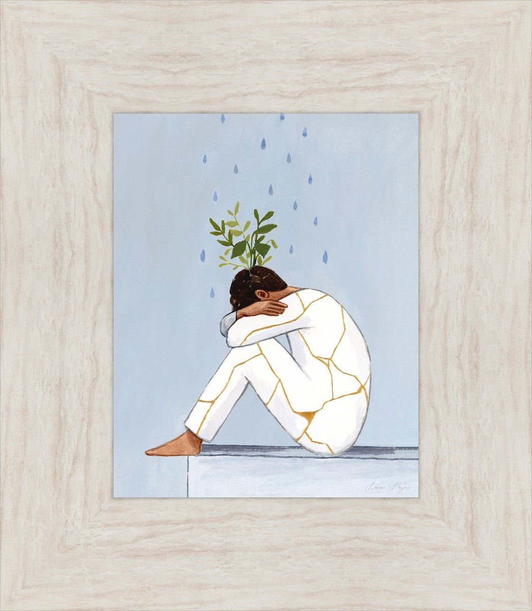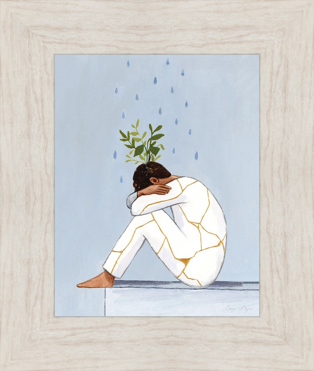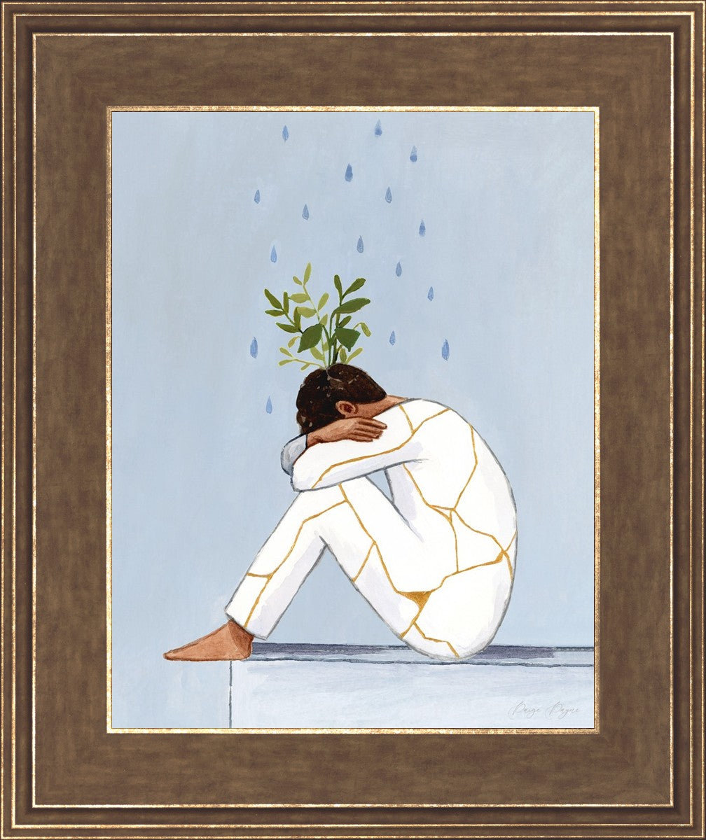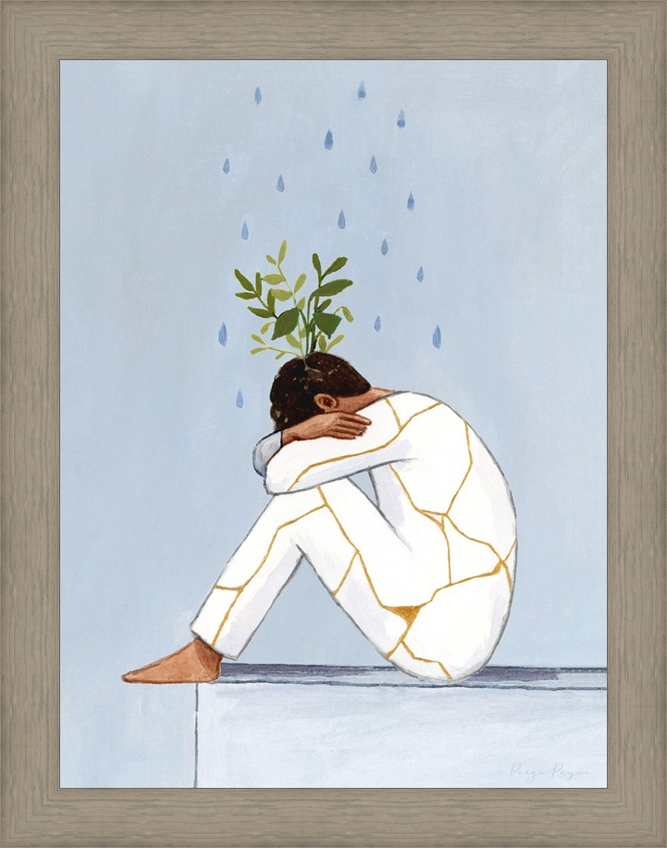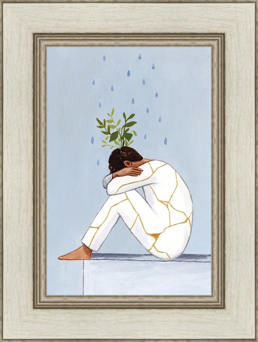 Mental Health Awareness is extremely important to me, and I am passionate about helping anyone who struggles with mental health to feel seen and understood. In this painting you see a man with his knees curled to his chest. Rain pours on him, and Kintsugi ("golden joinery") covers his clothes. Greenery grows out his head, his head that he often feels is broken beyond repair. Learning about Kintsugi has helped me to reframe my mental illness. Instead of ‘what is wrong with me’ or ‘why am I so messed up’, I have begun to say ‘this is what makes me special’ and ‘my mental health struggles have made me compassionate to others, and have helped me grow into something beautiful.’
