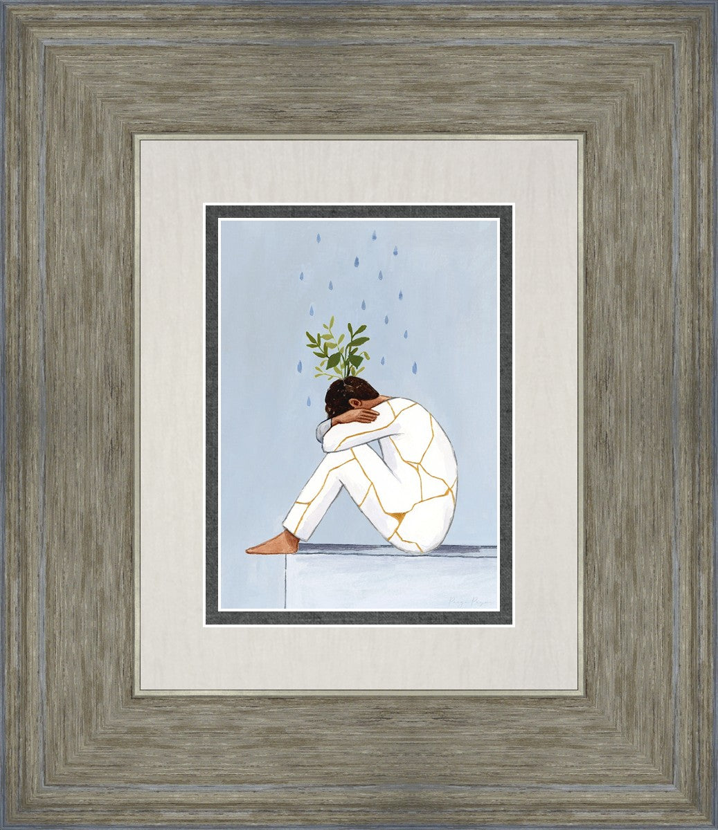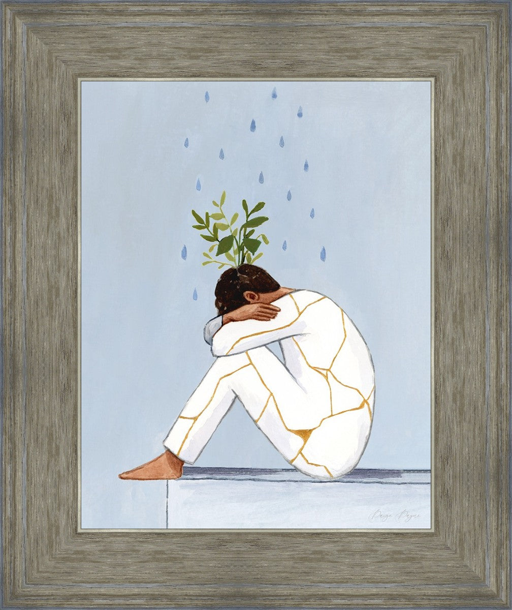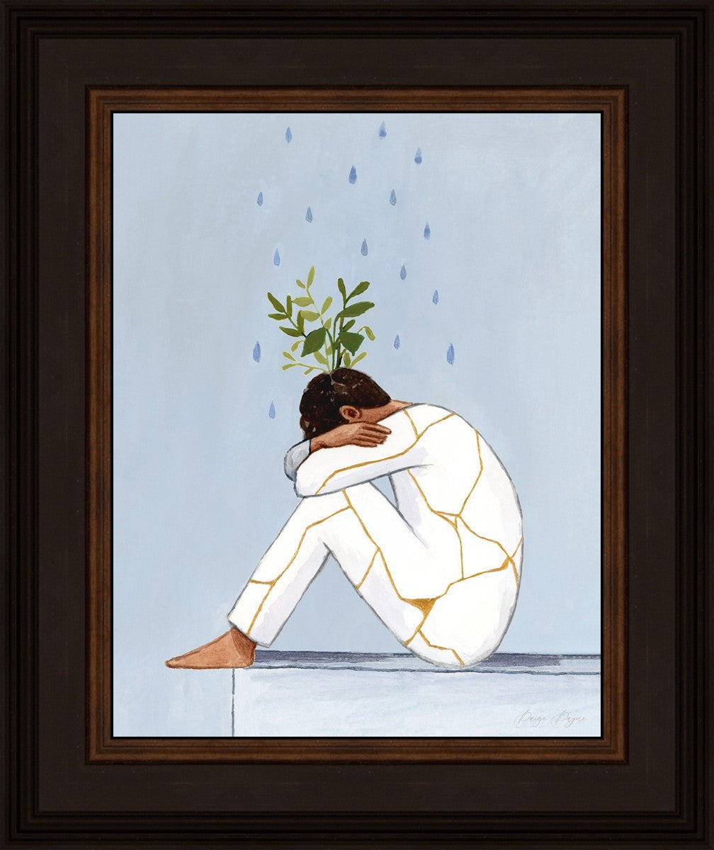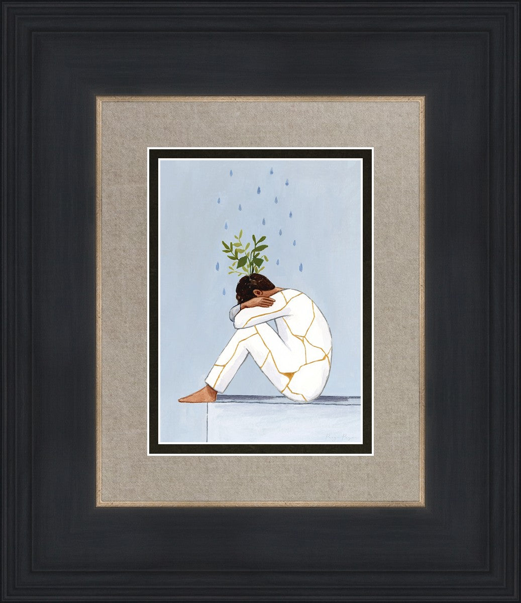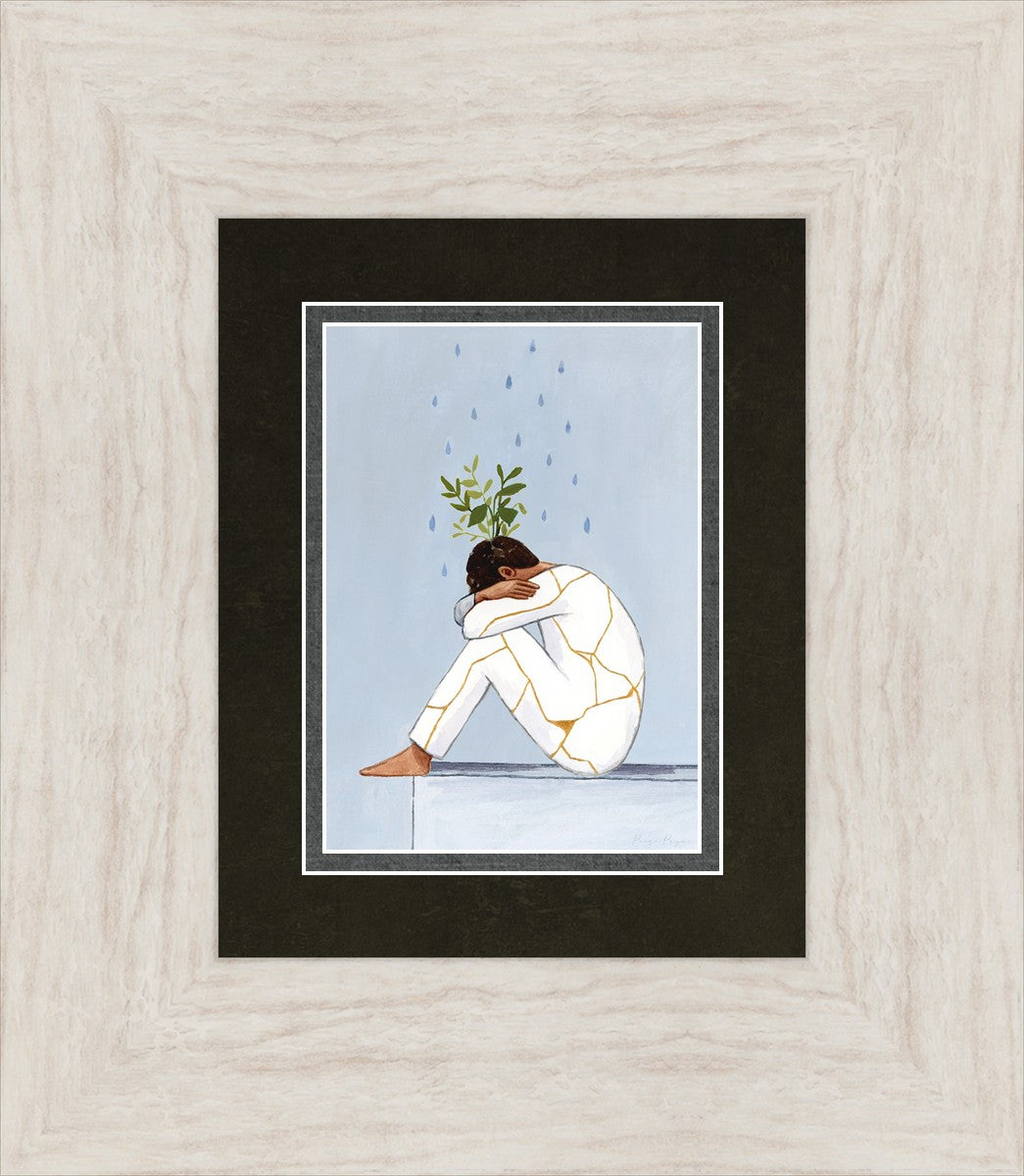 Mental Health Awareness is extremely important to me, and I am passionate about helping anyone who struggles with mental health to feel seen and understood. In this painting you see a man with his knees curled to his chest. Rain pours on him, and Kintsugi ("golden joinery") covers his clothes. Greenery grows out his head, his head that he often feels is broken beyond repair. Learning about Kintsugi has helped me to reframe my mental illness. Instead of ‘what is wrong with me’ or ‘why am I so messed up’, I have begun to say ‘this is what makes me special’ and ‘my mental health struggles have made me compassionate to others, and have helped me grow into something beautiful.’