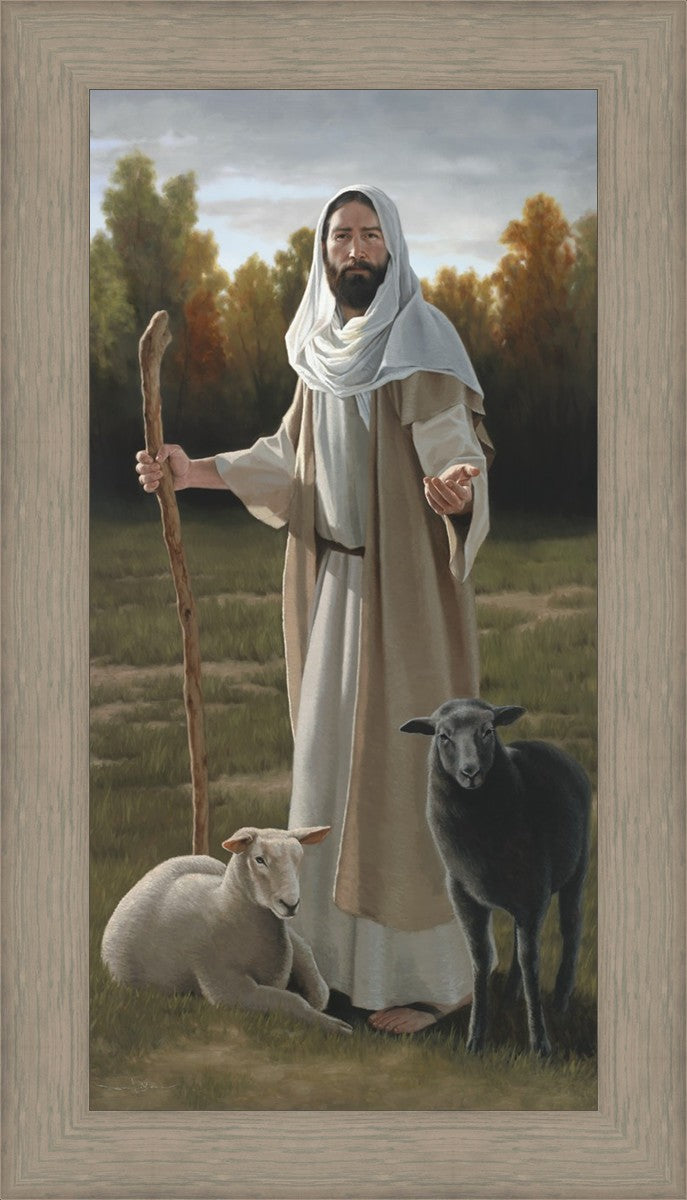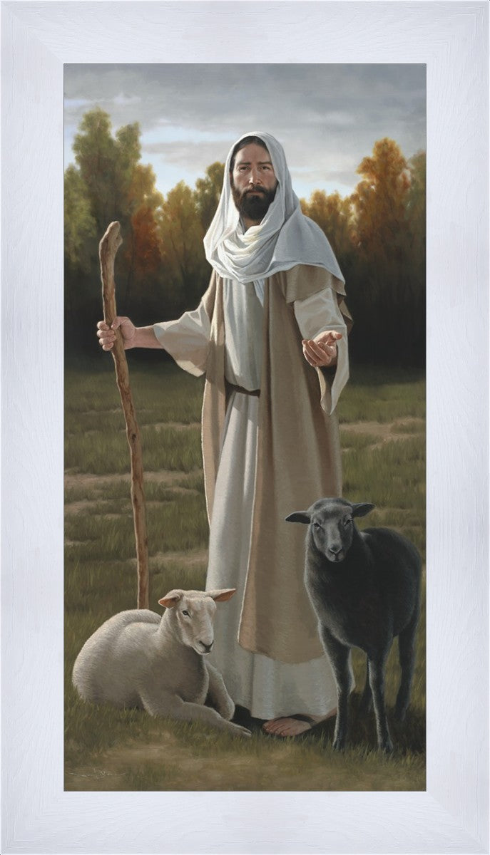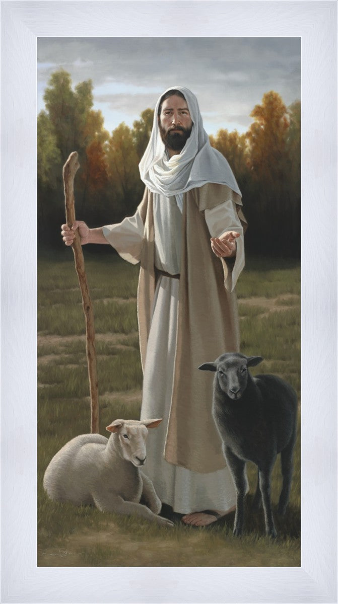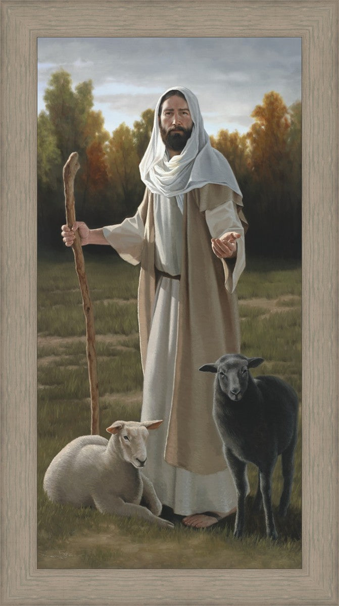 While painting this commission, I reflected on how all of us are white sheep and black sheep. The white sheep isn't bright white - because all of us need cleansing. The dark sheep isn't pure black for there is no darkness that His light cannot reach. There are dark clouds representing the trials in mortality, but Christ will see us through any storm of pain, sorrow, temptation or loss. Our Redeemer's arms are open to all. He is mercifully inviting us to be lead to His light and warmth where we will find healing and rest in Him.