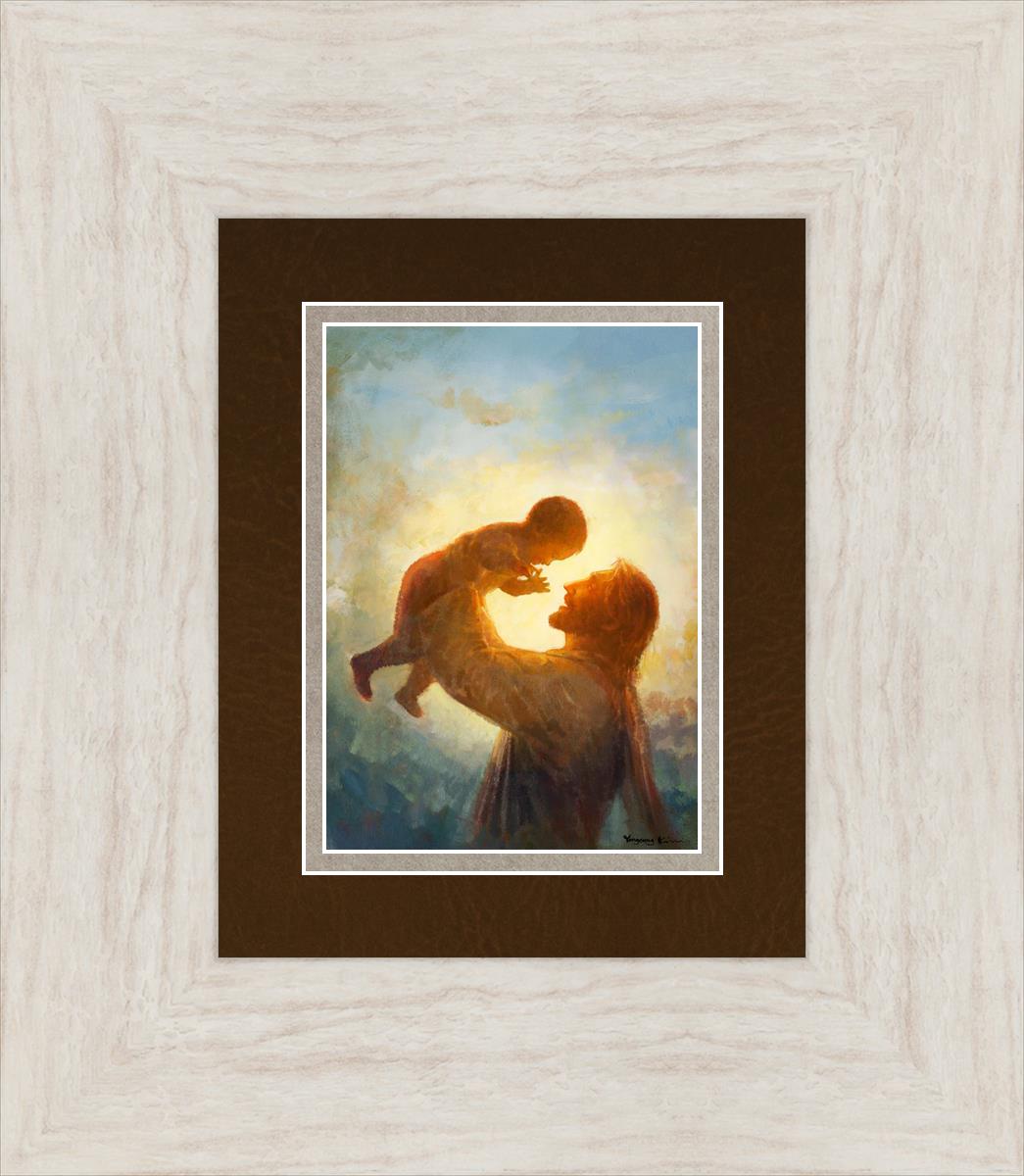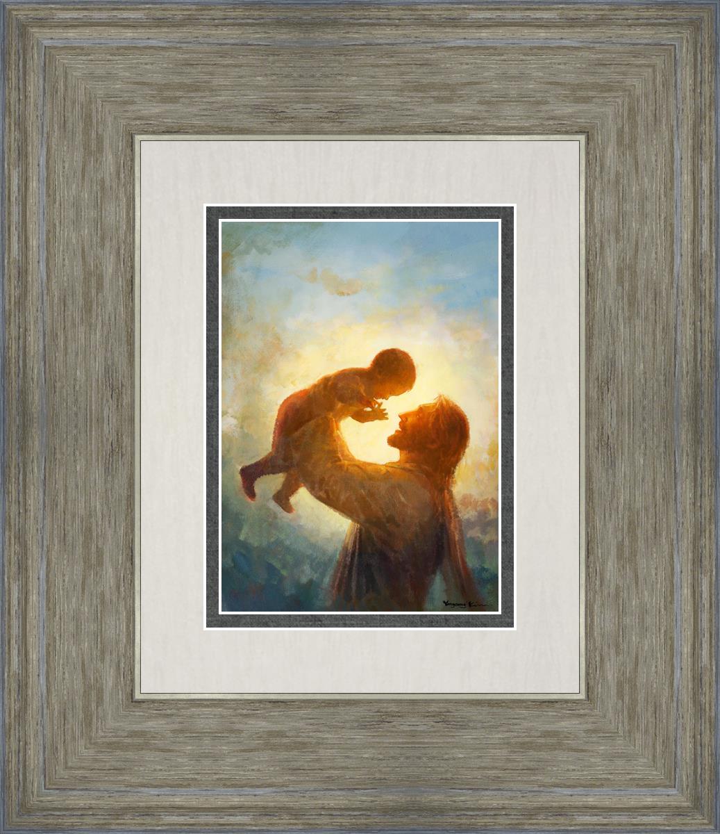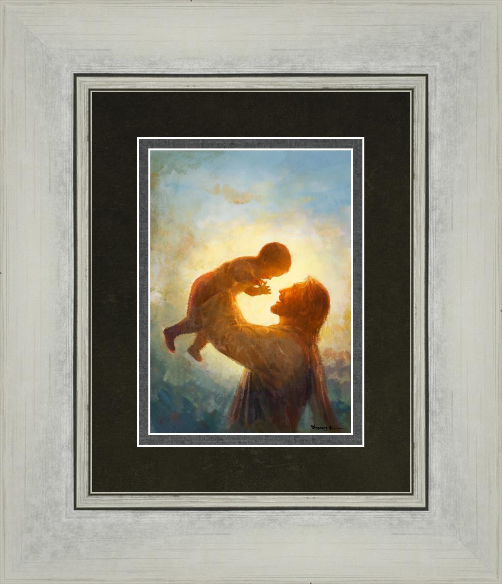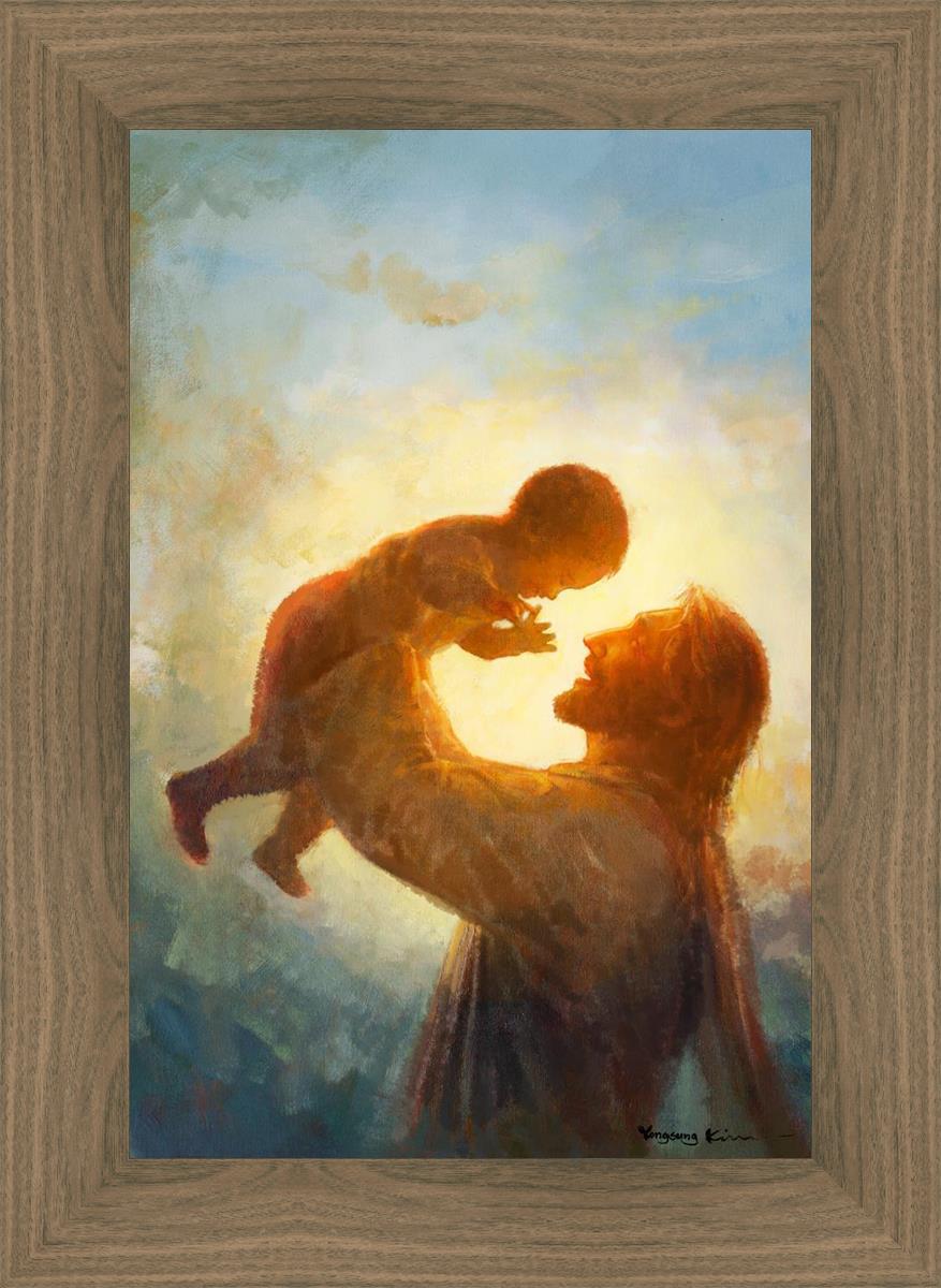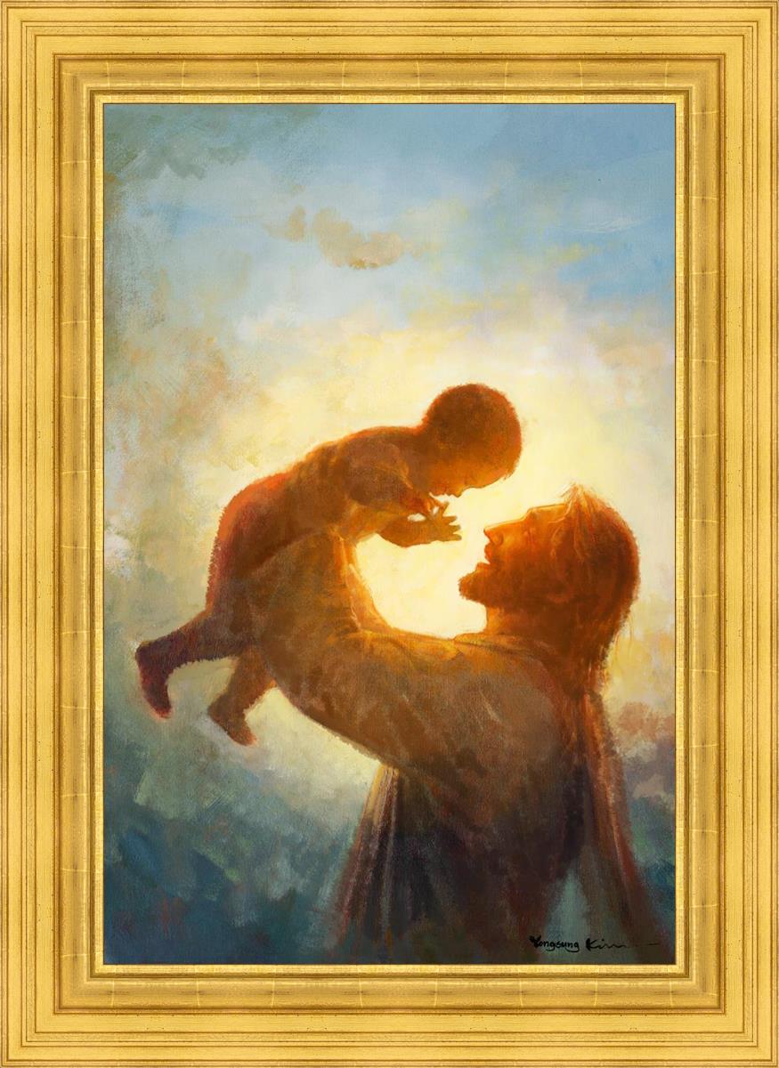 "Heaven's Gift" by Yongsung Kim is a touching painting depicting Christ lifting a child up and smiling, showcasing His love and compassion.