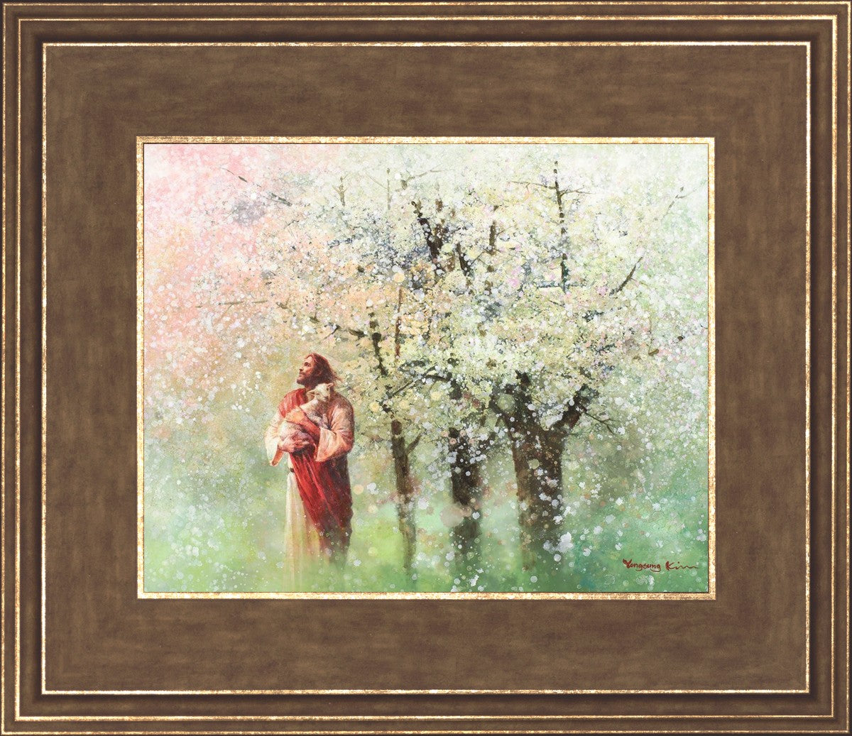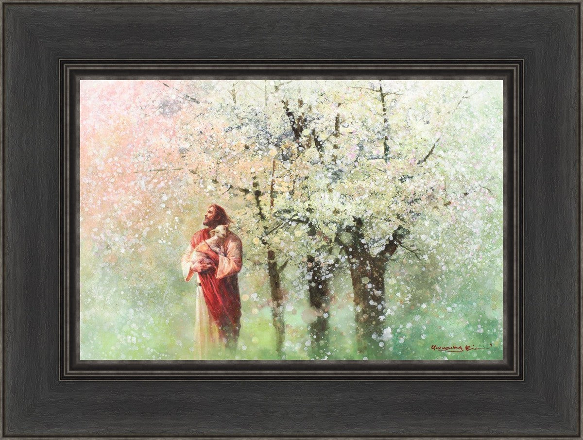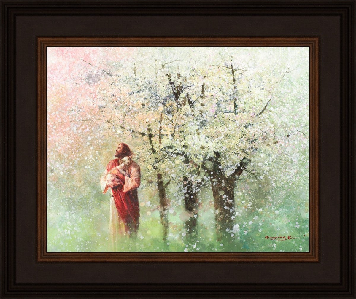 Heavenly Blossoms" by Yongsung Kim portrays Jesus clad in a red robe cradling a lamb near a blossoming tree, symbolizing divine care and renewal.