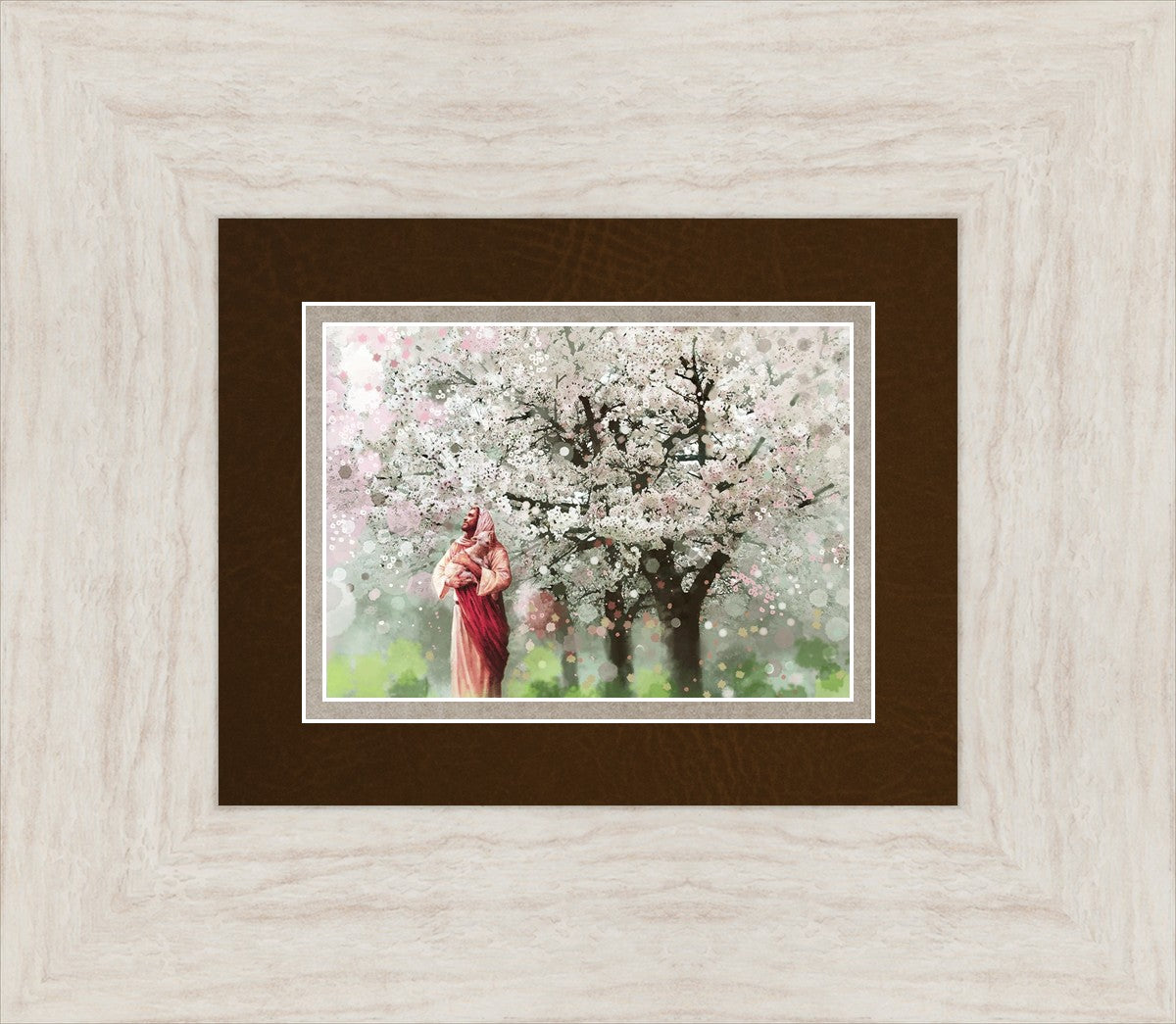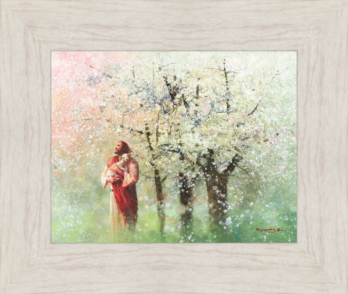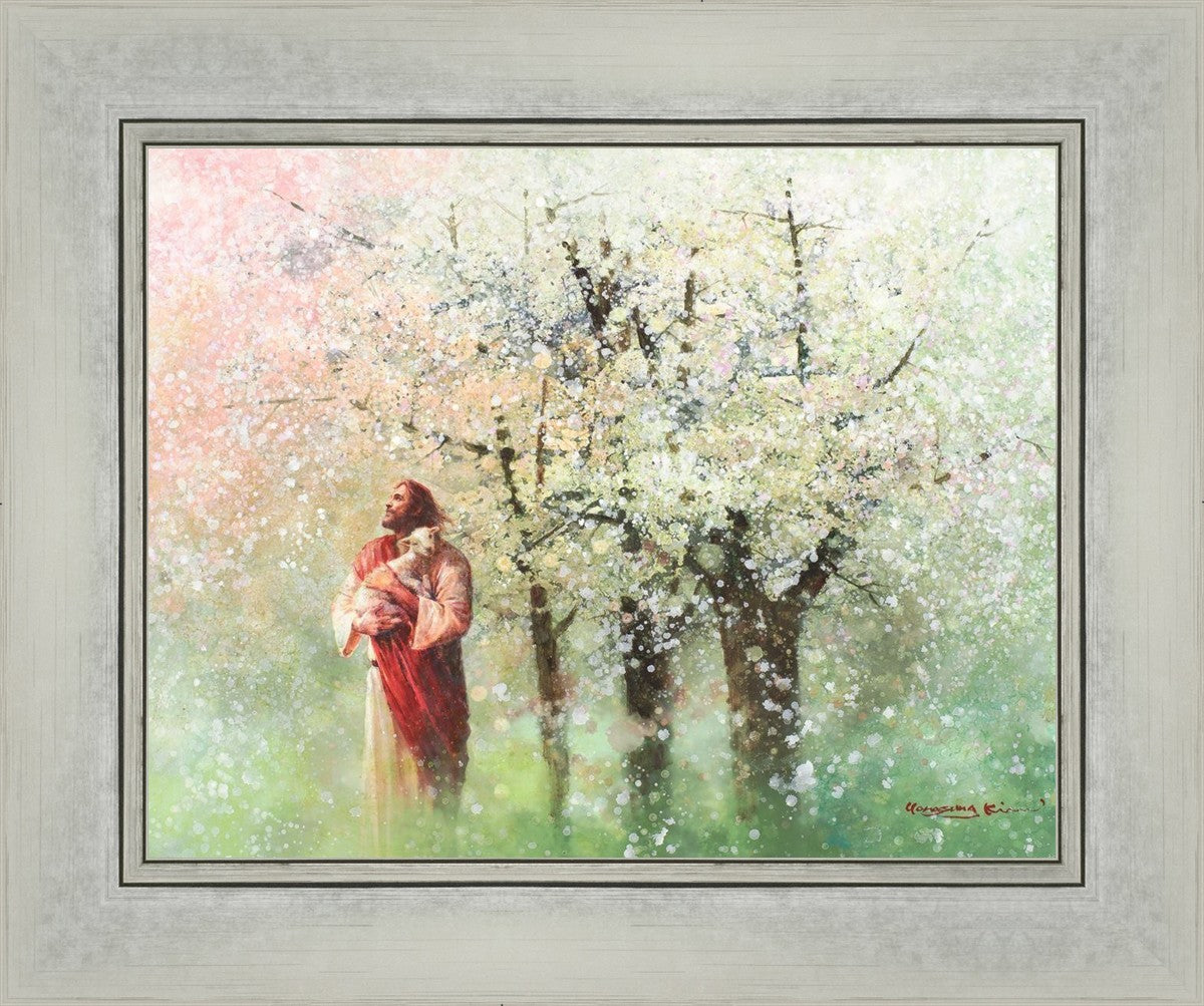 Heavenly Blossoms" by Yongsung Kim portrays Jesus clad in a red robe cradling a lamb near a blossoming tree, symbolizing divine care and renewal.