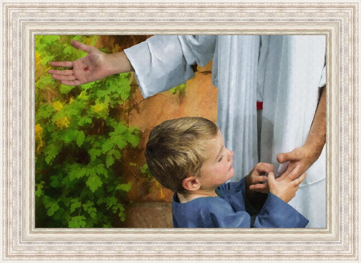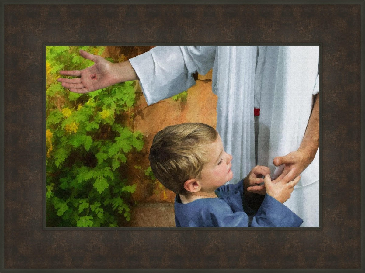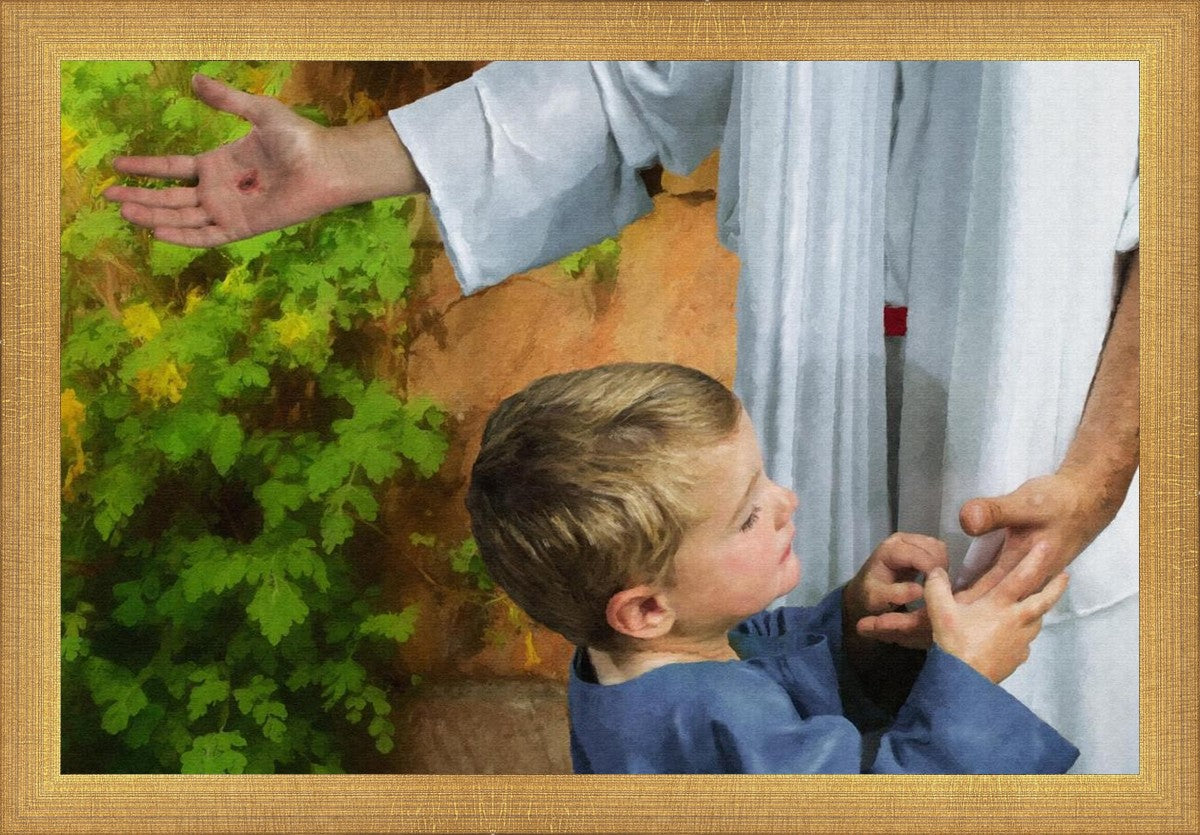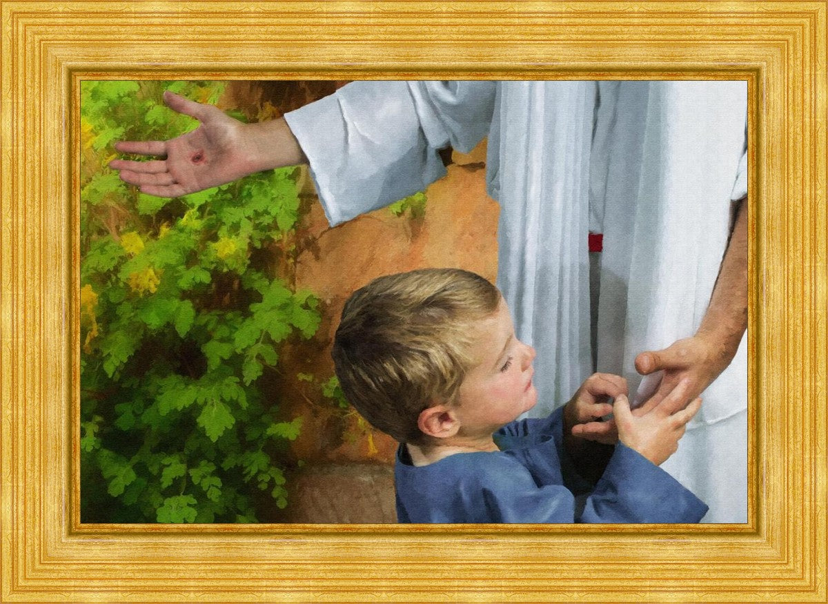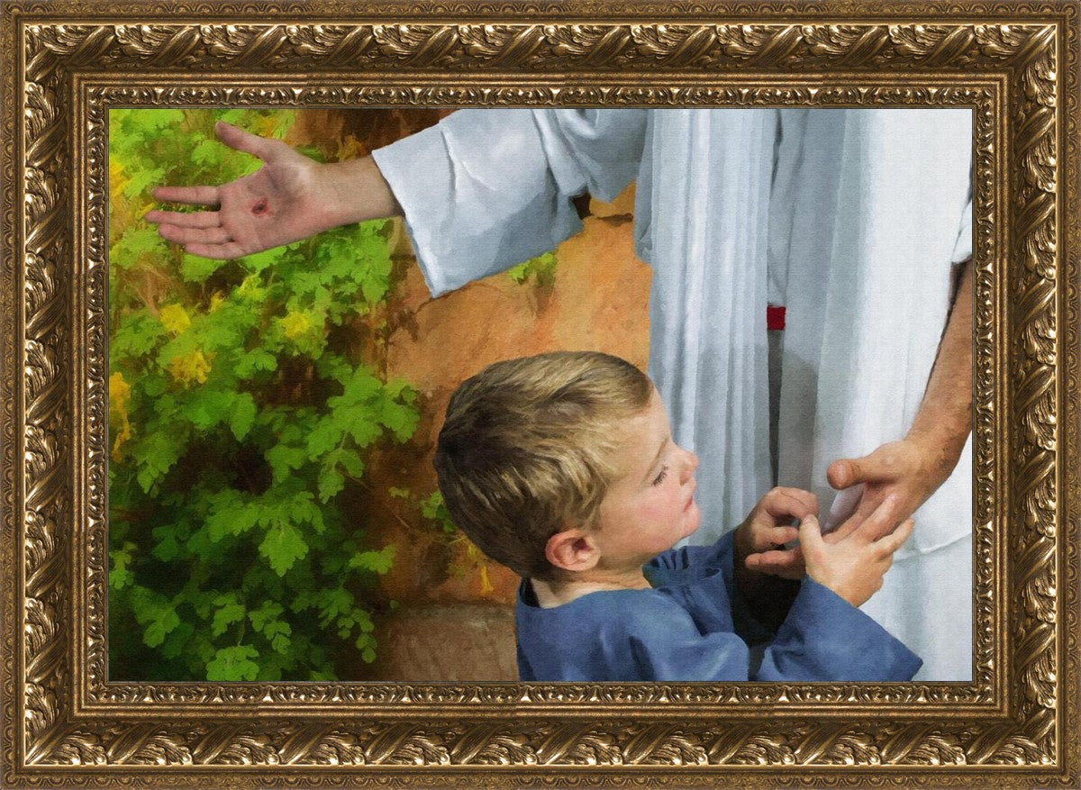 A little boy who is looking at the hands of Christ and asking him did it hurt.