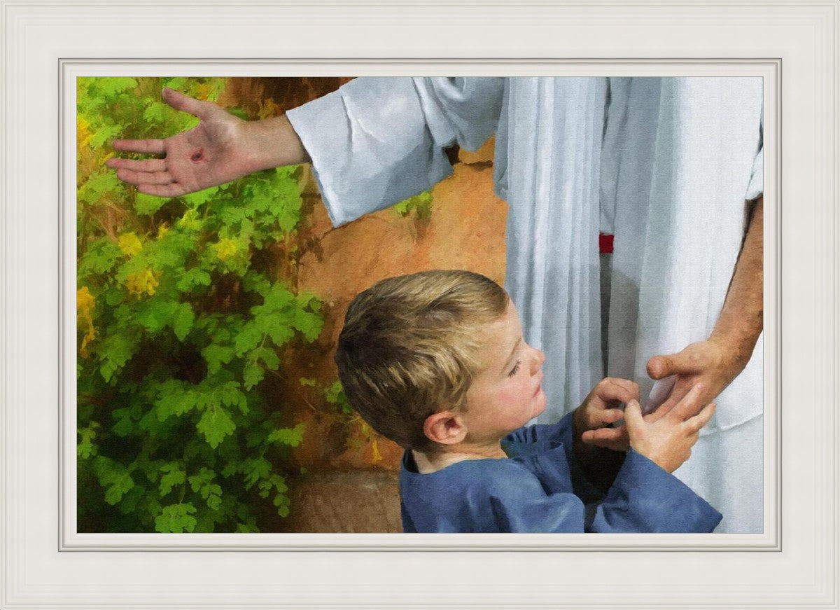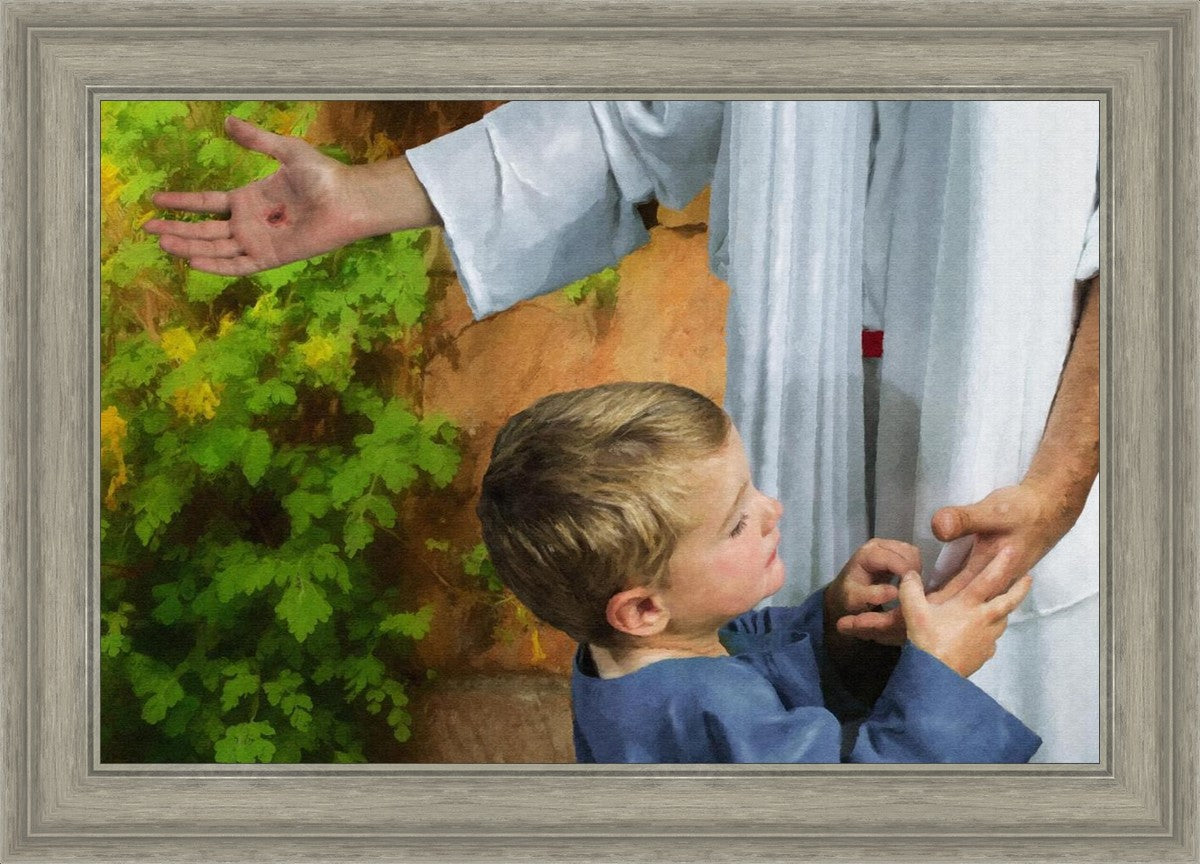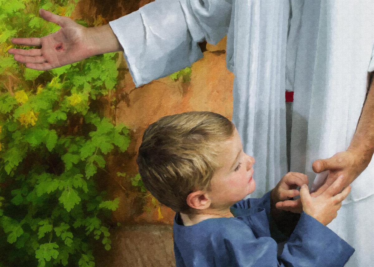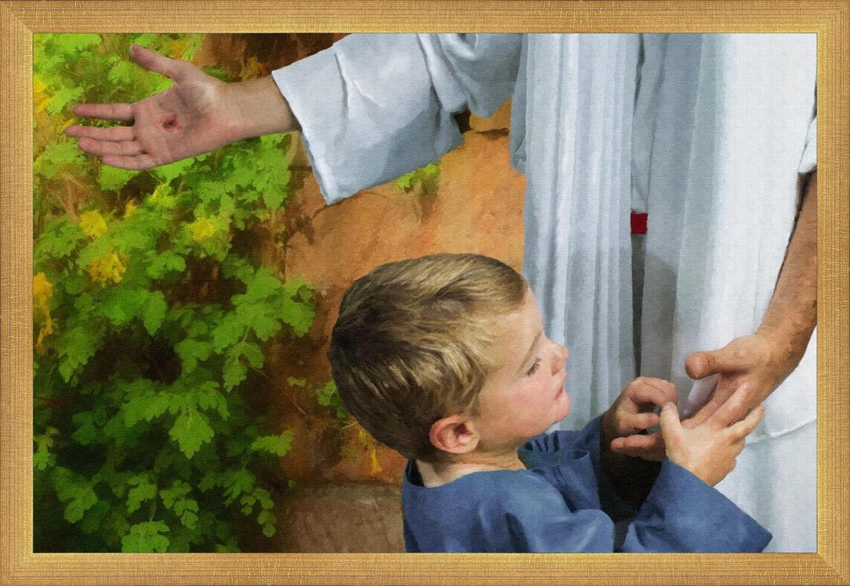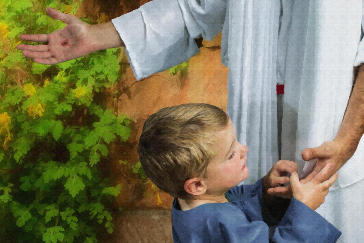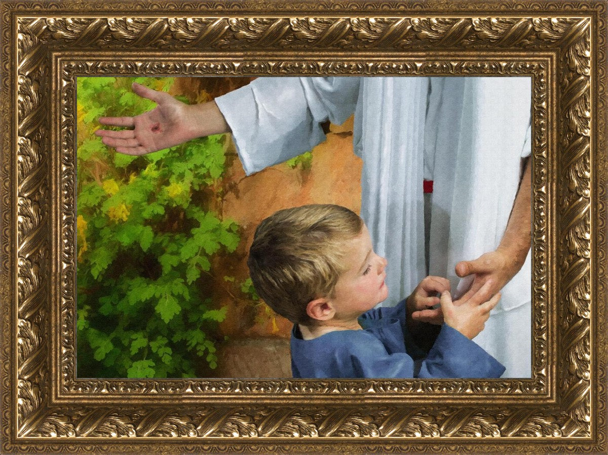 A little boy who is looking at the hands of Christ and asking him did it hurt.