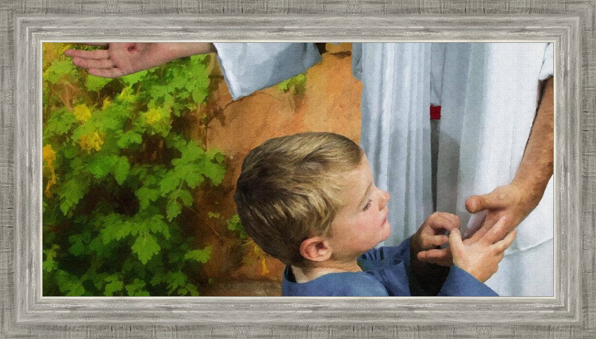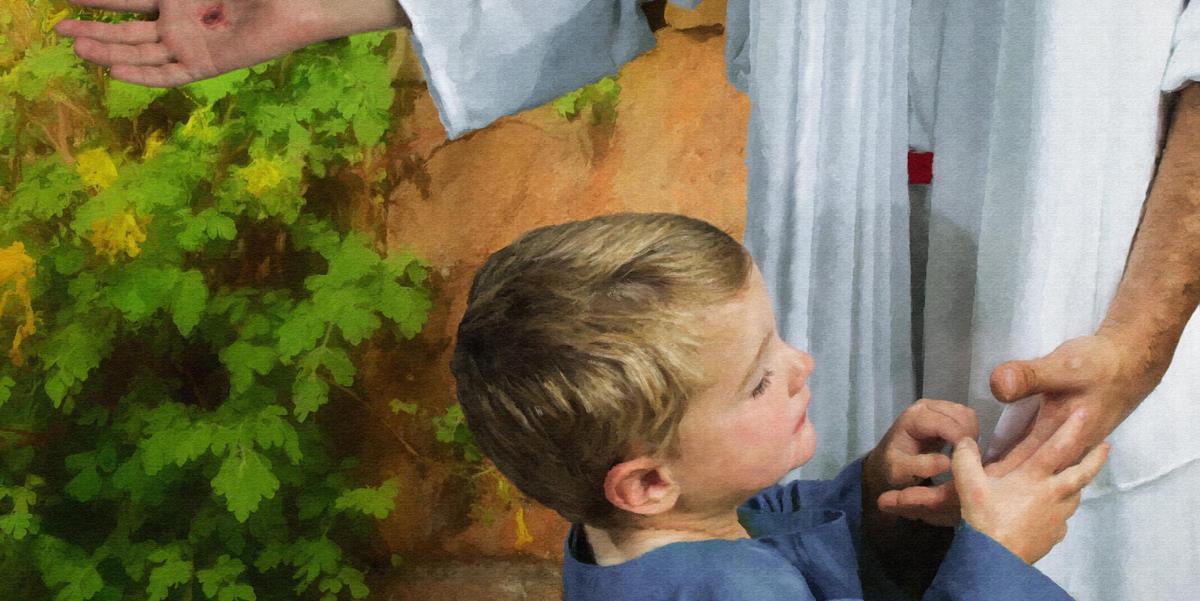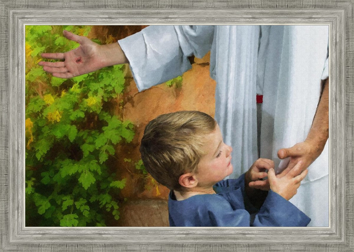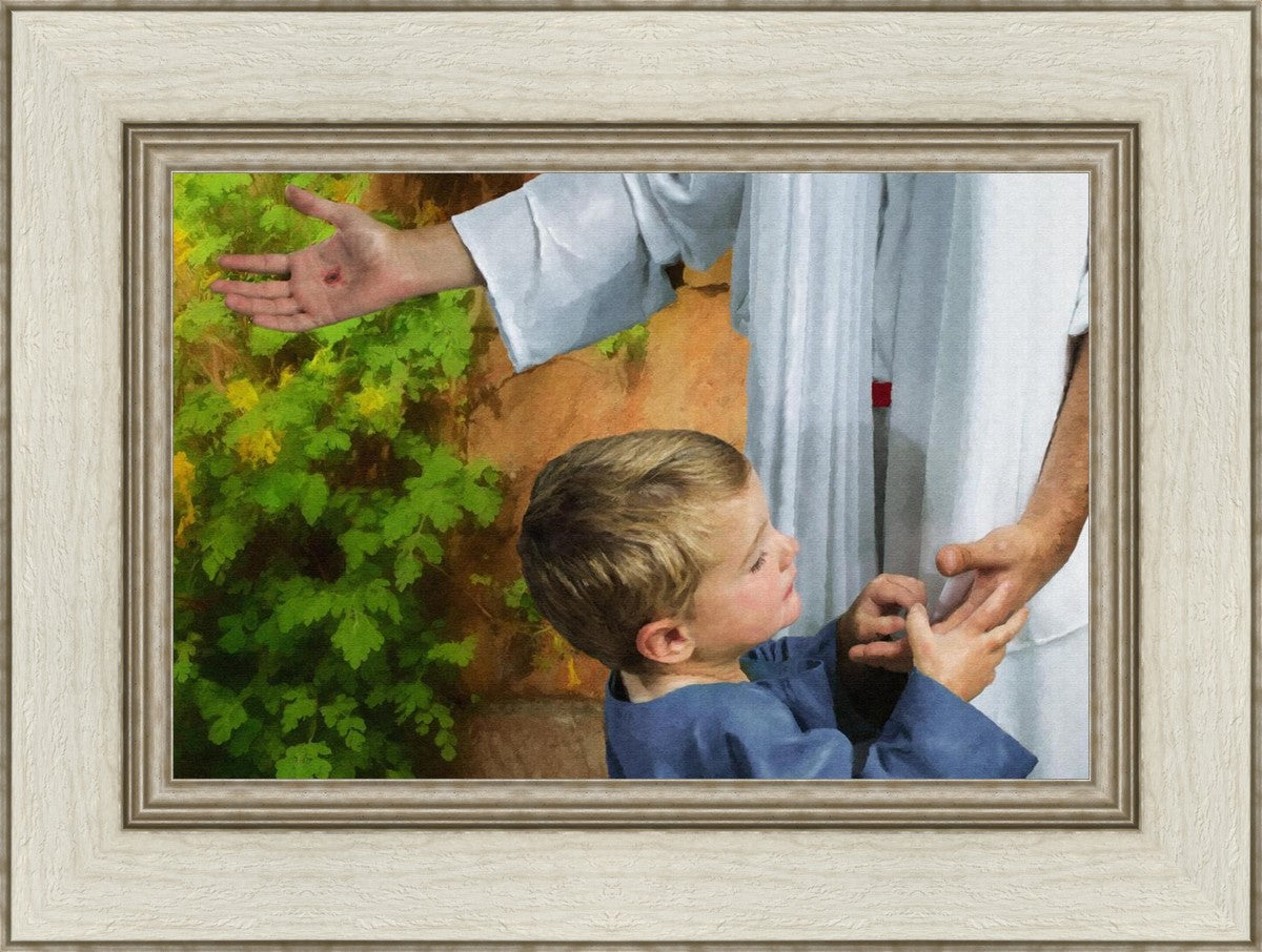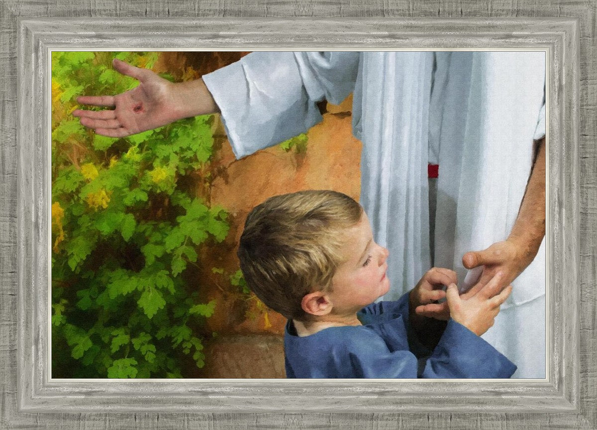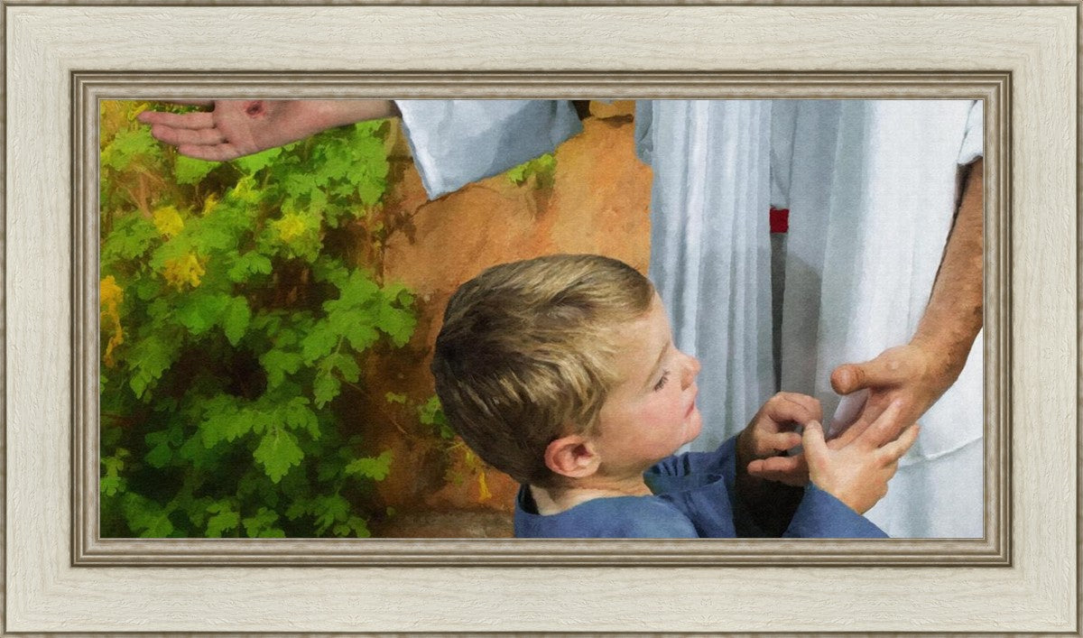 A little boy who is looking at the hands of Christ and asking him did it hurt.