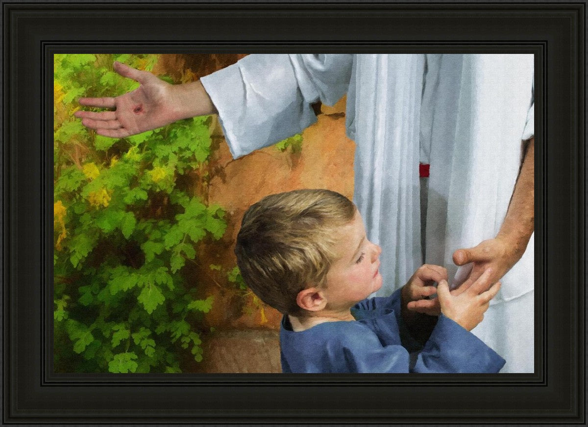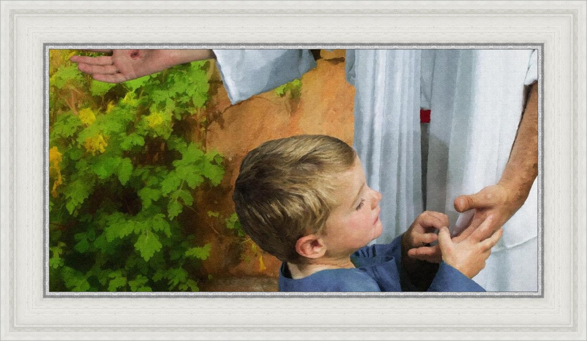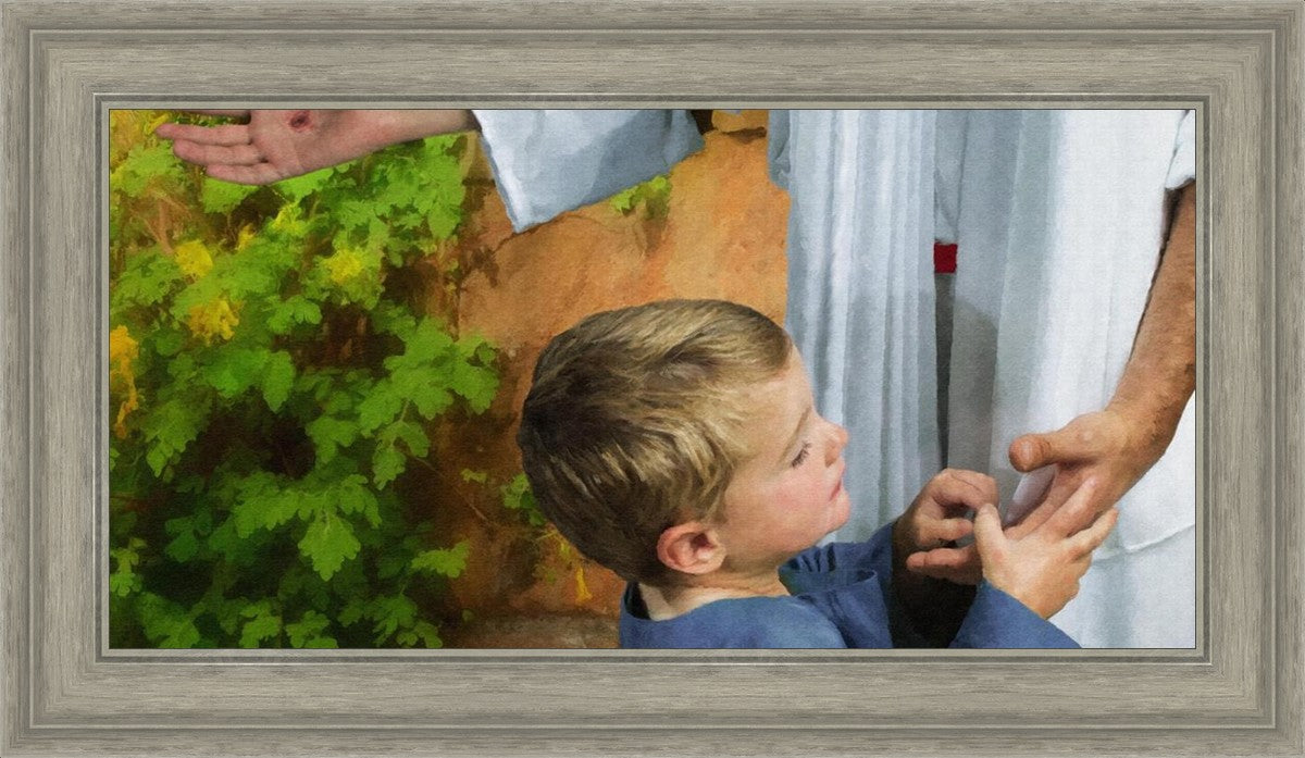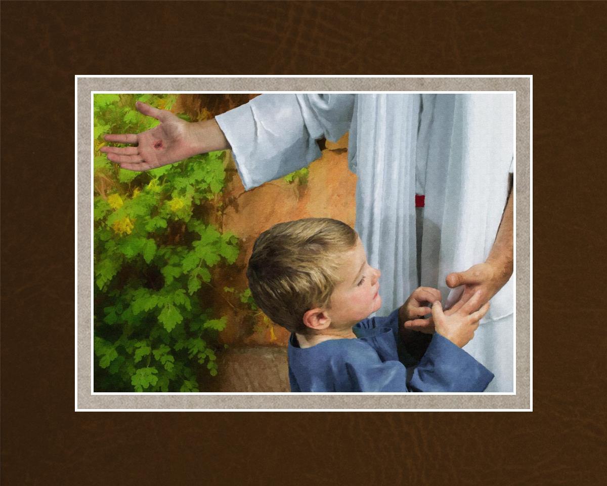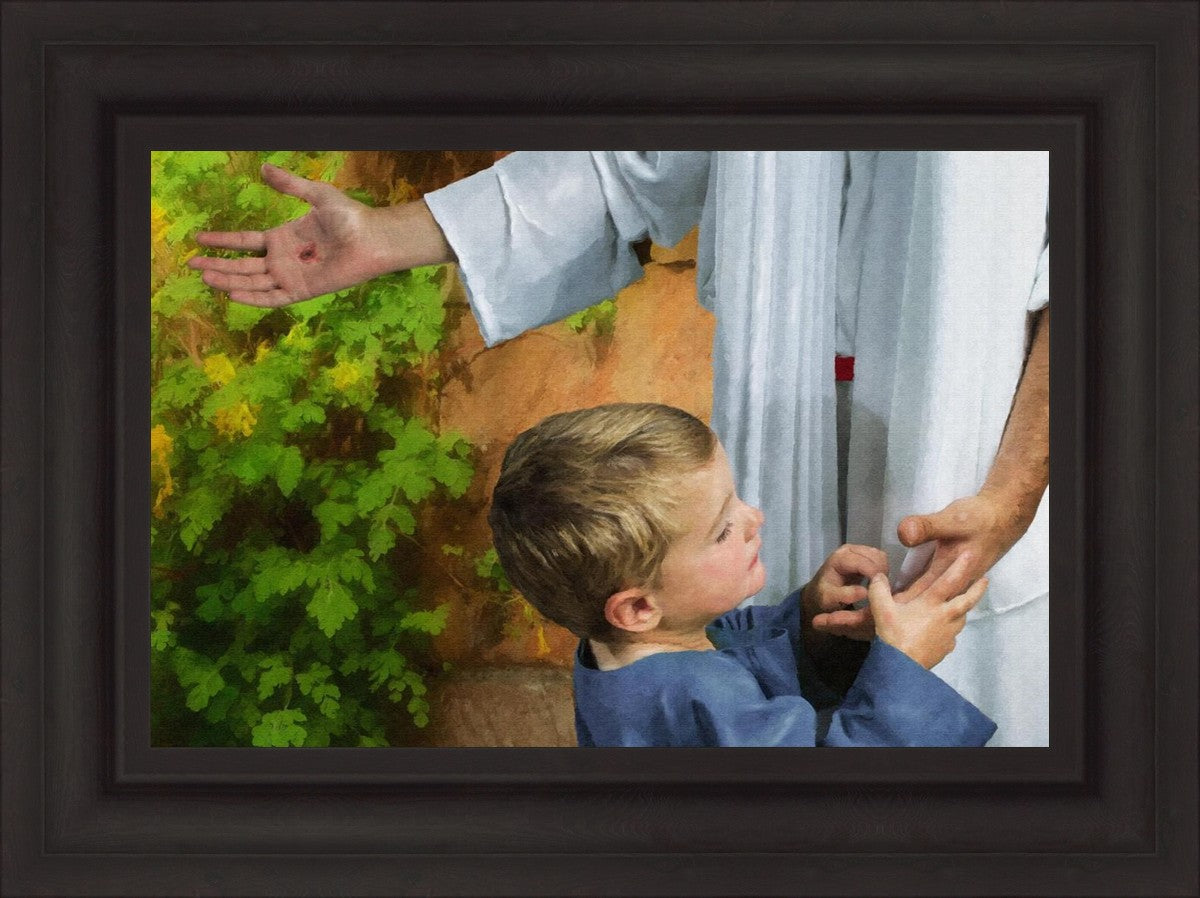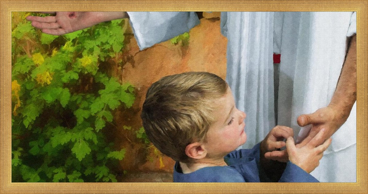 A little boy who is looking at the hands of Christ and asking him did it hurt.