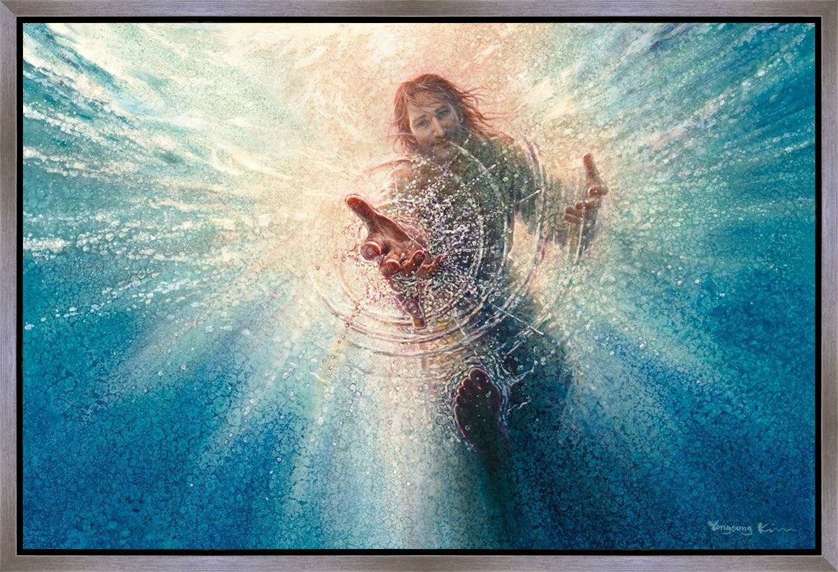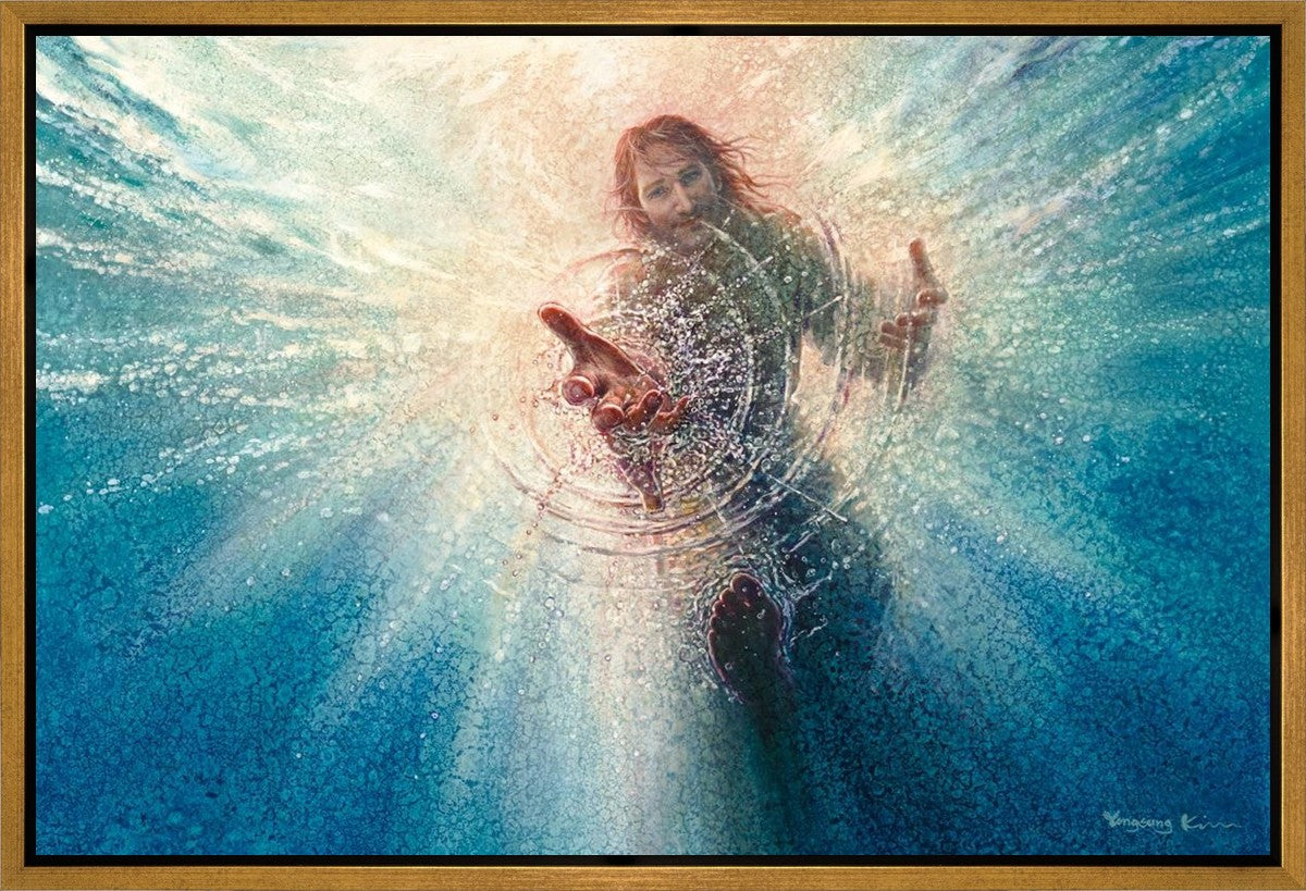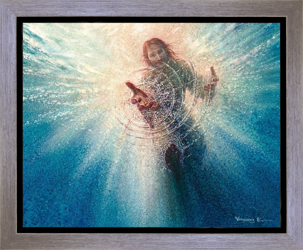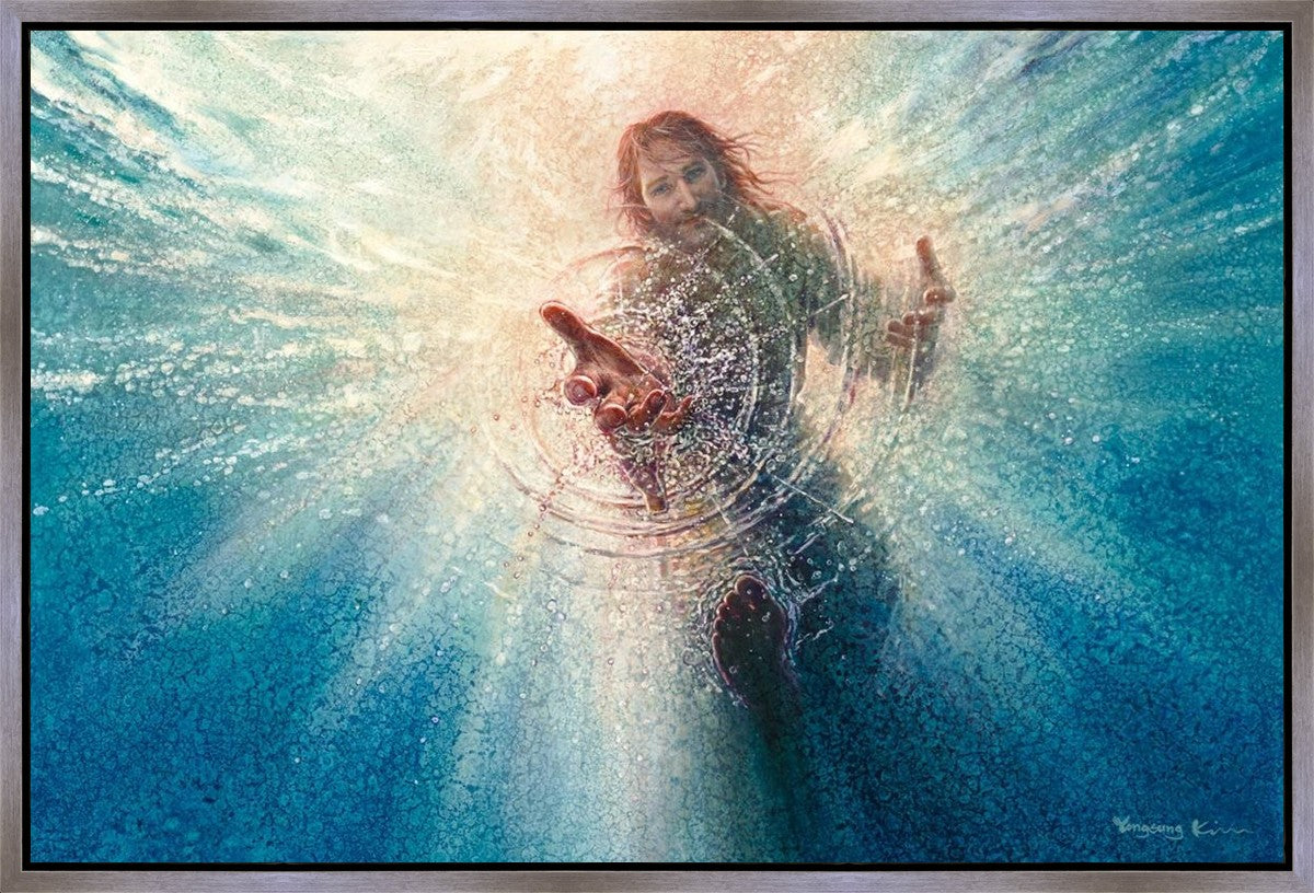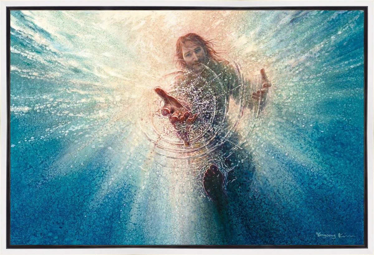 Yongsung Kim's 'His Mighty Hand' painting portrays the powerful scene of Jesus rescuing Peter from drowning.