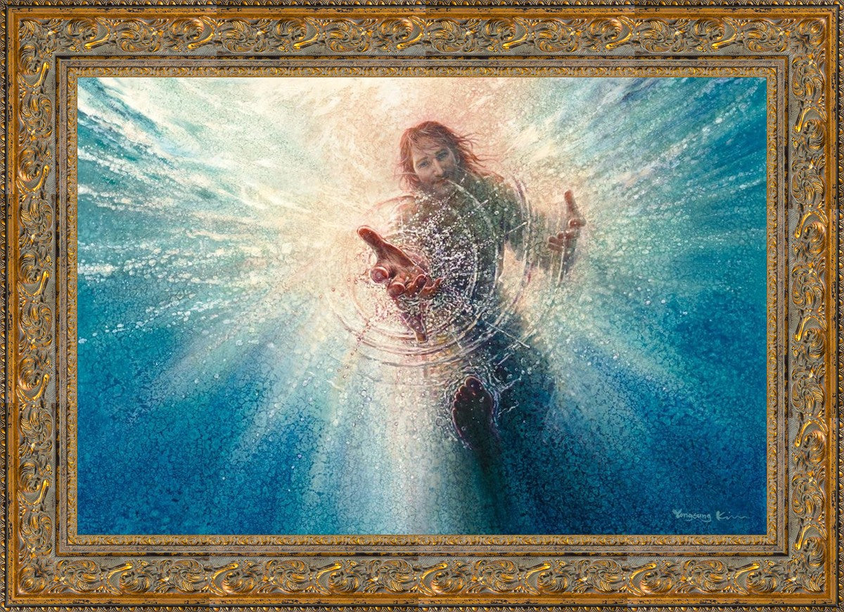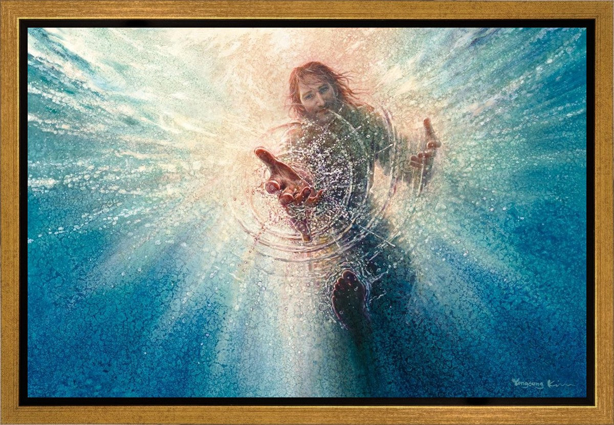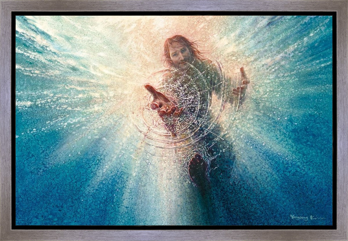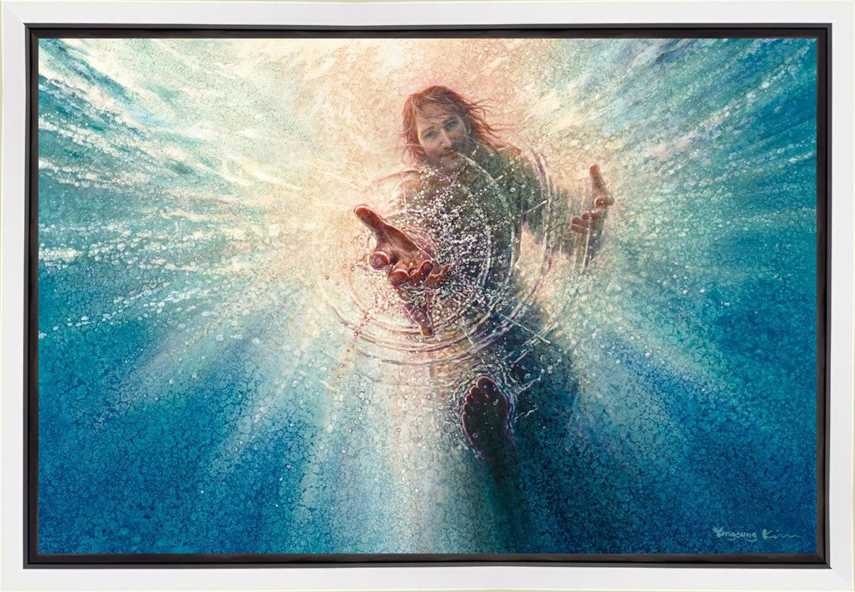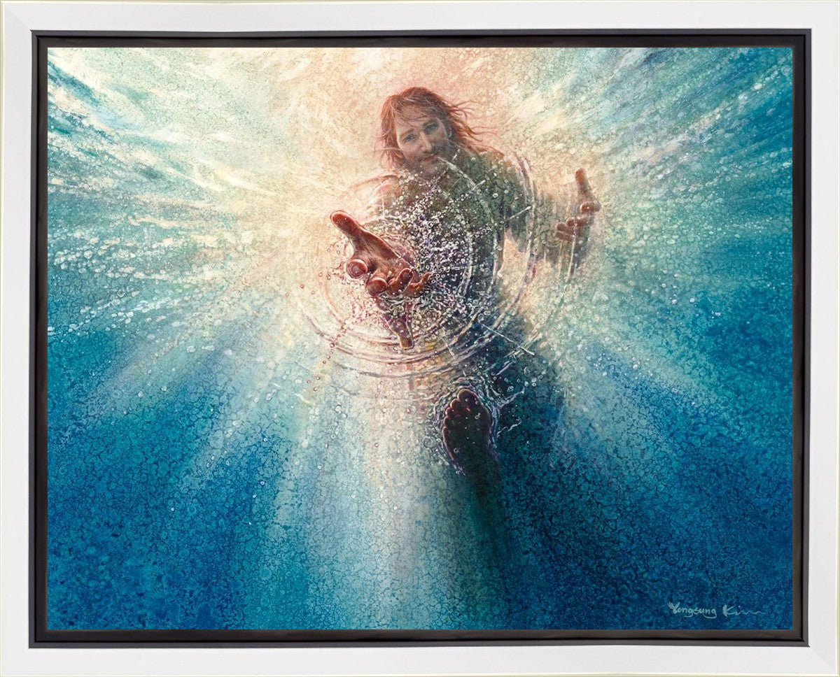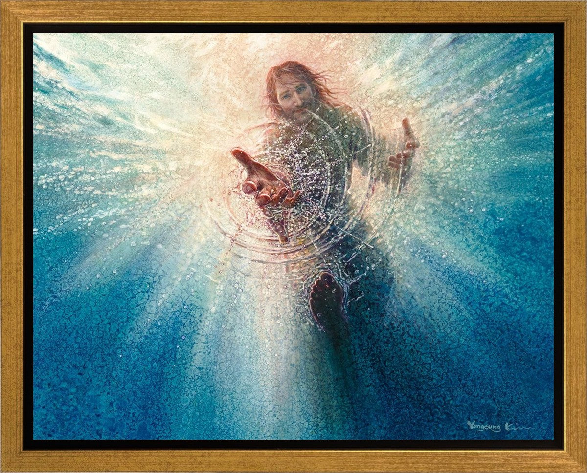Yongsung Kim's 'His Mighty Hand' painting portrays the powerful scene of Jesus rescuing Peter from drowning.