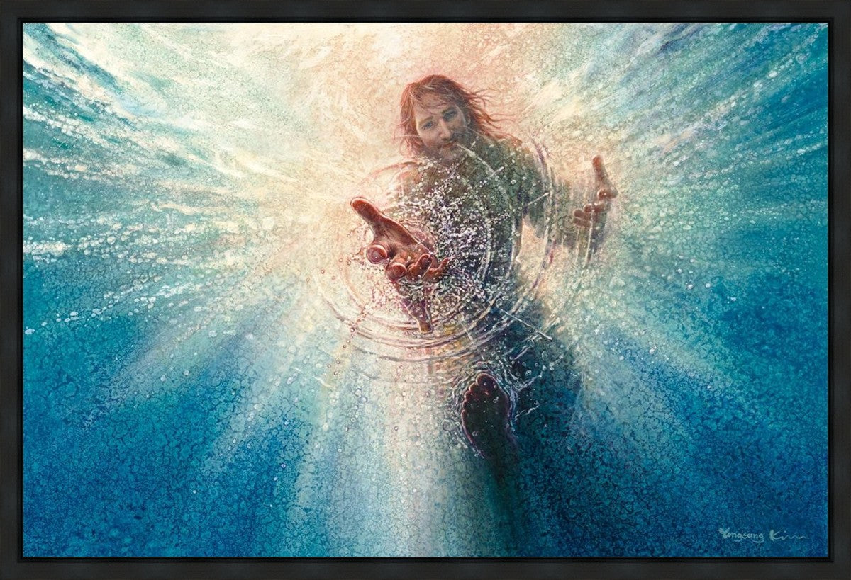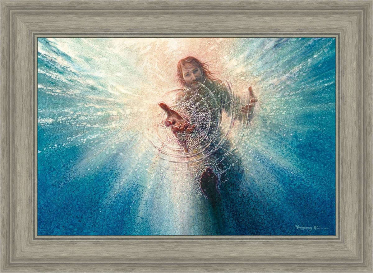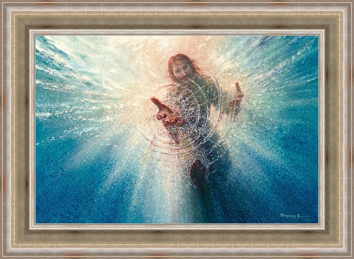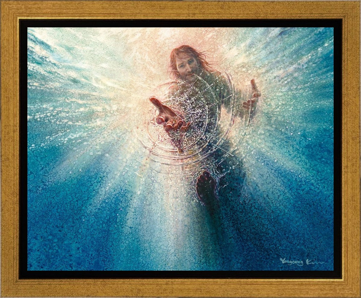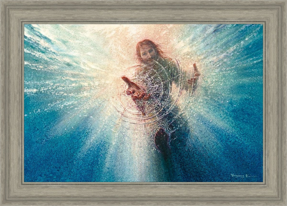 Yongsung Kim's 'His Mighty Hand' painting portrays the powerful scene of Jesus rescuing Peter from drowning.