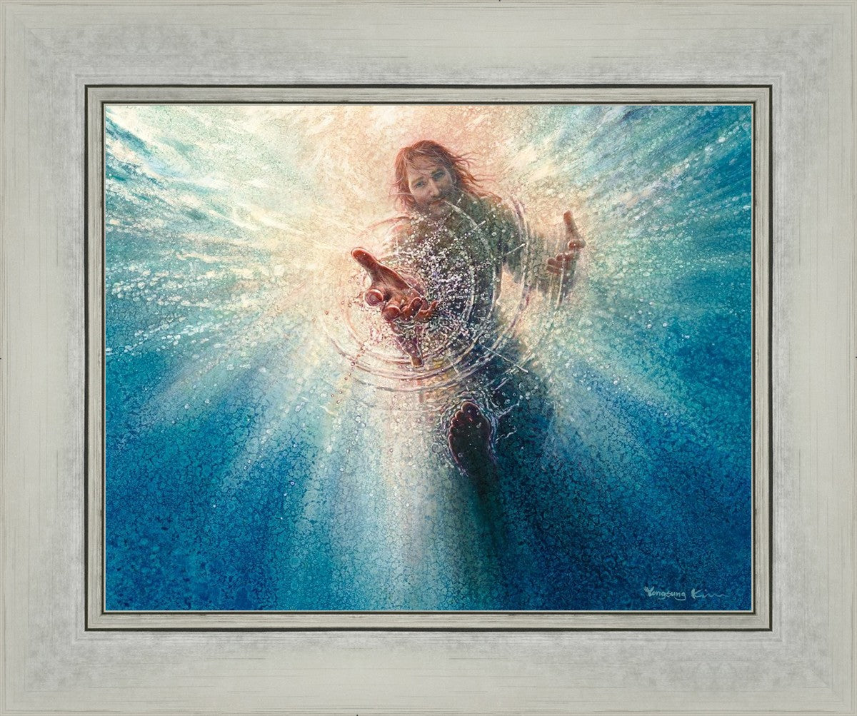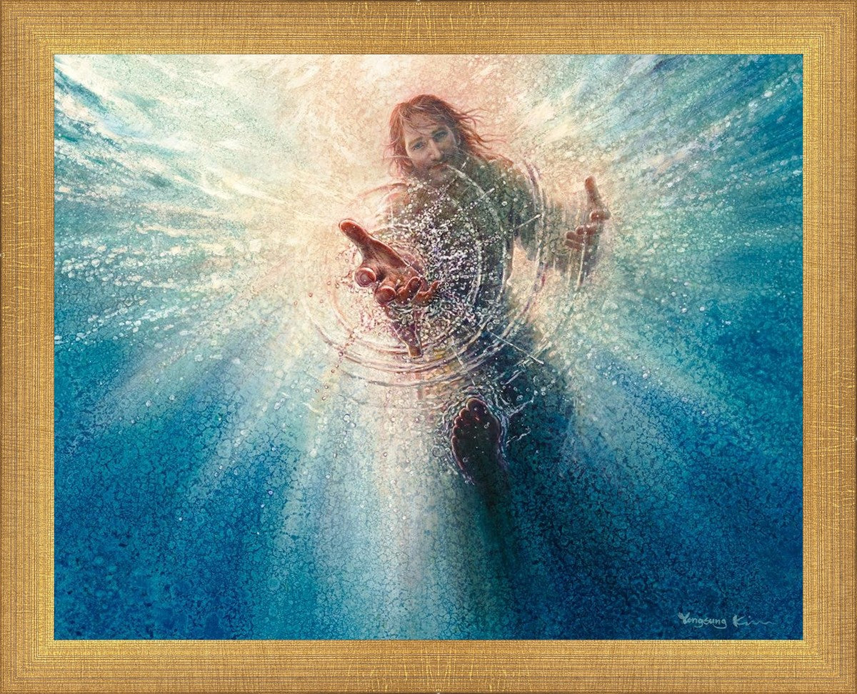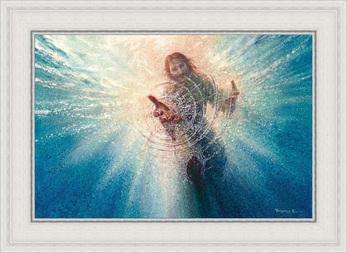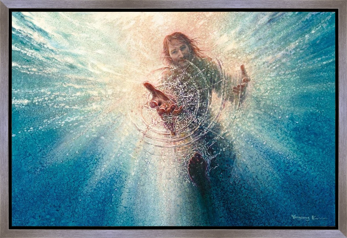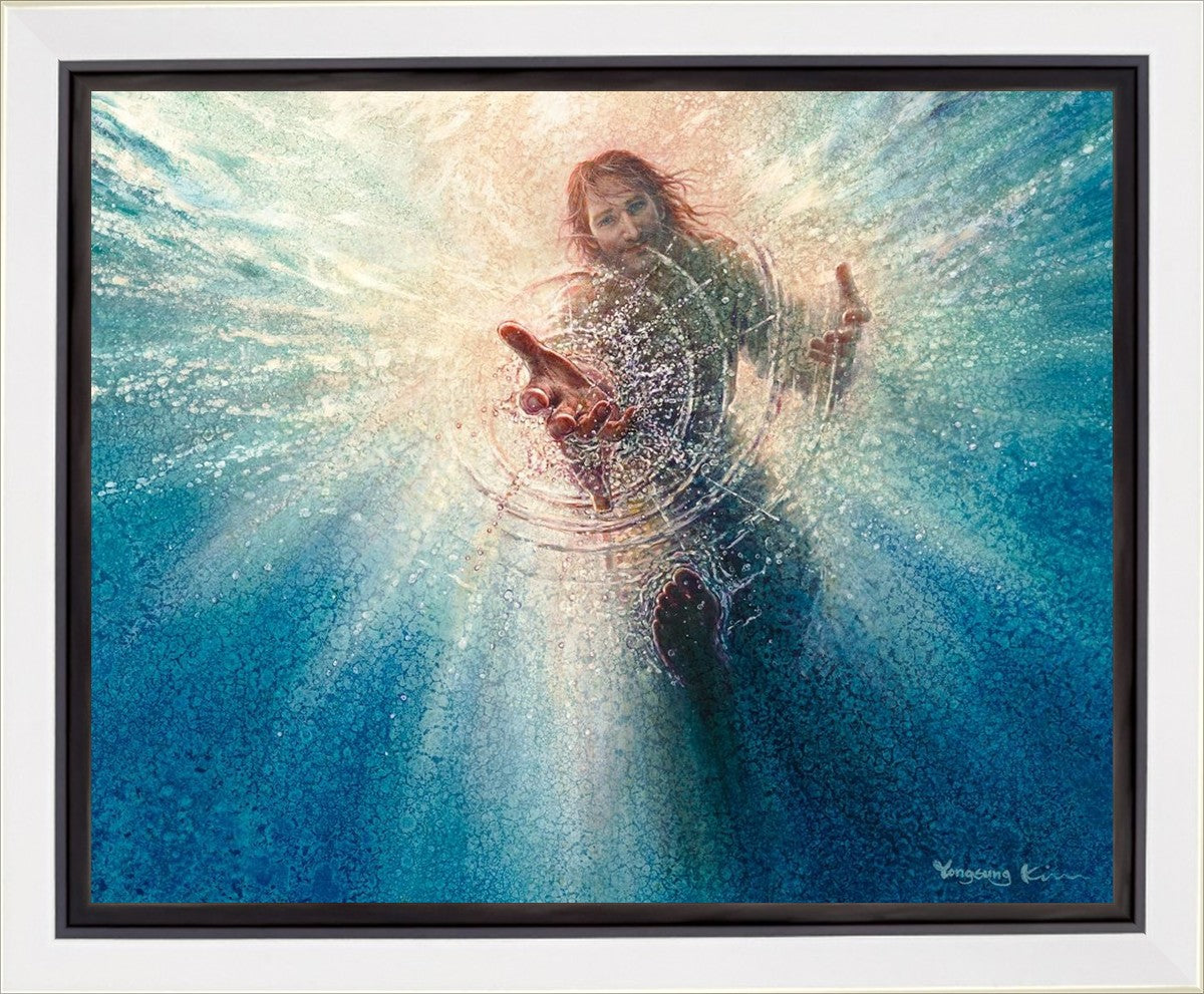 Yongsung Kim's 'His Mighty Hand' painting portrays the powerful scene of Jesus rescuing Peter from drowning.