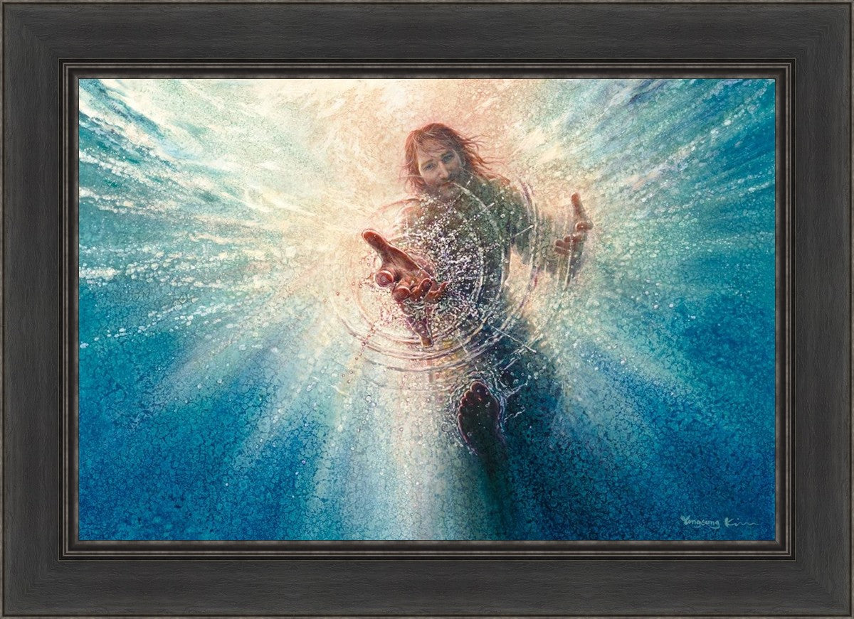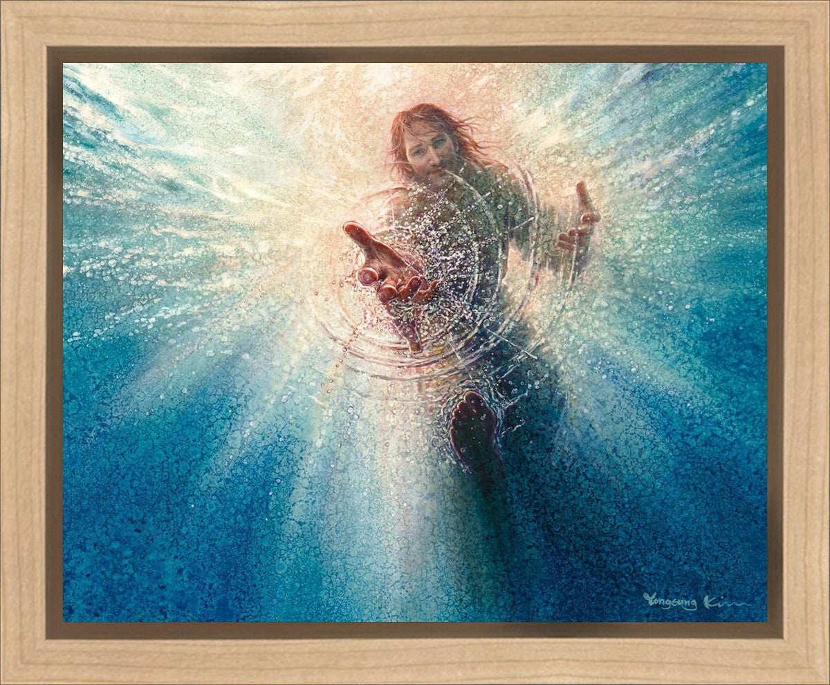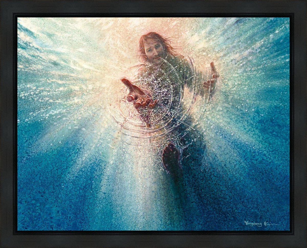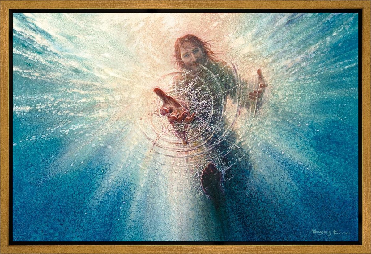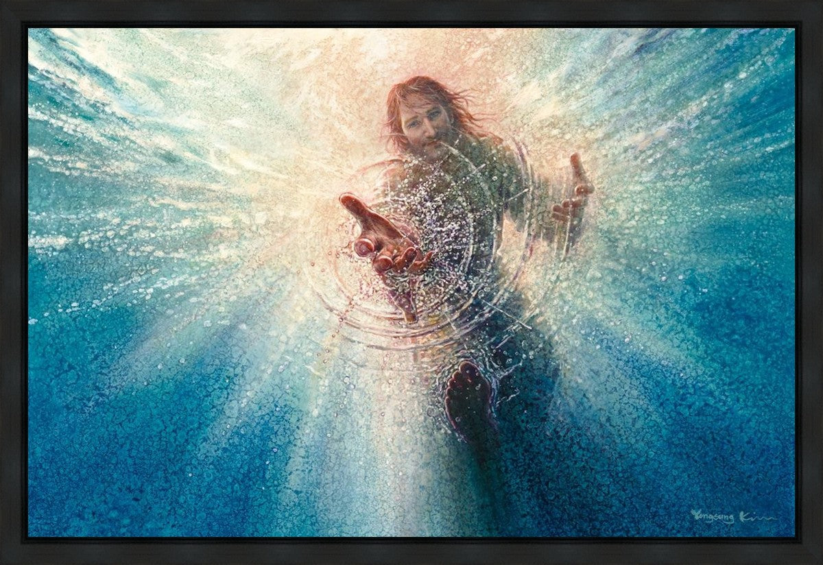 Yongsung Kim's 'His Mighty Hand' painting portrays the powerful scene of Jesus rescuing Peter from drowning.