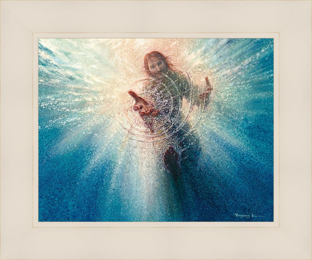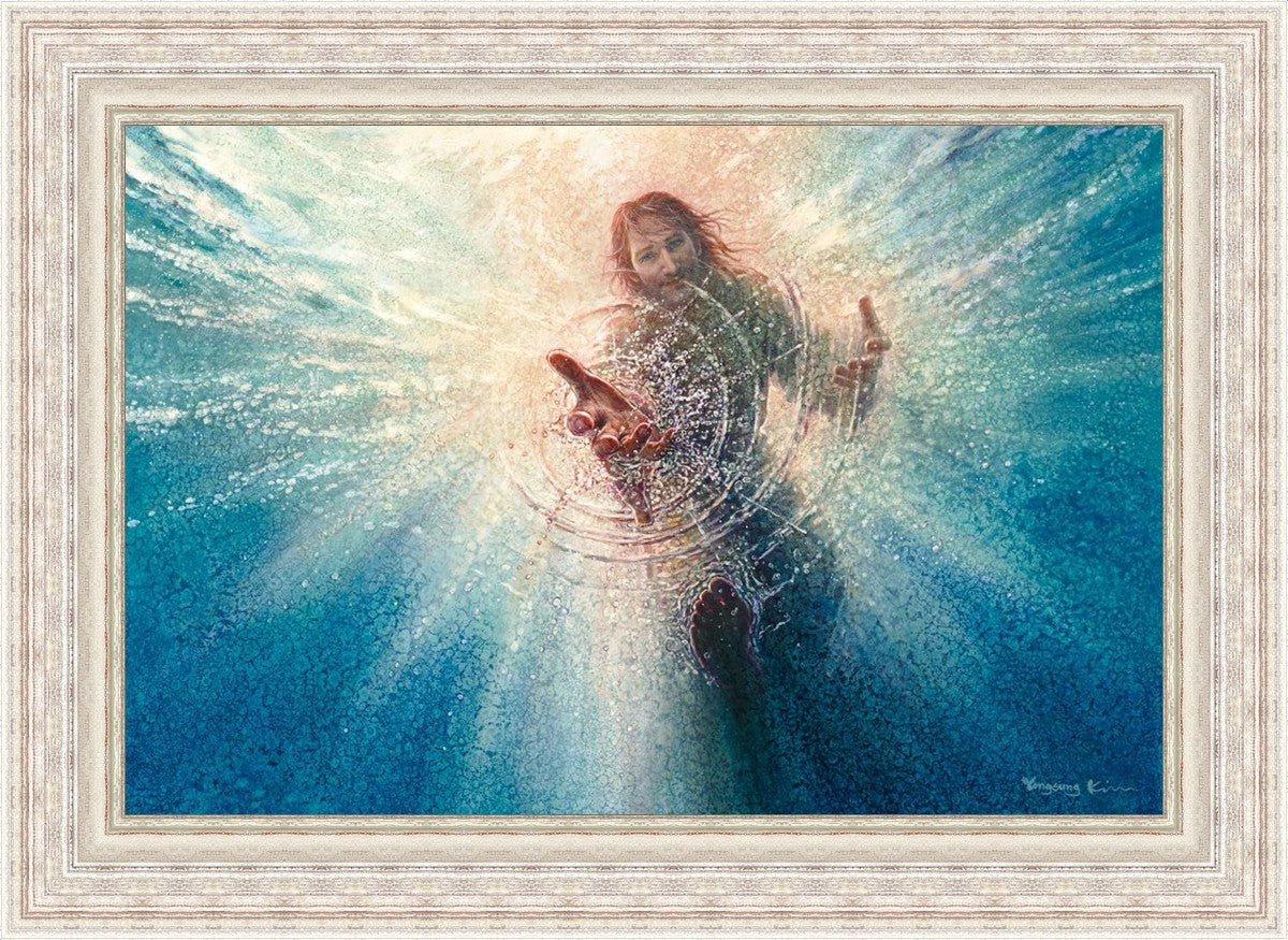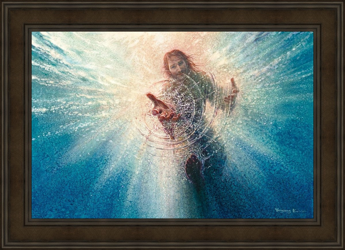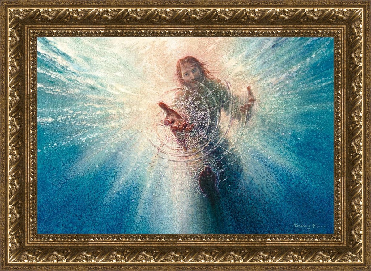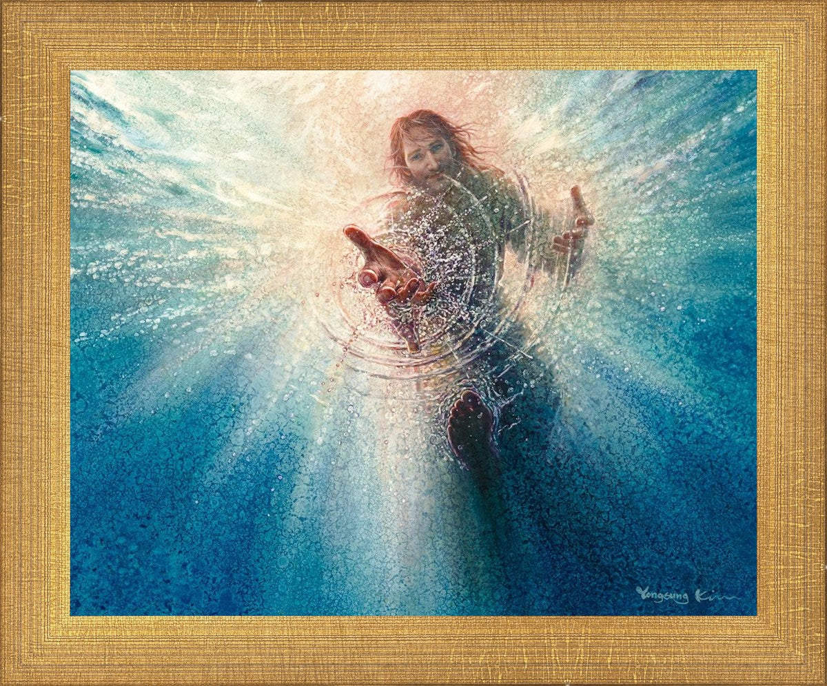 Yongsung Kim's 'His Mighty Hand' painting portrays the powerful scene of Jesus rescuing Peter from drowning.