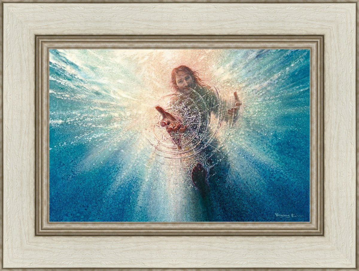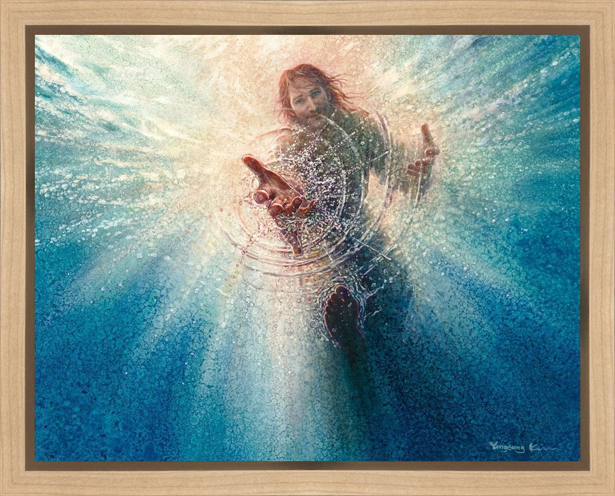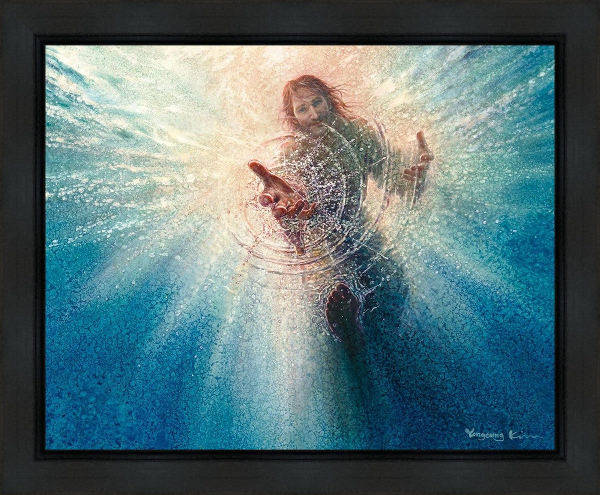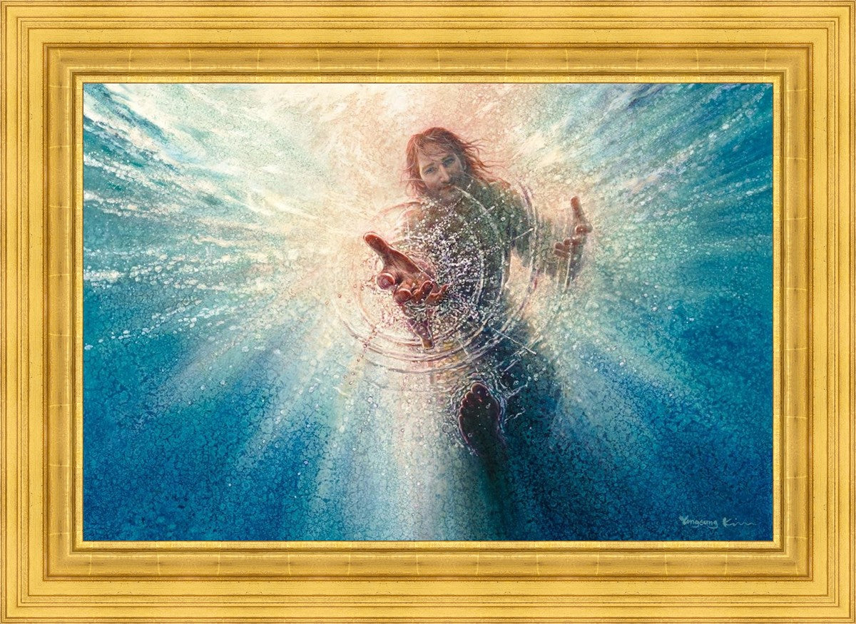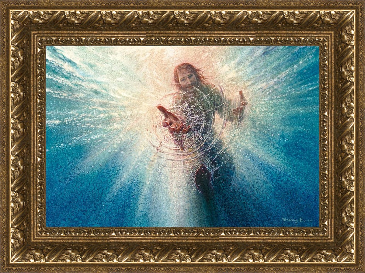 Yongsung Kim's 'His Mighty Hand' painting portrays the powerful scene of Jesus rescuing Peter from drowning.