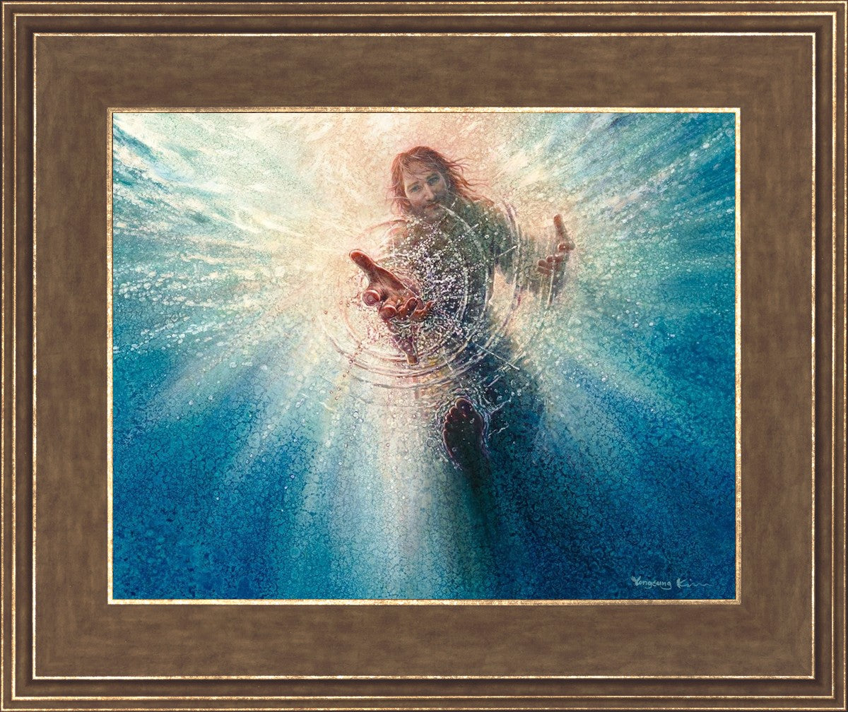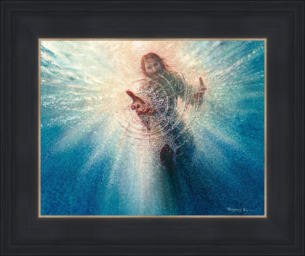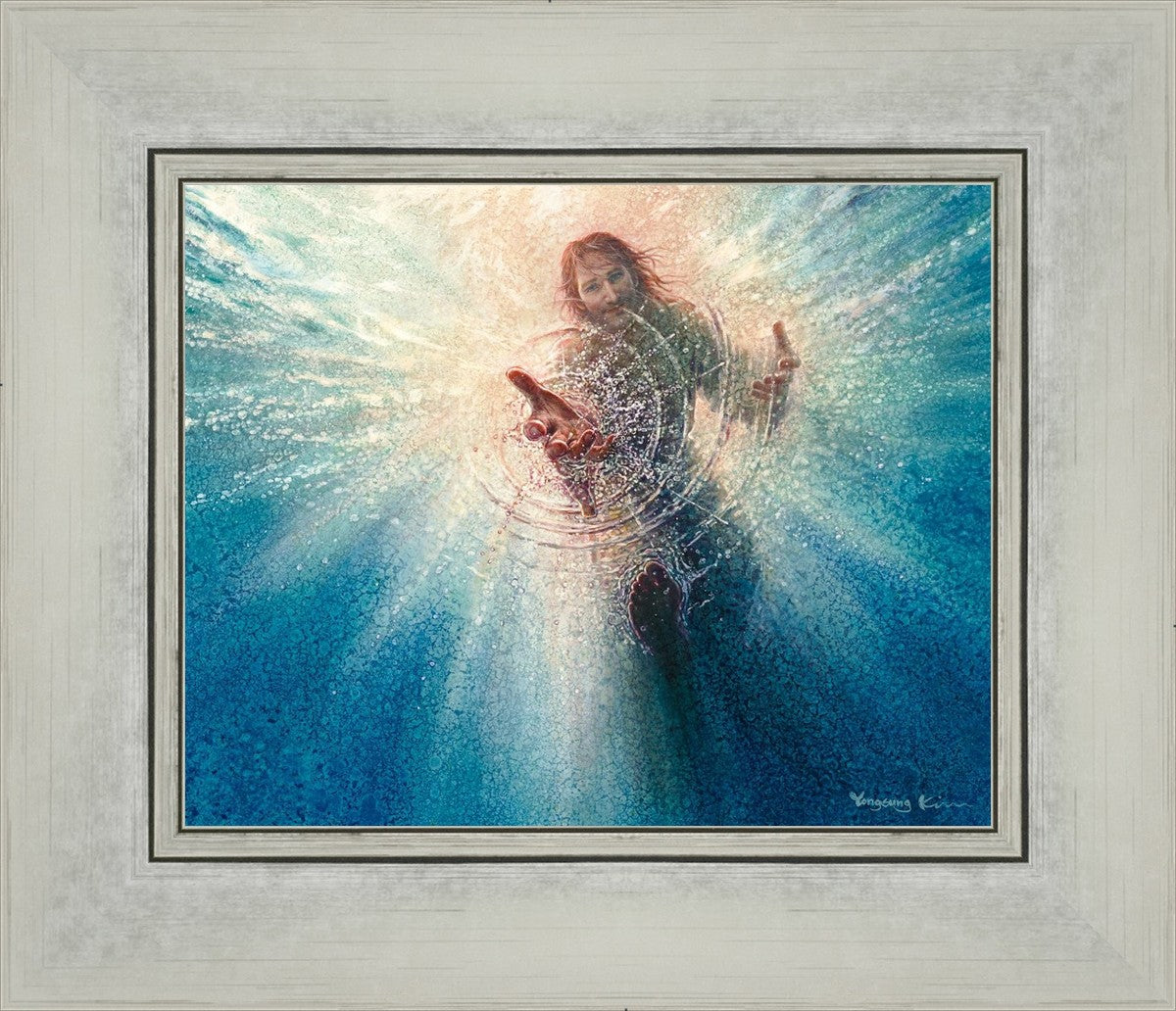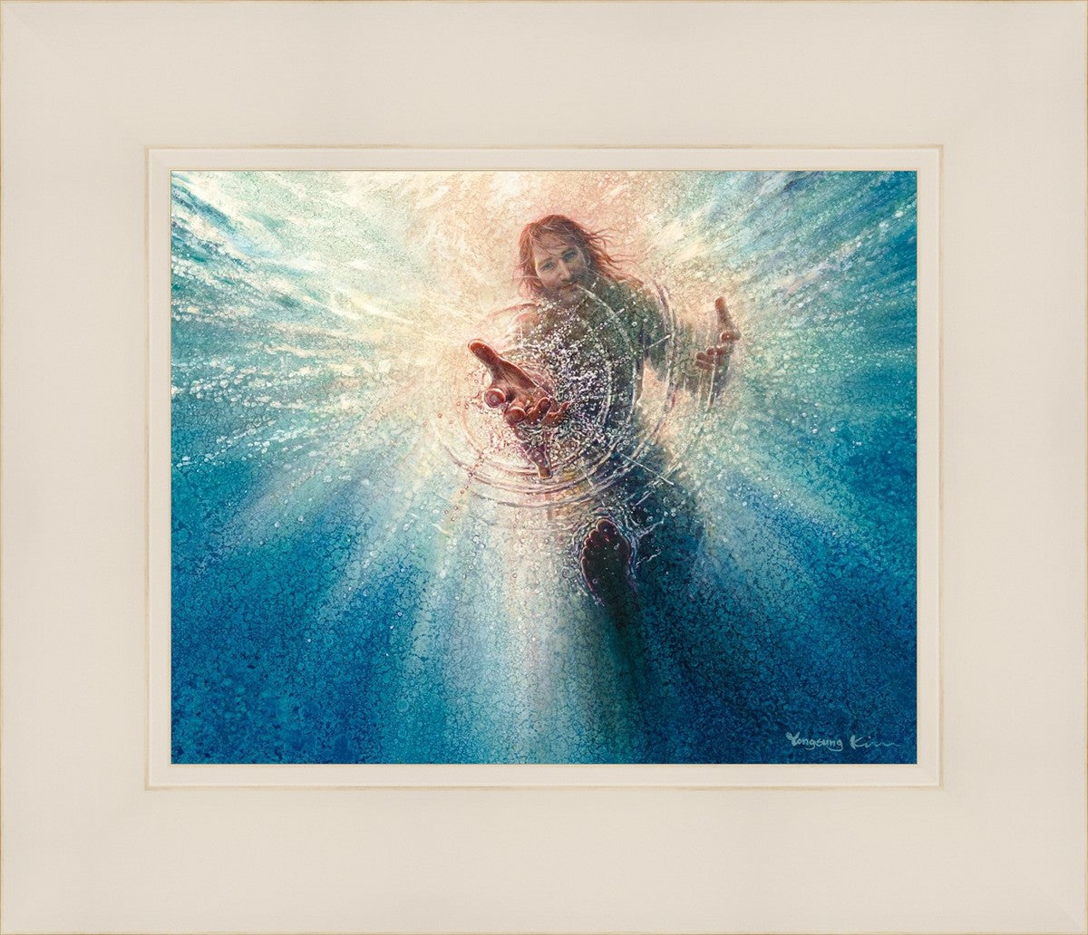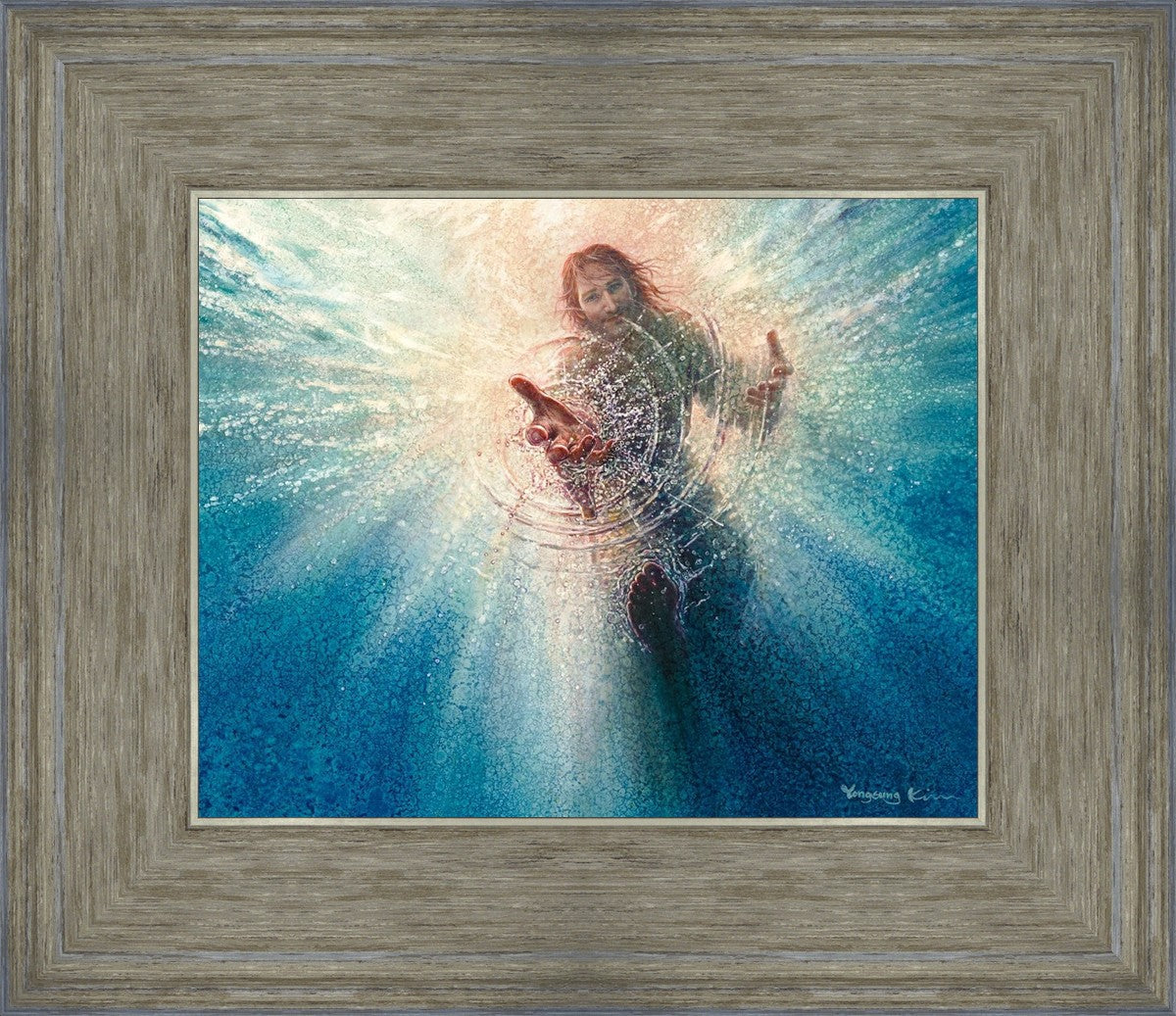Yongsung Kim's 'His Mighty Hand' painting portrays the powerful scene of Jesus rescuing Peter from drowning.