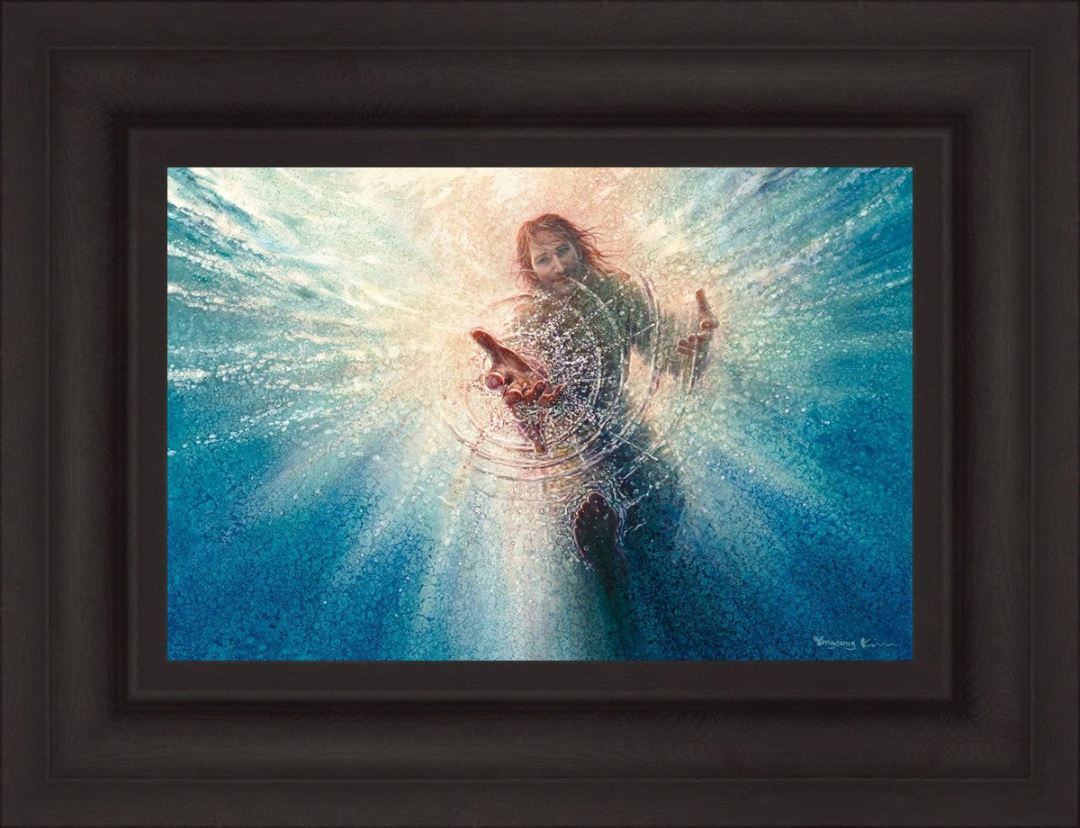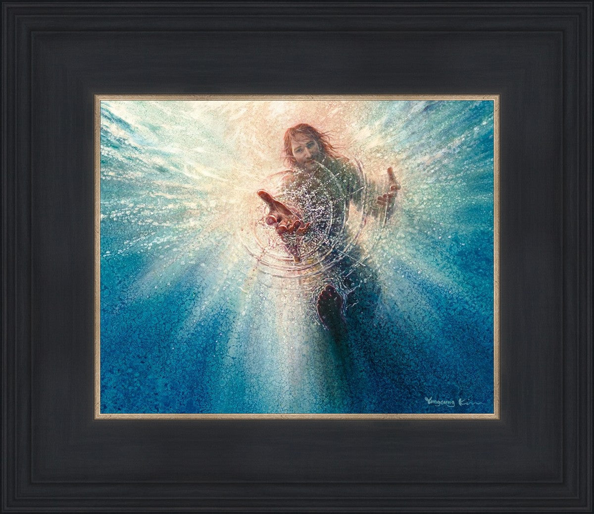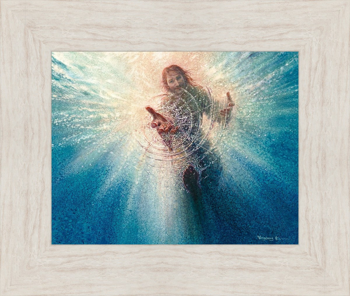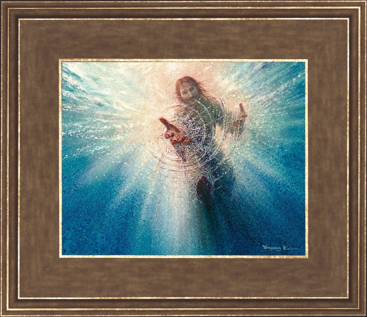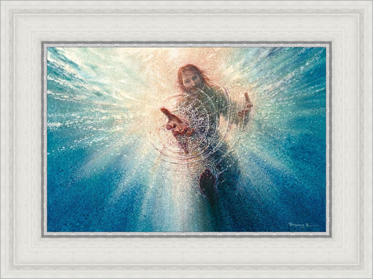 Yongsung Kim's 'His Mighty Hand' painting portrays the powerful scene of Jesus rescuing Peter from drowning.