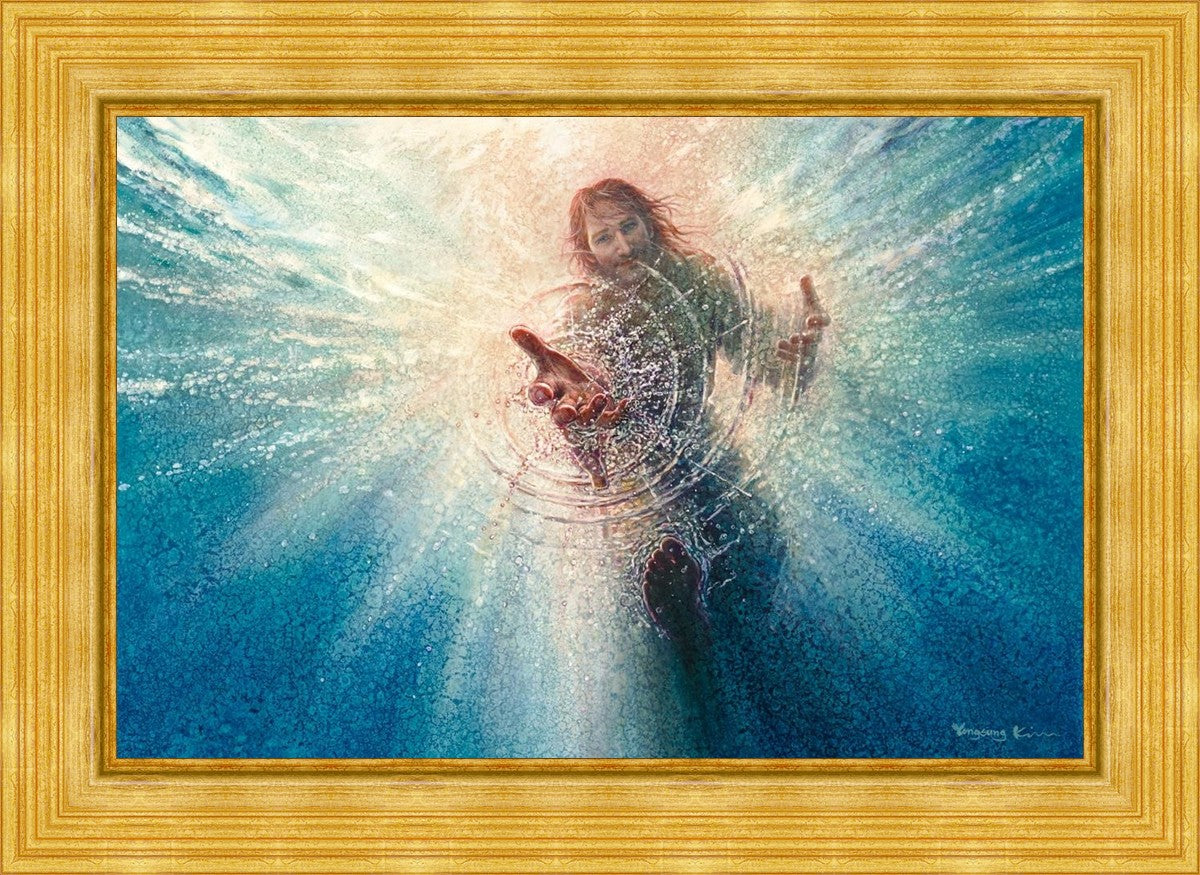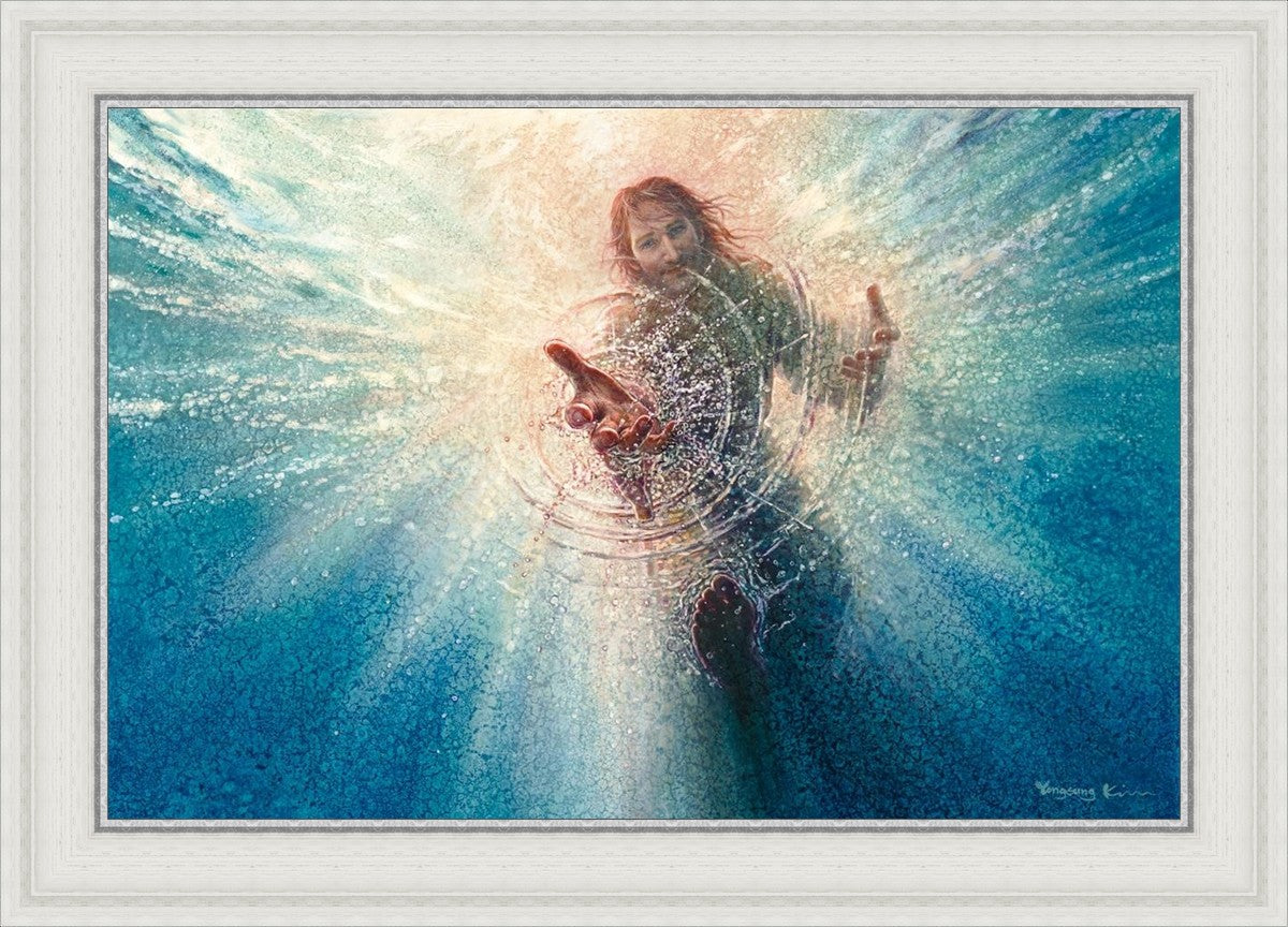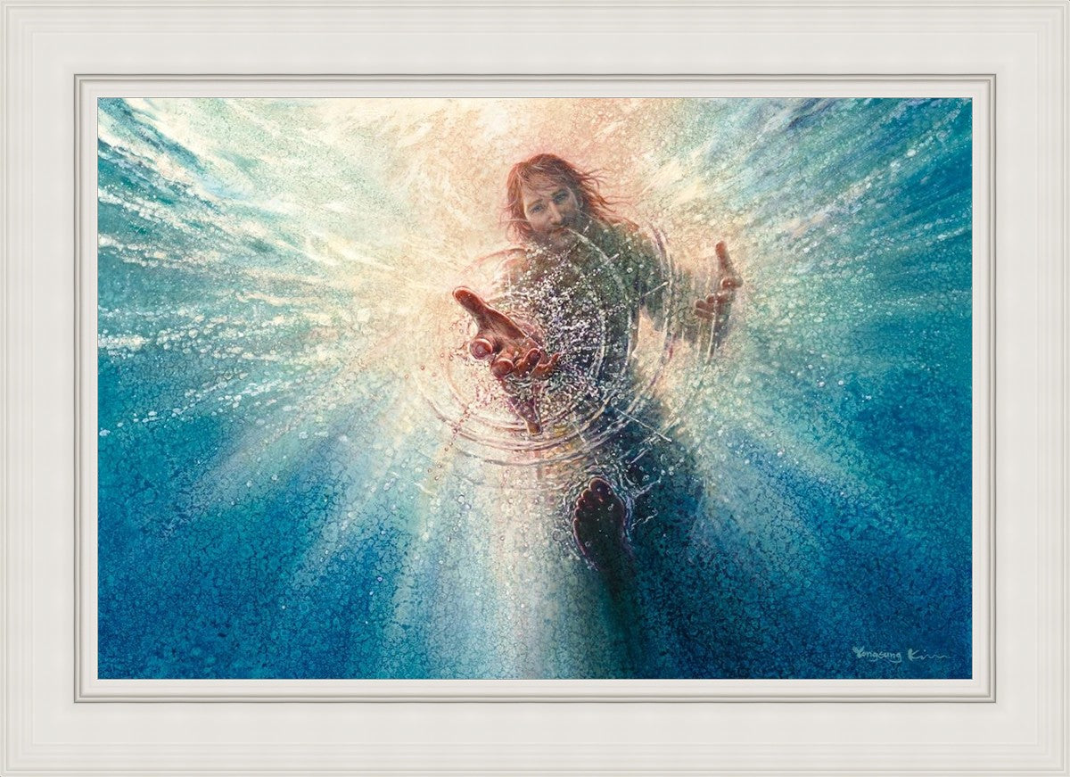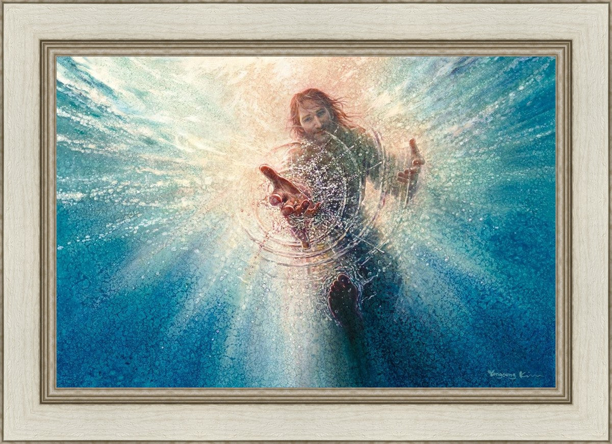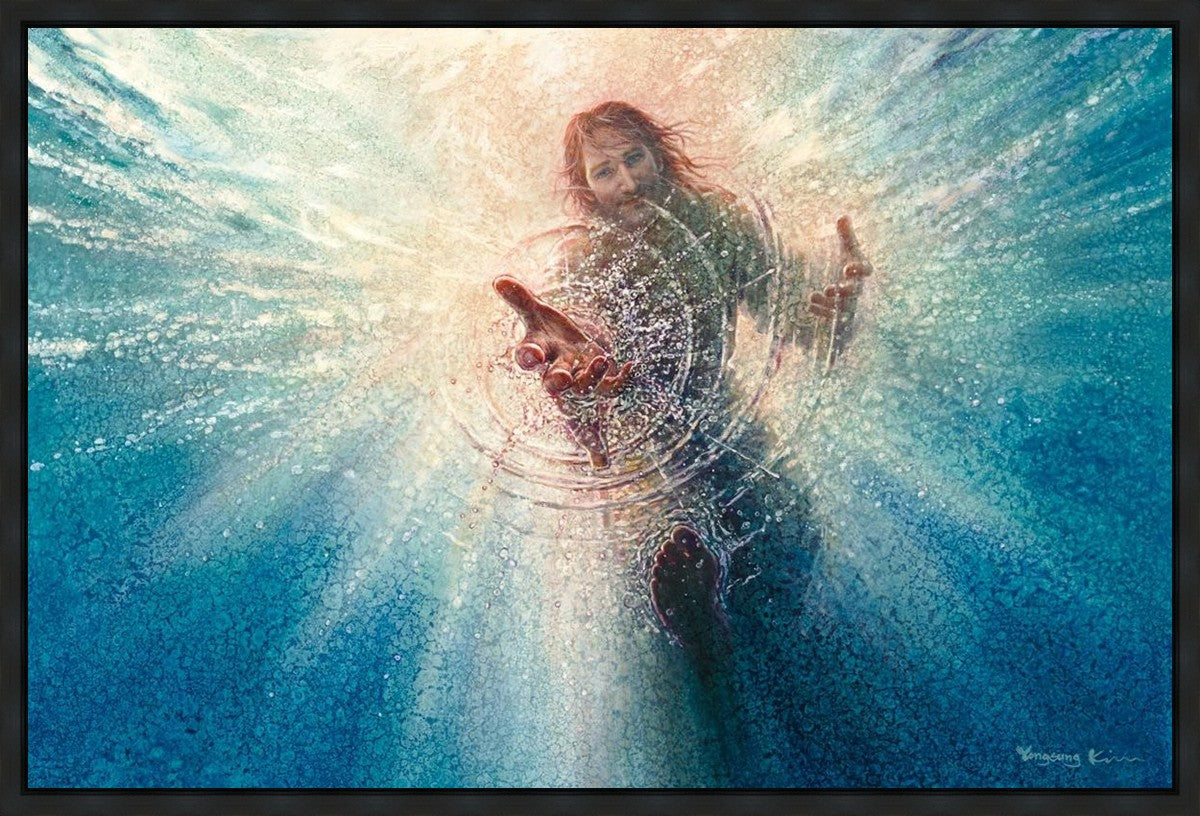 His Mighty Hand is a painting by Yongsung Kim. This painting depicts Jesus reaching down to save Peter from drowning.