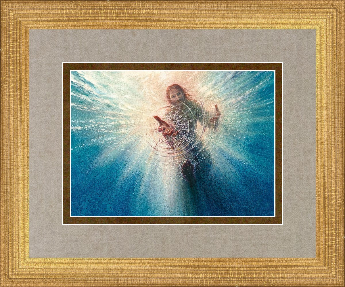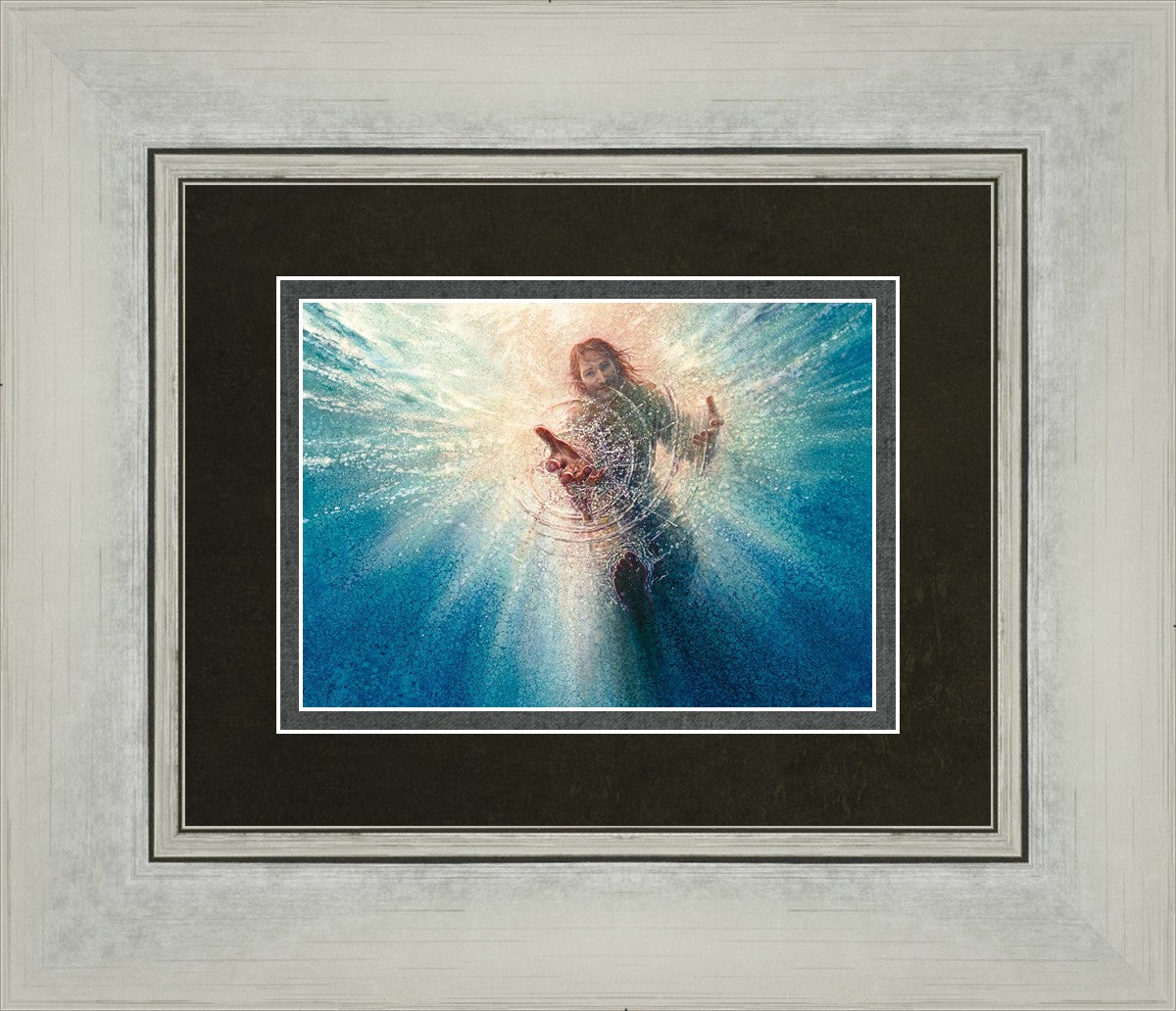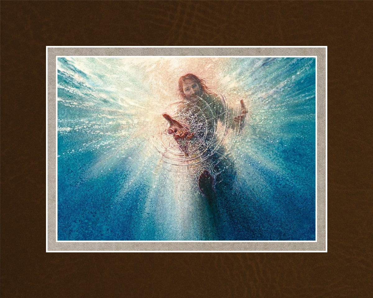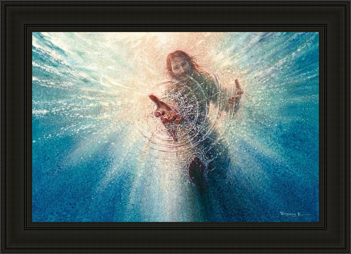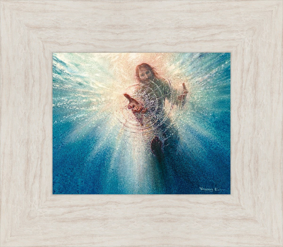 His Mighty Hand is a painting by Yongsung Kim. This painting depicts Jesus reaching down to save Peter from drowning.