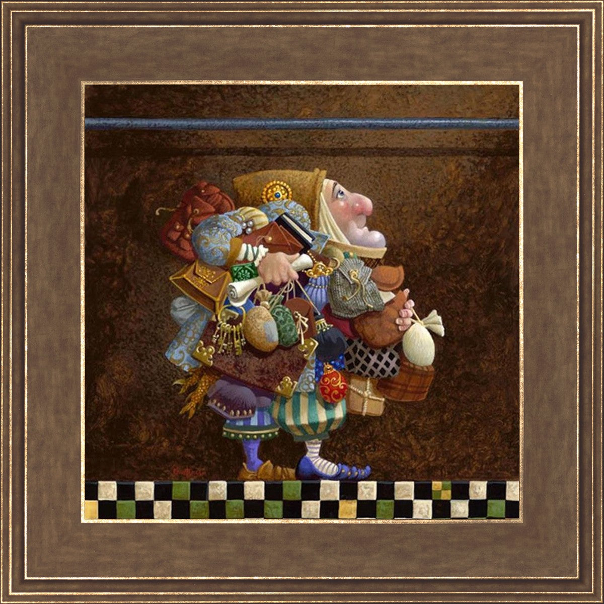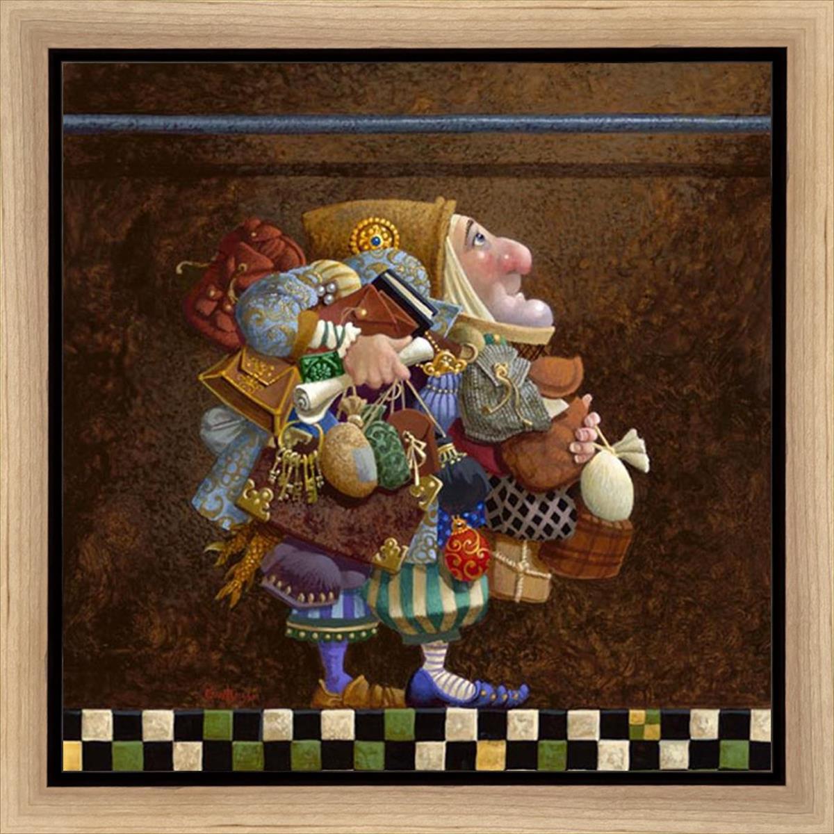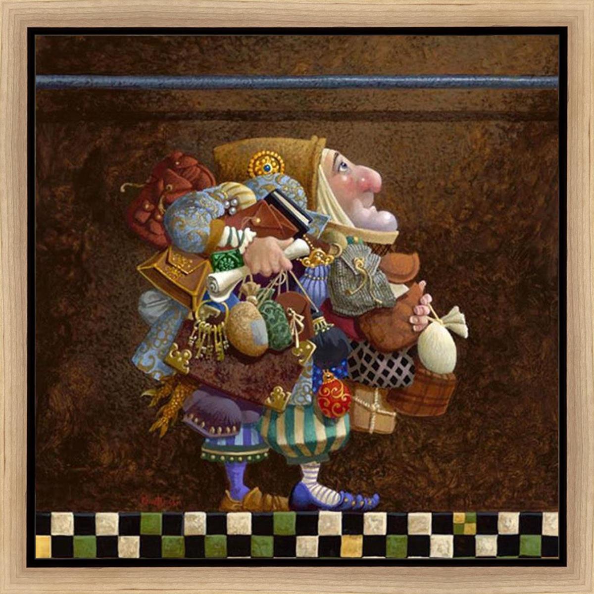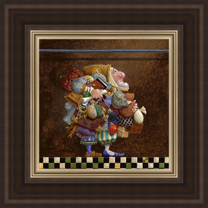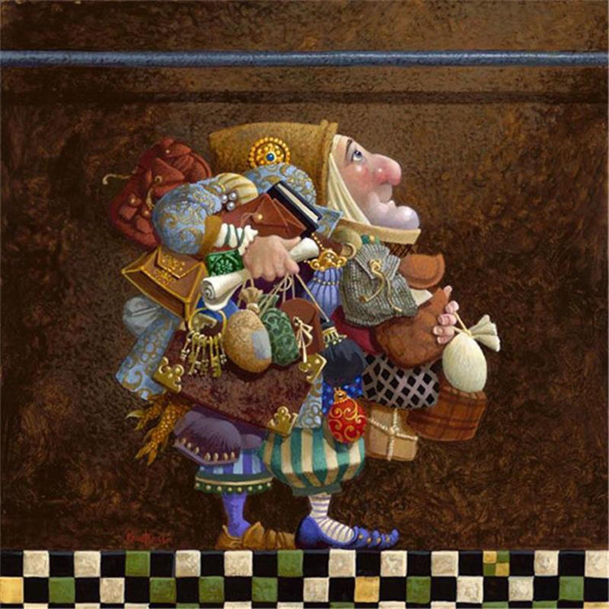 The character in "Hold to the Rod" finds himself so burdened with the mundane objects he has collected that, while he hopefully eyes the rod, he cannot reach up to hold it for fear of losing something else. The man has become little more than a vehicle for his adornments. He demonstrates that what is truly important is keeping sight of our true belief and faith, that they alone will guide us through.