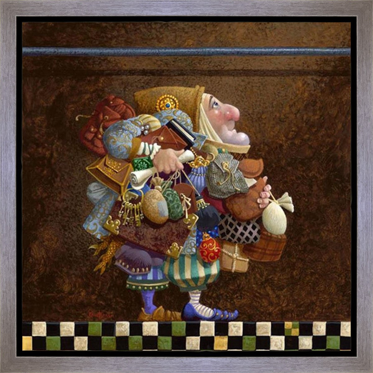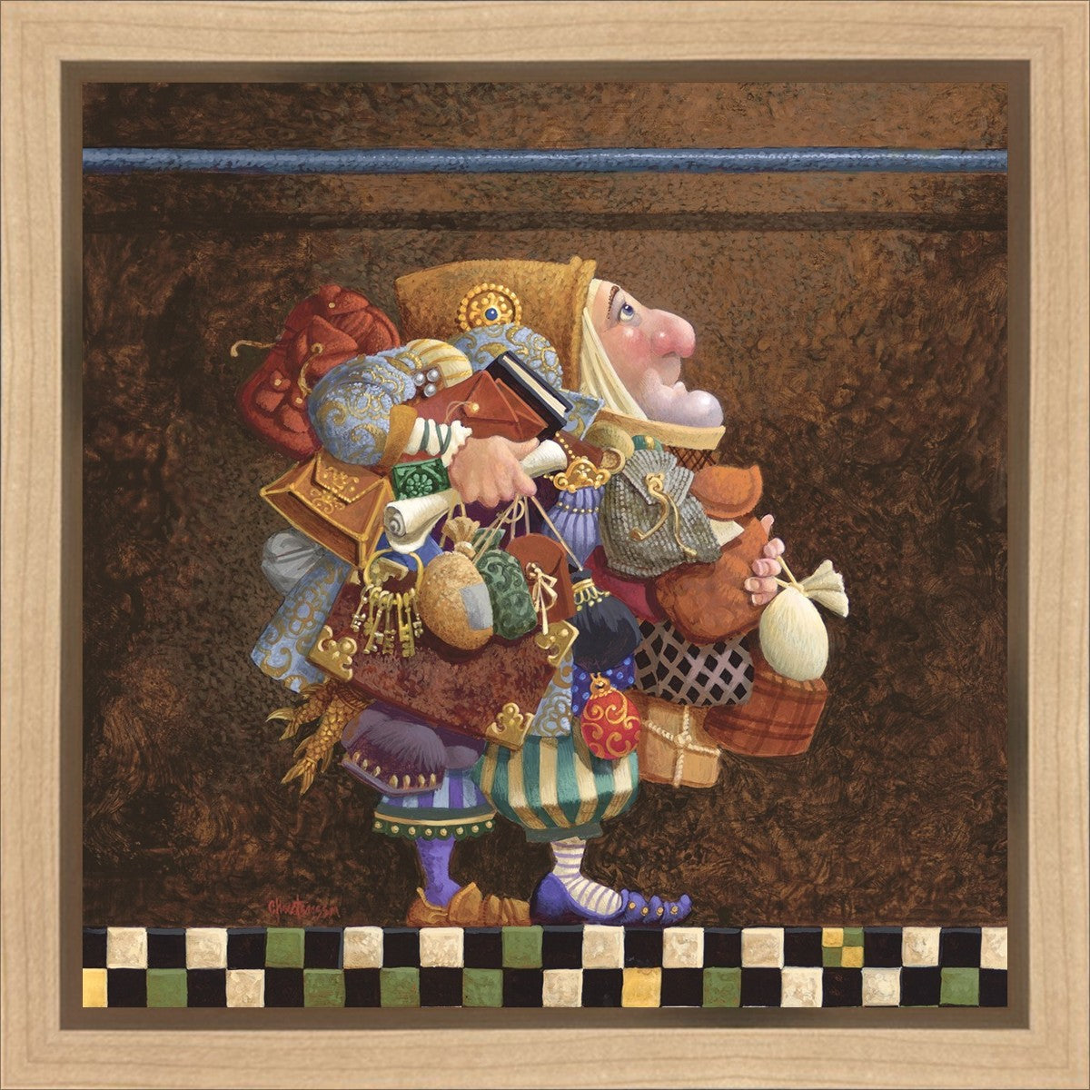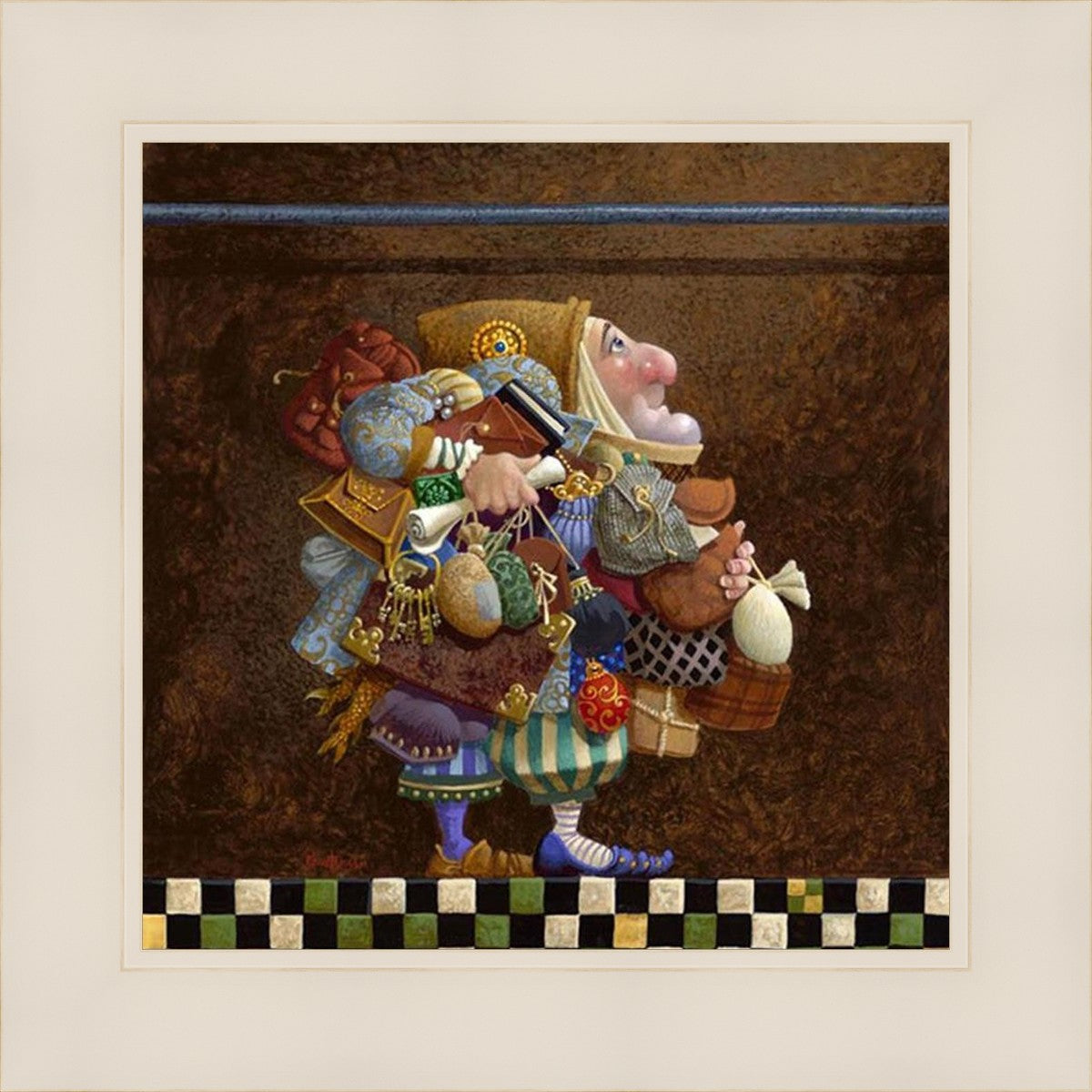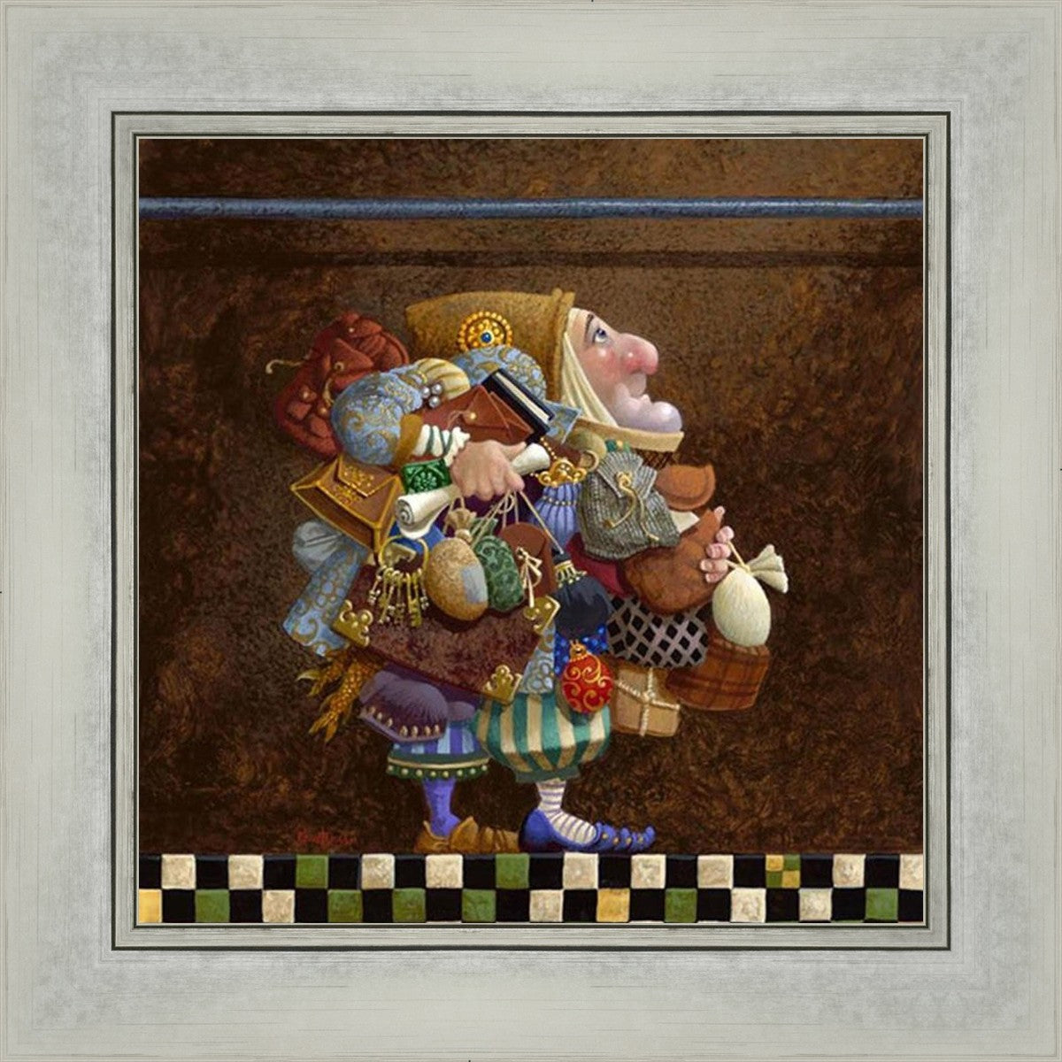 The character in "Hold to the Rod" finds himself so burdened with the mundane objects he has collected that, while he hopefully eyes the rod, he cannot reach up to hold it for fear of losing something else. The man has become little more than a vehicle for his adornments. He demonstrates that what is truly important is keeping sight of our true belief and faith, that they alone will guide us through.