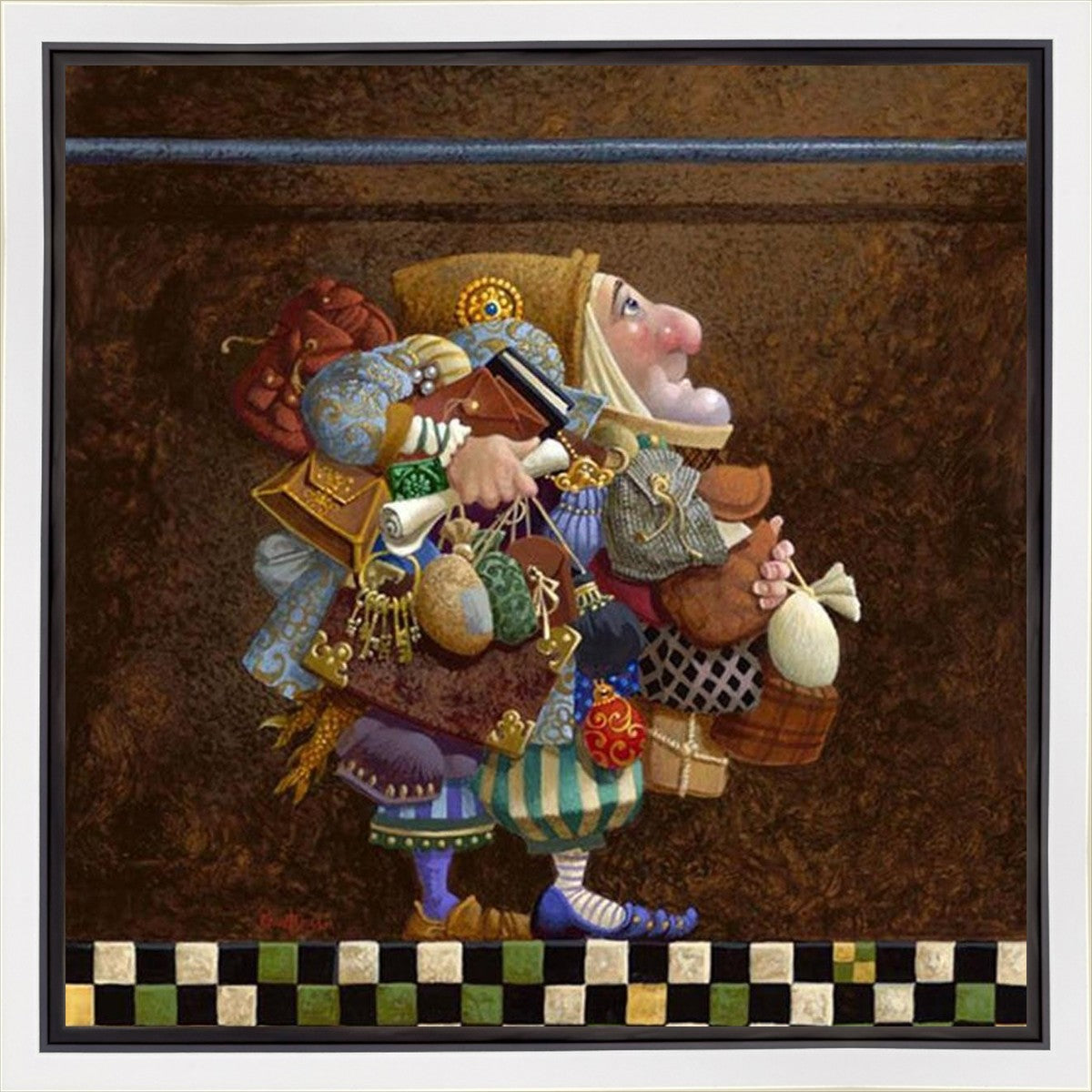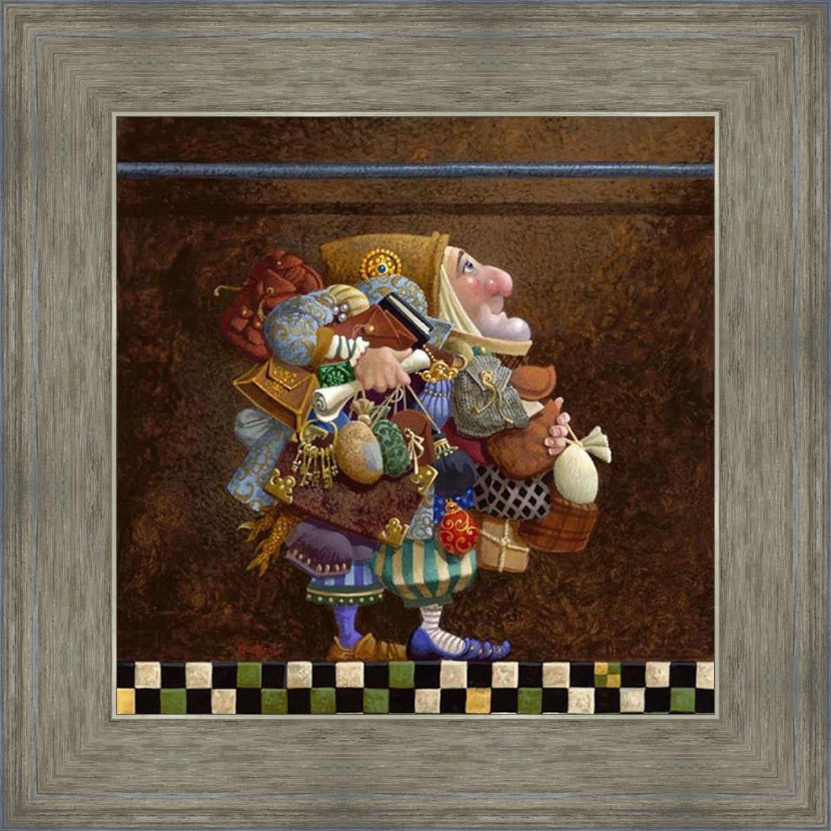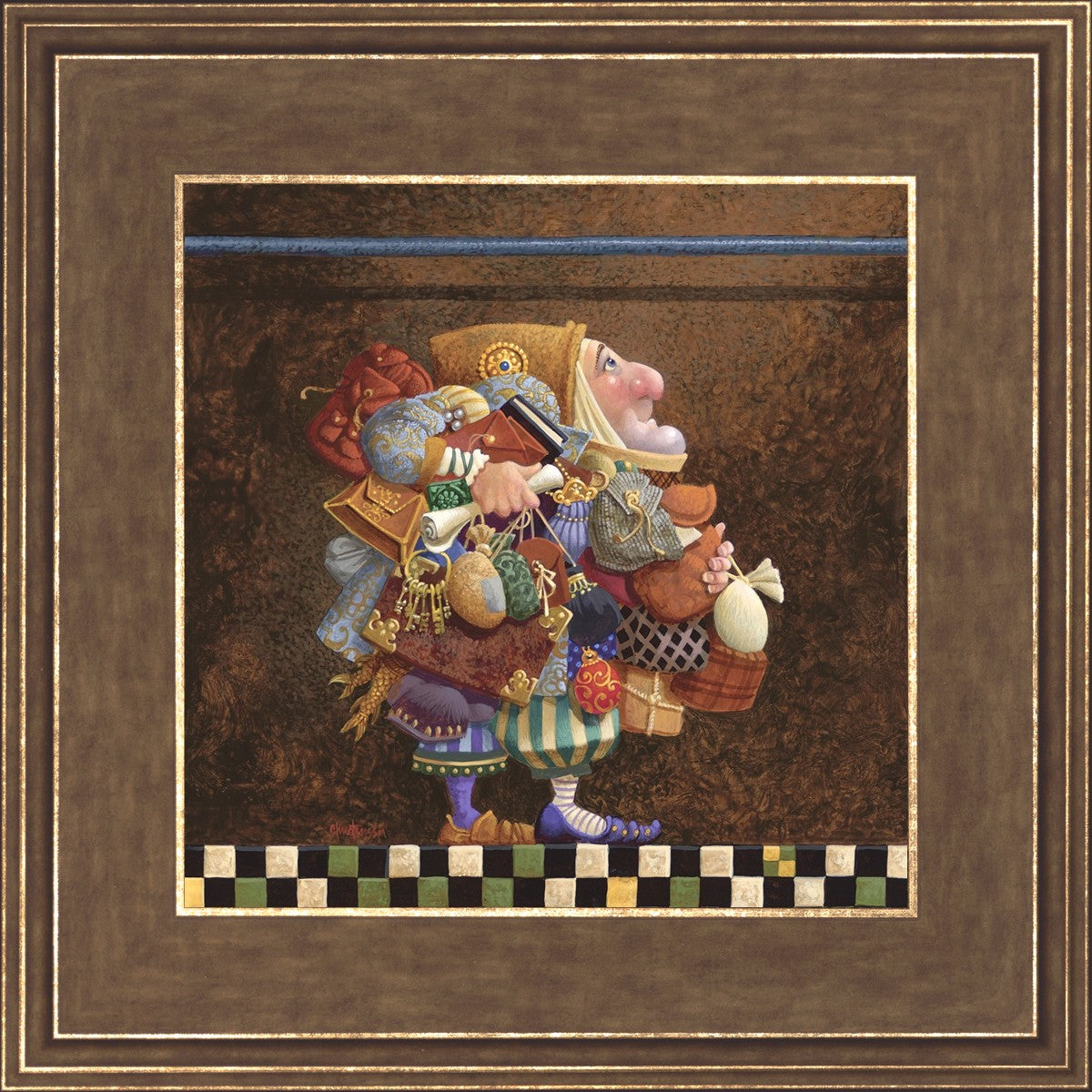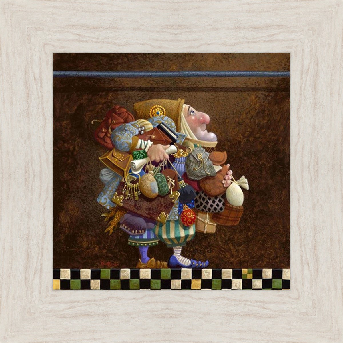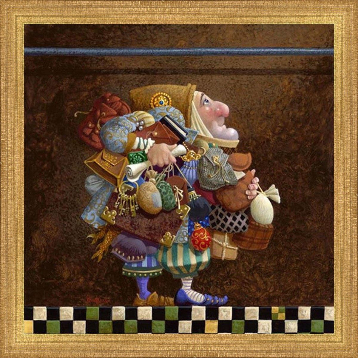 The character in "Hold to the Rod" finds himself so burdened with the mundane objects he has collected that, while he hopefully eyes the rod, he cannot reach up to hold it for fear of losing something else. The man has become little more than a vehicle for his adornments. He demonstrates that what is truly important is keeping sight of our true belief and faith, that they alone will guide us through.