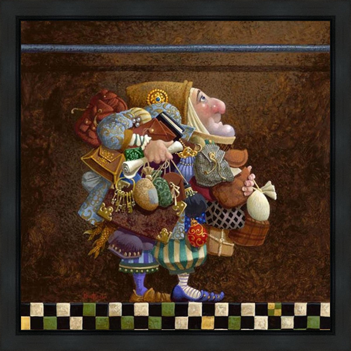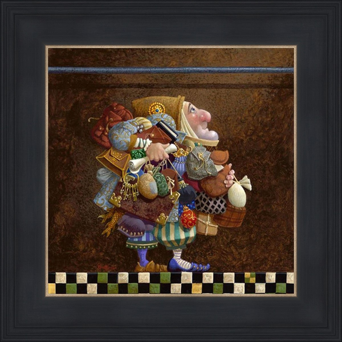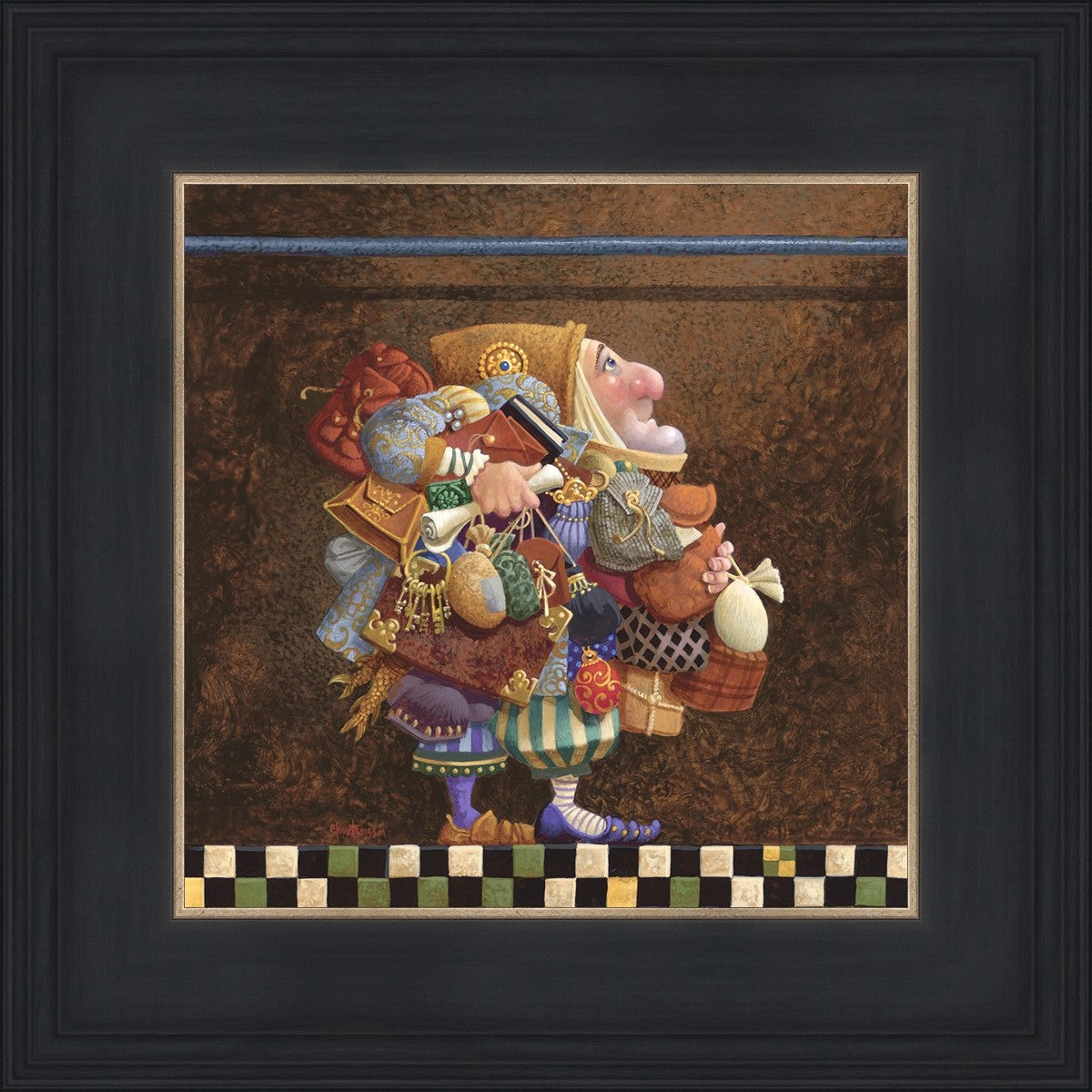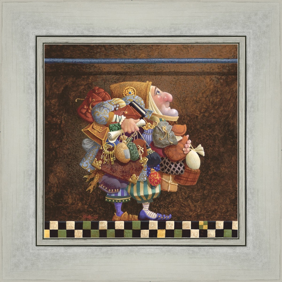 The character in "Hold to the Rod" finds himself so burdened with the mundane objects he has collected that, while he hopefully eyes the rod, he cannot reach up to hold it for fear of losing something else. The man has become little more than a vehicle for his adornments. He demonstrates that what is truly important is keeping sight of our true belief and faith, that they alone will guide us through.