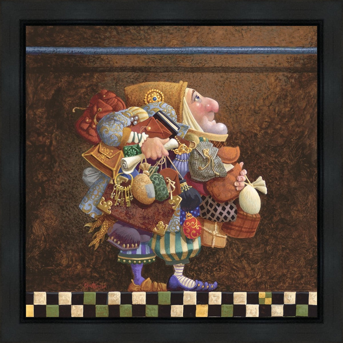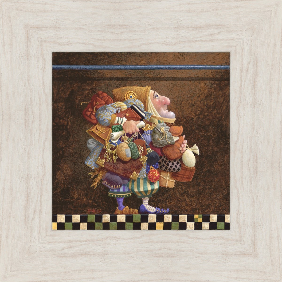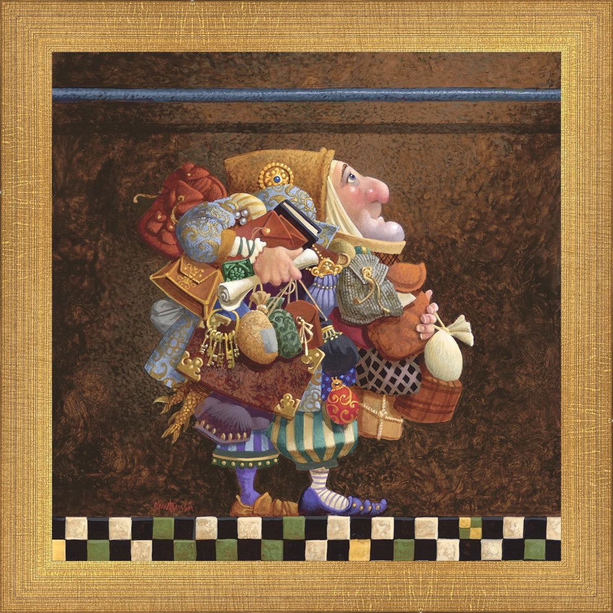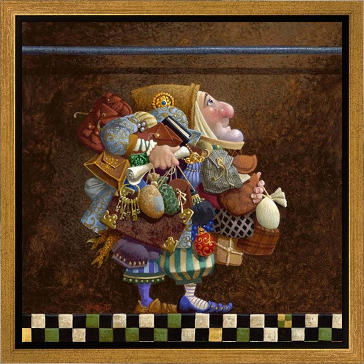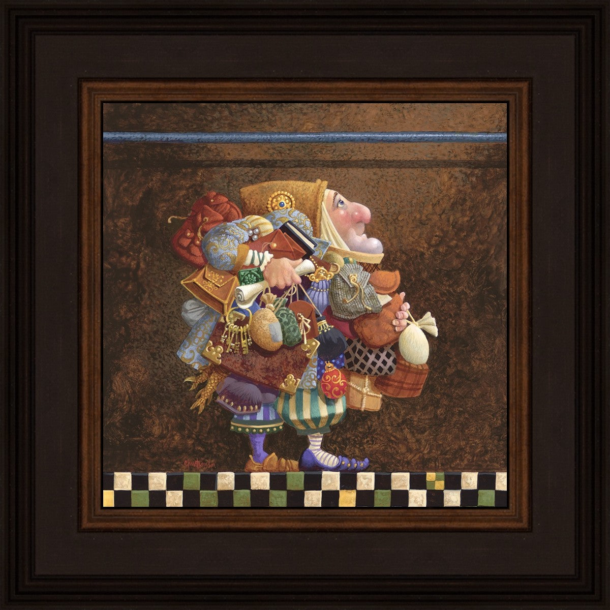 The character in "Hold to the Rod" finds himself so burdened with the mundane objects he has collected that, while he hopefully eyes the rod, he cannot reach up to hold it for fear of losing something else. The man has become little more than a vehicle for his adornments. He demonstrates that what is truly important is keeping sight of our true belief and faith, that they alone will guide us through.